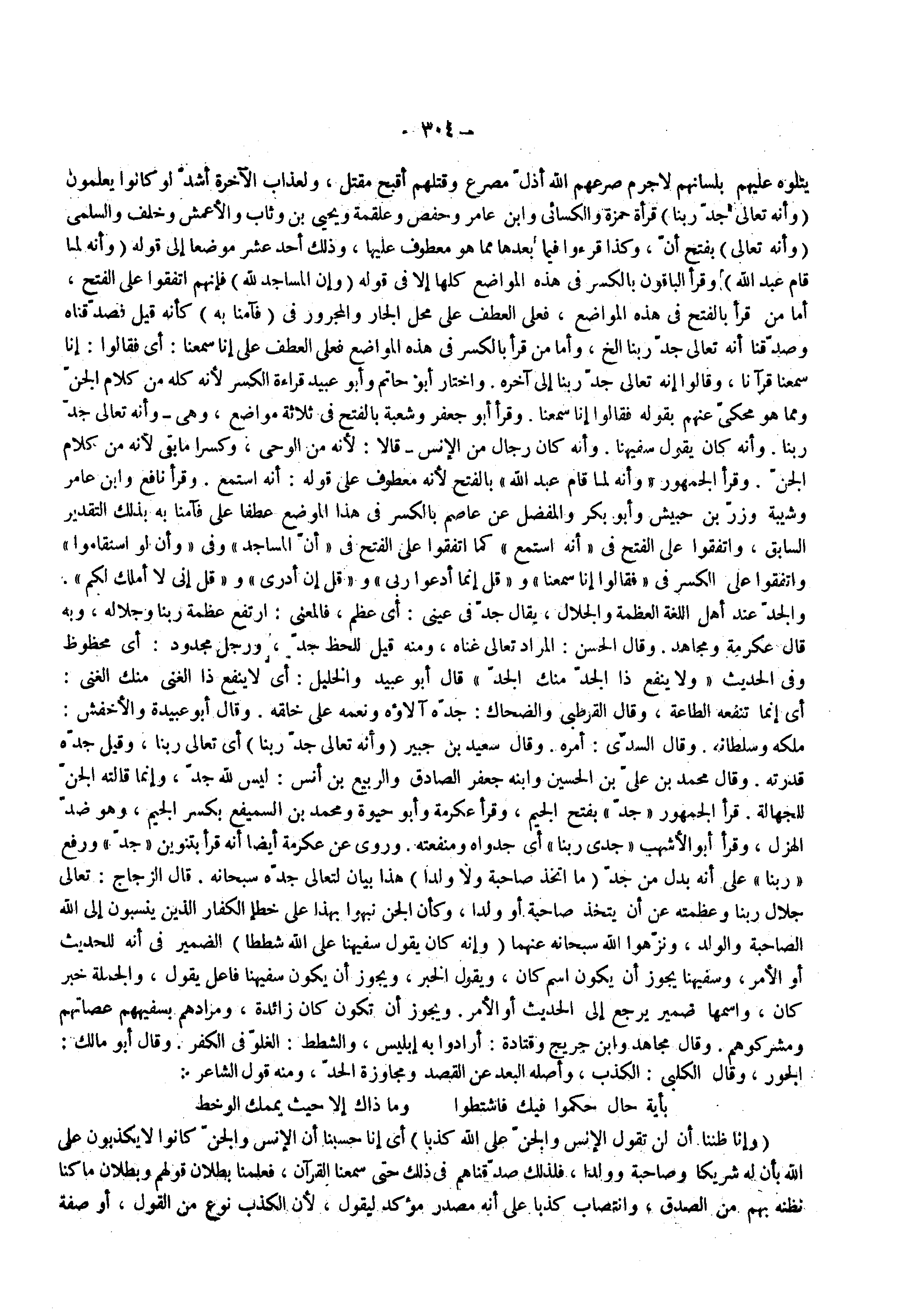 ( وأنه تعالى جد ربنا ) قرأه حمزة والكسائي وأبن عامر وحفص وعلقمة ويحيى بن وثاب والأعمش وخلف والسلمي ( وأنه تعالى ) بفتح أن وكذا قرؤوا فيما بعدها مما هو معطوف عليها وذلك أحد عشر موضعا إلى قوله ( وأنه لما قام عبد الله ) وقرأ الباقون بالكسر في هذه المواضع كلها إلا في قوله ( وإن المساجد لله ) فإنهم اتفقوا على الفتح أما من قرأ بالفتح في هذه المواضع فعلى العطف على محل الجار والمجرور في ( فآمنا به ) كأنه قيل فصدقناه وصدقنا أنه تعالى جد ربنا الخ وأما من قرأ بالكسر في هذه المواضع فعلى العطف على إنا سمعنا أي فقالوا إنا سمعنا قرآنا وقالوا أنه تعالى جد ربنا إلى آخره واختار أبو حاتم وأبو عبيد قراءة الكسر لأنه كله من كلام الجن ومما هو محكي عنهم بقوله فقالوا إنما سمعنا وقرأ أبو جعفر وشعبة بالفتح في ثلاثة مواضع وهي وأنه تعالى جد ربنا أنه كان يقول سفيهنا وانه كان رجال من الإنس قالا لأنه من الوحي وكسرا ما بقي لأنه من كلام الجن وقرأ الجمهور وانه لما قام عبد الله بالفتح لأنه معطوف على قوله أنه استمع وقرا نافع وأبن عامر وشيبة وزر بن حبيش وأبو بكر والمفضل عن عاصم بالكسر في هذا الموضع عطفا على فآمنا به بذلك التقرير السابق واتفقوا على الفتح في أنه استمع كما اتفقوا على الفتح في أن المساجد وفي وأن لو استقاموا واتفقوا على الكسر في فقالوا إنا سمعنا و قل إنما أدعوا ربي وقل إن أدرى و قل إني لا أملك لكم والجد عند أهل اللغة العظمة والجلال يقال جد في عيني أي عظم فالمعنى ارتفع عظمة ربنا وجلاله وبه قال عكرمة ومجاهد وقال الحسن المراد تعالى غناه ومنه قيل للحظ جد ورجل مجدود أي محظوظ وفي الحديث ولا تنفع ذا الجد منك الجد قال أبو عبيد والخليل أي لا ينفع ذا الغنى منك الغنى أي إنما تنفعه الطاعة وقال القرطبي والضحاك جده آلاؤه ونعمة على خلقه وقال أبو عبيدة والأخفش ملكه وسلطانه وقال السدي أمره وقال سعيد بن جبير ( وأنه تعالى جد ربنا ) أي تعالى ربنا وقيل جده قدرته وقال محمد بن علي بن الحسين وأبنه جعفر الصادق والربيع بن انس ليس لله جد وإنما قالته الجن للجهالة قرأ الجمهور جد بفتح الجيم وقرأ عكرمة وأبو حيوة ومحمد بن السميفع بكسر الجيم وهو ضد الهزل وقرأ أبو الأشهب جدى ربنا أي جدواه ومنفعته وروى عن عكرمة أيضا أنه قرا بتنوين جد ورفع ربنا على انه بدل من جد ( ما أتخذ صاحبة ولا ولدا ) هذا بيان لتعالي جده سبحانه قال الزجاج تعالى جلال ربنا وعظمته عن أن يتخذ صاحبه أو ولدا وكأن الجن نبهوا بهذا على خطأ الكفار الذين ينسبون إلى الله الصاحبة والولد ونزهوا الله سبحانه عنهما