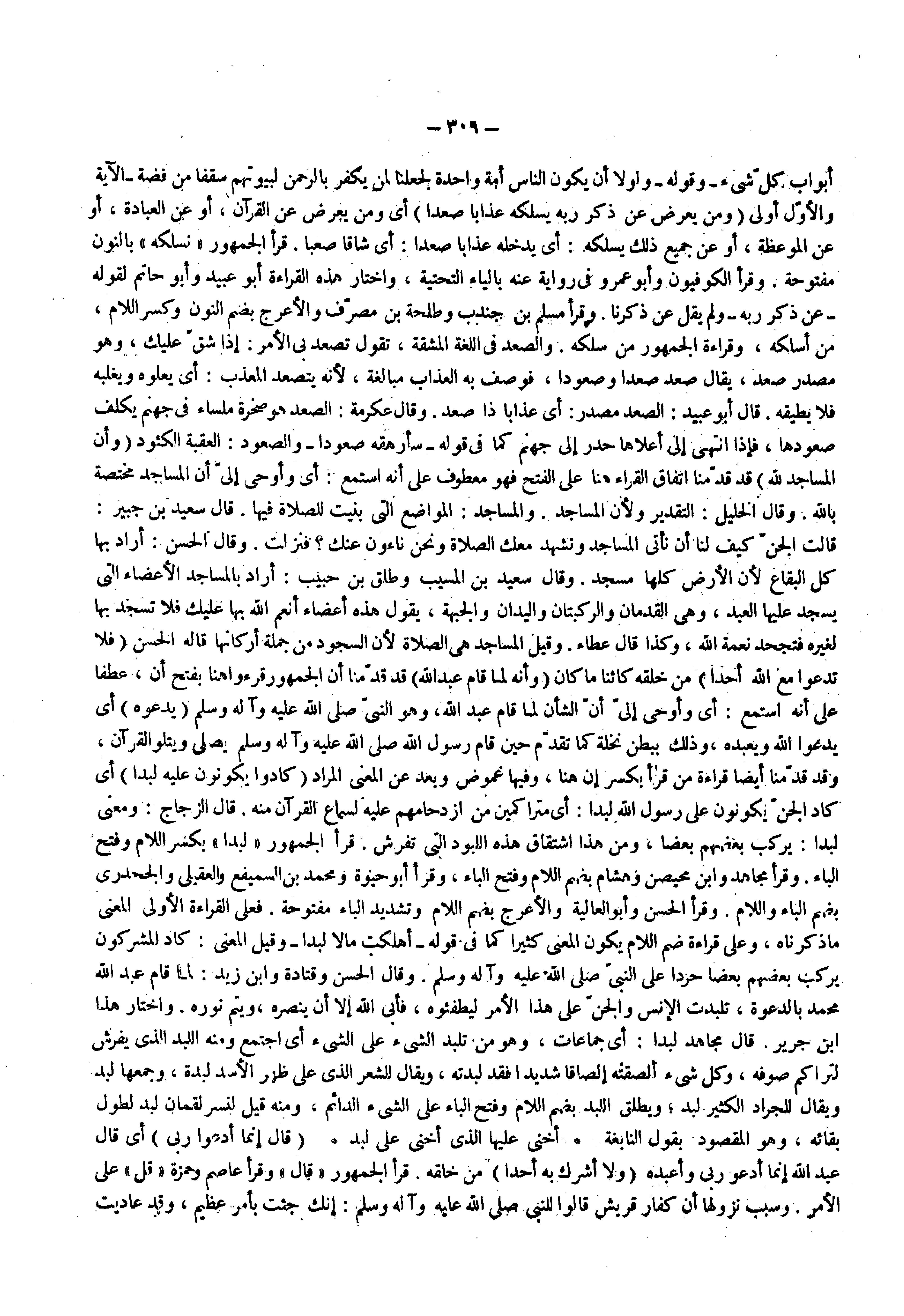 أبواب كل شيء وقوله ولولا أن يكون الناس أمة واحدة لجعلنا لمن يكفر بالرحمن لبيوتهم سقفا من فضة الآية والأول اولى ( ومن يعرض عن ذكر ربه يسلكه عذابا صعدا ) أي ومن يعرض عن القرآن أو عن العبادة أو عن الموعظة أو عن جميع ذلك يسلكه أي يدخله عذابا صعدا أي شاقا صعبا قرا الجمهور نسلكه بالنون مفتوحة وقرأ الكوفيون وأبو عمرو في رواية عنه بالباء التحتية واختار هذه القراءة أبو عبيد وأبو حاتم لقوله عن ذكر ربه ولم يقل عن ذكرنا وقرأ مسلم بن جندب وطلحة بن مصرف والأعرج بضم النون وكسر اللام من أسلكه وقراءه الجمهور من سلكه والصعد في اللغة المشقة تقول تصعد بي الأمر إذا شق عليك وهو مصدر صعد يقال صعد صعدا وصعودا فوصف به العذاب مبالغة لأنه يتصعد المعذب أي يعلوه ويغلبه فلا يطيقه قال أبو عبيد الصعد مصدر أي عذابا ذا صعد وقال تكرمة الصعد هو صخرة ملساء في جهنم يكلف صعودها فإذا انتهى إلى أعلاها حدر إلى جهنم كما في قوله سأرهقه صعودا والصعود العقبة الكئود