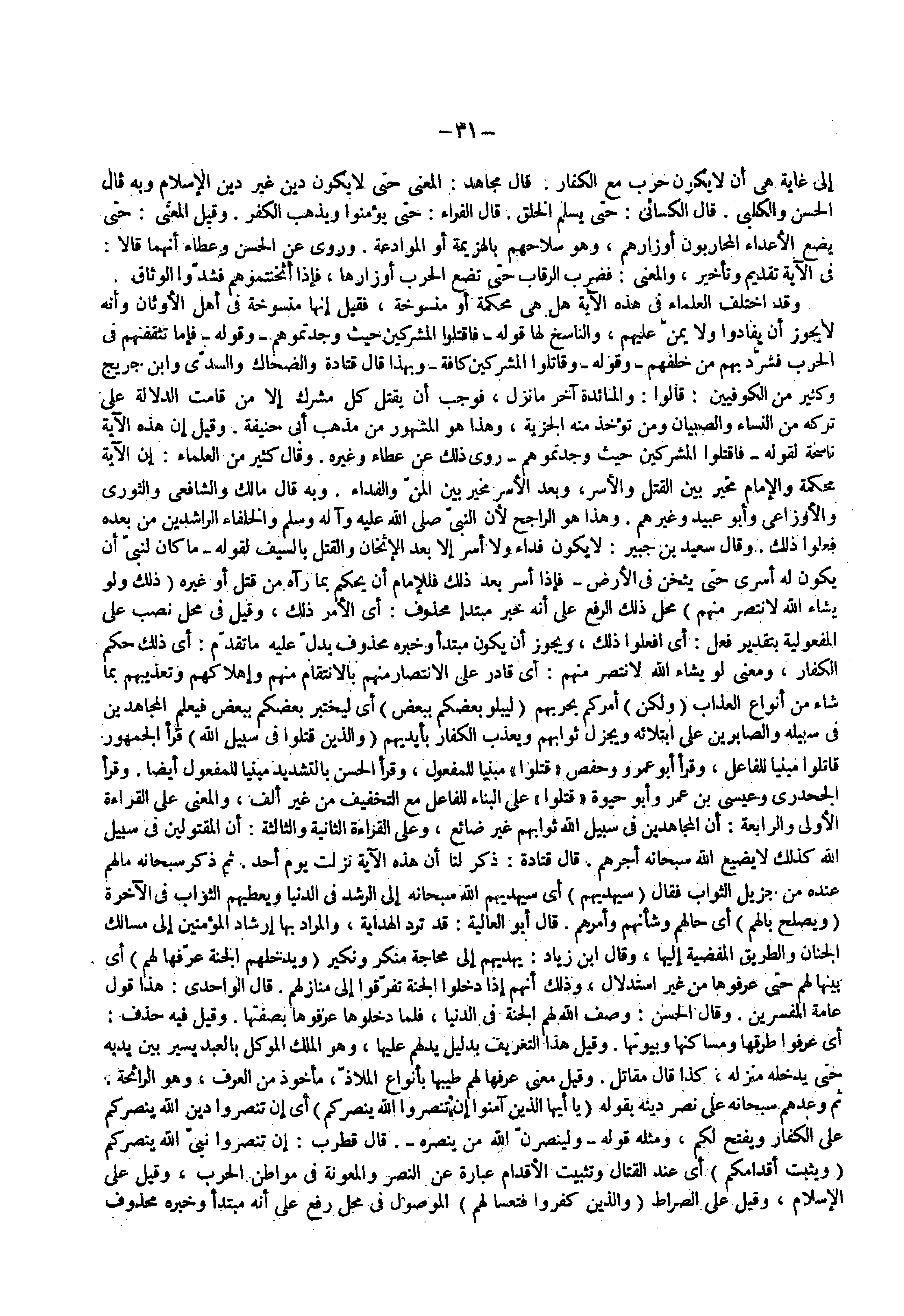 إلى غاية صي أن لا يكون حرب مع الكفار قال مجاهد المعنى حتى لا يكون دين غير دين الإسلام وبه قال الحسن والكلبي قال الكسائى حتى يسلم الخلق قال الفراء حتى يؤمنوا ويذهب الكفر وقيل المعنى حتى يضع الأعداء المحاربون أوزارهم وهو سلاحهم بالهزيمة أو الموادعة وروى عن الحسن وعطاء أنهما قالا في الآية تقديم وتأخير والمعنى فضرب الرقاب حتى تضع الحرب أوزارها فإذا أثخنتموهم فشد الوثاق وقد اختلف العلماء في هذه الآية هل هي محكمة أو منسوخة فقيل إنها منسوخة في أهل الأوثان وأنه لا يجوز أن يفادوا ولا يمن عليهم والناسخ لها قوله فاقتلوا المشركين حيث وجدتموهم وقوله فإما تثقفنهم في الحرب فشرد بهم من خلفهم وقوله قاتلوا المشركين كافة وبهذا قال قتادة والضحاك والسدى وابن جريح وكثير من الكوفيين قالوا والمائدة آخر ما نزل فوجب أن يقتل كل مشرك إلا من قامت الدلالة على تركه من النساء والصبيان ومن تؤخذ منه الجزية وهذا هو المشهور من مذهب أبي حنيفة وقيل إن هذه الآية ناسخة لقوله فاقتلوا المشركين حيث وجدتموهم وروى ذلك عطاء وغيره وقال كثير من العلماء إن الآية محكمة والإمام مخير بين القتل والأسر وبعد الأسر مخير بين المن والفداء وبه قال مالك والشافعي والثوري والأوزاعي وأبو عبيد وغيرهم وهذا هو الراجح لأن النبي ( صلى الله عليه وسلم ) والخلفاء الراشدين من بعده فعلوا ذلك وقال سعيد بن جبير لا يكون فداء ولا أسر إلا بعد الأثخان والقتل بالسيف لقوله ما كان لنبي أن يكون له أسرى حتى يثخن في الأرض فإذا أسر بعد ذلك فللإمام أن يحكم بما رآه من قتل أو غيره ( ذلك ولو يشاء الله لانتصر منهم ) محل ذلك الرفع على أنه خبر مبتدأ محذوف أي الأمر ذلك وقيل في محل نصب على المفعولية بتقدير فعل أي أفعلو ذلك ويجوز أن يكون مبتدأ وخبره محذوف يدل عليه ما تقدم أي ذلك حكم الكفار ومعنى لو يشاء الله لانتصر منهم أي قادر على الانتصار منهم بالانتقام منهم وإهلاكهم وتعذيبهم شاء من أنواع العذاب ( ولكن ) أمركم بحربهم ( ليبلوا بعضكم ببعض ) أي ليختبر بعضكم ببعض فيعلم المجاهدين في سبيله والصابرين على إبتلائه ويجزل ثوابهم ويعذب الكفار بأيديهم ( والذين قتلوا في سبيل الله ) قرأ الجمهور قاتلوا مبنيا للفاعل وقرأ أبو عمرو وحفص قتلوا مبنيا للمفعول وقرأ الحسن بالتشديد مبنيا للمفعول أيضا وقرأ الجحدري وعيسى بن عمر وأبو حيوة قتلوا على البناء للفاعل مع التخفيف من غير ألف والمعنى على القراءة الأولى والرابعة أن المجاهدين في سبيل الله ثوابهم غير ضائع وعلى القراءة الثانية والثالثة أن المقتولين في سبيل الله كذلك لا يضيع الله سبحانه أجرهم قال قتادة ذكر لنا أن هذه الآية نزلت يوم أحد