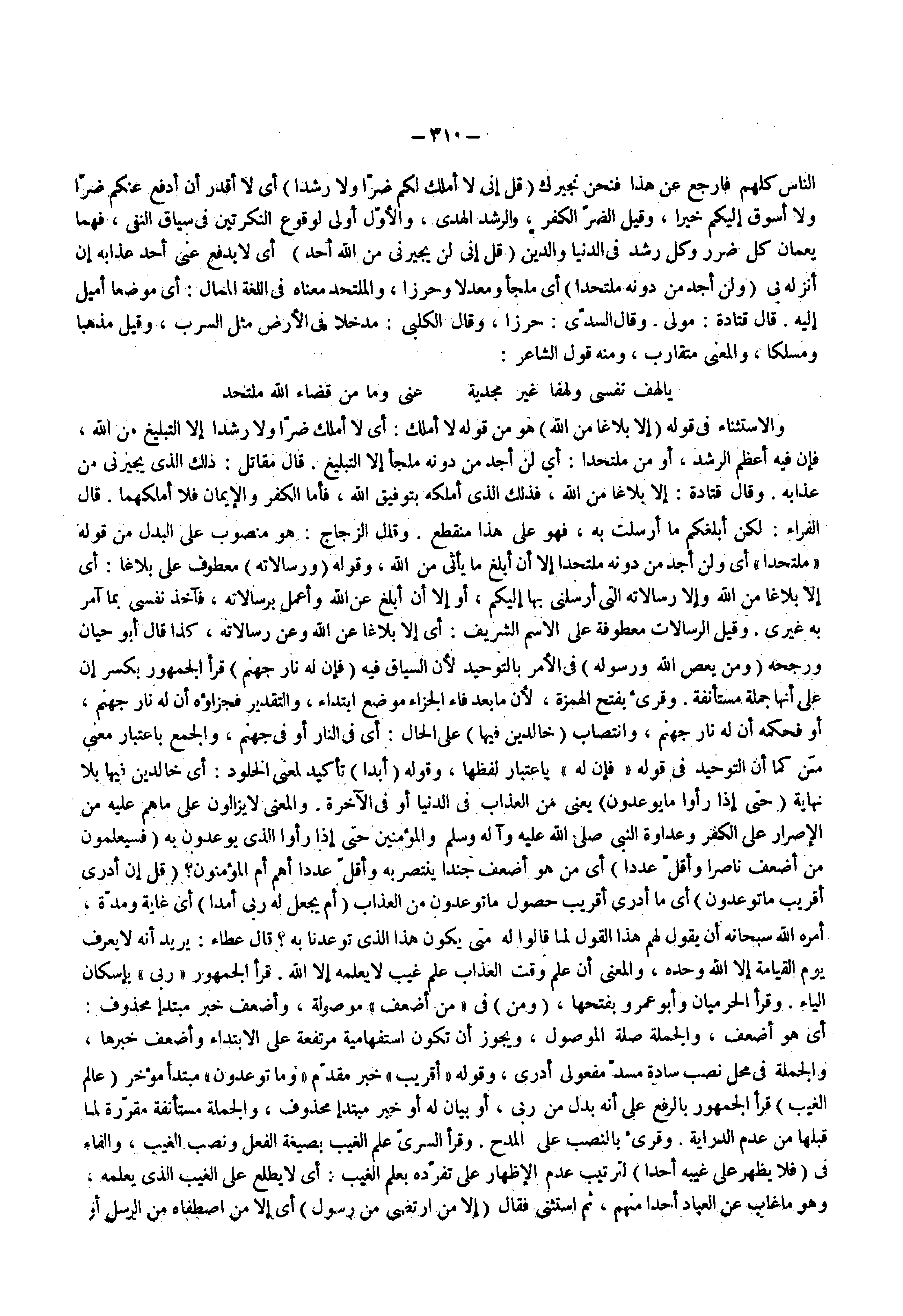 والاستثناء في قوله 0 إلا بلاغا من الله ) هو من قوله لا أملك أي لا أملك ضرا ولا رشدا إلا التبليغ من الله فإن فيه أعظم الرشد أو من ملتحدا أي لن أجد من دونه ملجأ ألا التبليغ قال مقاتل ذلك الذي يجيرني من عذابه وقال قتادة إلا بلاغا من الله فذلك الذي أملكه بتوفيق الله فأما الكفر والإيمان فلا أملكهما قال الفراء لكن أبلغكم ما أرسلت به فهو على هذا منقطع وقال الزجاج هو منصوب على البدل من قوله ملتحدا أي ولن أجد من دونه ملتحدا إلا أن أبلغ ما ياتي من الله وقوله ( ورسالاته ) معطوف على بلاغا أي إلا بلاغا من الله وإلا رسالاته التي أرسلني بها إليكم أو إلا أن أبلغ عن الله أعمل برسالاته فآخذ نفسي بما آمر به غيري وقيل الرسالات معطوفه على الاسم الشريف ألا بلاغا عن الله وعن رسالاته كذا قال أبو حيان ورجحه ( ومن يعص الله ورسوله ) في الأمر بالتوحيد لأن السياق فيه 0 فإن له نار جهنم ) قرا الجمهور بكسر إن على أنها جملة مستأنفة وقرئ بفتح الهمزة لأن ما بعد فاء الجزاء موضع ابتداء والتقدير فجزاؤه أن له نار جهنم أو فحكمه أن له نار جهنم وانتصاب ( خالدين فيها ) على الحال أي في النار أو في جهنم والجمع باعتبار معنى من كما أن التوحيد في قوله فإن له باعتبار لفظها وقوله أبدا تأكيد لمعنى الخلود أي خالدين فيها بلا نهاية