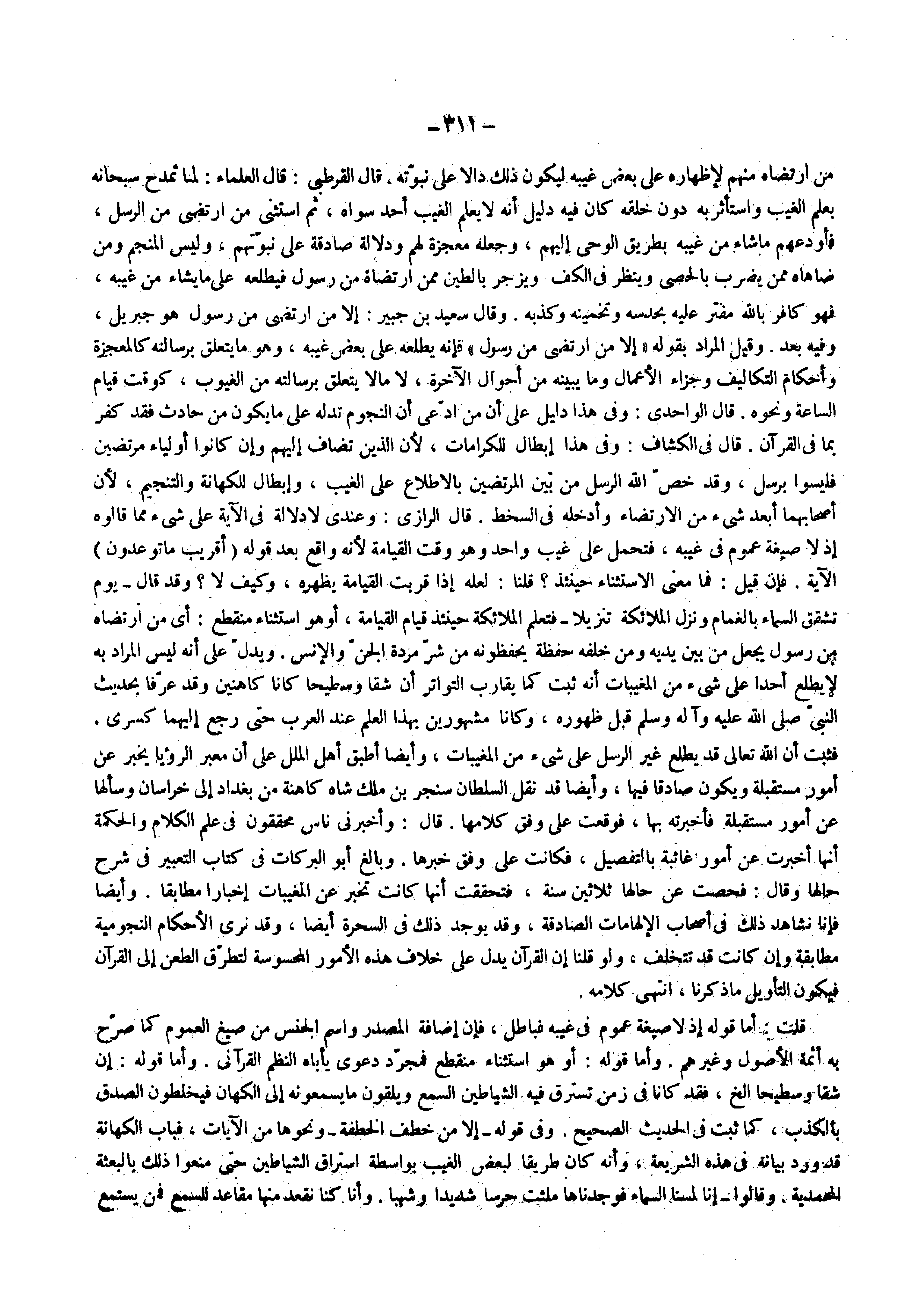 أو من ارتضاه منهم لإظهاره على بعض غيبه ليكون ذلك دالا على نبوته قال القرطبي قال العلماء لما تمدح سبحانه بعلم الغيب واستأثر به دون خلقه كان دليل أنه لا يعلم الغيب أحد سواه ثم استثنى من ارتضى من الرسل فأودعهم ما شاء من غيبه بطريق الوحي إليهم وجعله معجزة لهم ودلالة صادقة على نبوتهم وليس المنجم ومن ضاهاه ممن يضرب بالحصى وينظر في الكف ويزجر الطين ممن ارتضاه من رسول فيطلعه على ما يشاء من غيبه فهو كافر بالله مفتر عليه بحدسه وتخمينه وكذبه وقال سعيد بن جبير إلا من ارتضى من رسول هو جبريل وفيه بعد وقيل المراد بقوله إلا من ارتضى من رسول ) فإنه يطلعه على بعض غيبه وهو ما يتعلق برسالته كالمعجزة وأحكام التكاليف وجزاء الأعمال وما يبينه من أحوال الآخرة لا مالا يتعلق برسالته من العيوب كوقت قيام الساعة ونحوه قال الواحدي وفي هذا دليل على أن من ادعى أن النجوم تدله على ما يكون من حادث فقد كفر بما في القرآن قال في الكشاف وفي هذا إبطال للكرامات لأن الذين تضاف إليهم وإن كانوا أولياء مرتضين فإيسوا برسل وقد خص الله الرسل من بين المرتضيين بالاطلاع على الغيب وإبطال للكهانة والتنجيم لأن أصحابهما أبعد شيء من الارضاء وادخله في السخط قال الرازي وعندي لادلالة في الآية على شيء مما قالوه إذا لا صيغة عموم في غيبه فتحمل على غيب واحد وهو وقت القيامة لأنه واقع بعد قوله ( أقريب ما توعدون ) الآية فإن قيل فما معنى الاستثناء حينئذ قلنا لعله إذا قربت القيامة يظهره وكيف لا وقد قال يوم تشقق السماء بالغمام ونزل الملائكة تنزيلا فتعلم الملائكة حينئذ قيام القيامة أو هو استثناء منقطع أي من ارتضاه من رسول يجعل بين يديه ومن خلفه حفظة يحفظونه من شر مرده الجن والإنس ويدل على أنه ليس المراد به لا يطلع أحد على شيء من المغيبات أنه ثبت كما يقارب التواتر أن شقا وسطيحا كانا كاهنين وقد عرفا بحديث النبي صلى الله عليه وإله وسلم قبل ظهوره وكانا مشهورين بهذا العلم عند العرب حتى رجع إليهما كسرى فثبت أن الله تعالى قد يطلع غير الرسل على شيء من المغيبات وأيضا أطبق أهل الملل على أن معبر الرؤيا يخبر عن أمور مستقبله ويكون صادقا فيها وايضا قد نقل السلطان سنجر بن ملك شاة كاهنة من بغداد إلى خراسان وسألها عن أمور مستقبلة فأخبرته بها فوقعت على وفق كلامها قال وأخبرني ناس محققون في علم الكلام والحكمة أنها اخبرت عن امور غائبة بالتفصيل فكانت على وفق خبرها وبالغ أبو البركات في كتاب التعبير في شرح حالها وقال فحصت عن حالها ثلاثين سنة فتحققت أنها كانت تخبر عن المغيبات إخبارا مطابقا وايضا فإنا نشاهد ذلك في أصحاب الإلهامات الصادقة وقد يوجد ذلك في السحرة أيضا وقد نرى الأحكام النجومية مطابقة وإن كانت قد تتخلف ولو قلنا إن القرآن يدل على خلاف هذه الأمور المحسوسة لتطرق الطعن إلى القرآن فيكون التأويل ما ذكرنا انتهى كلامه قلت أما قوله إذ لا صيغة عموم في غيبه فباطل فإن إضافة المصدر واسم الجنس من صيغ العموم كما صرح به أئمة الأصول وغيرهم وأما قوله أو هو استثناء منقطع فمجرد دعوى يأباه النظم القرآني وأما قوله إن شقا وسطيحا الخ فقد كانا في زمن تسترق فيه الشياطين السمع ويلقون ما يسمعونه إلى الكهان فيخلطون الصدق بالكذب كما ثبت في الحديث الصحيح وفي قوله إلا من خطف الخطفة ونحوها من الآيات فباب الكهانة قد ورد بيانه في هذه الشريعة وأنه كان طريقا لبعض الغيب بواسطة استراق الشياطين حتى منعوا ذلك بالبعثة المحمدية وقالوا إنا لمسنا السماء فوجدناها ملئت حرسا شديدا وشهبا وانا كنا نقعد منها مقاعد للسمع فمن يستمع