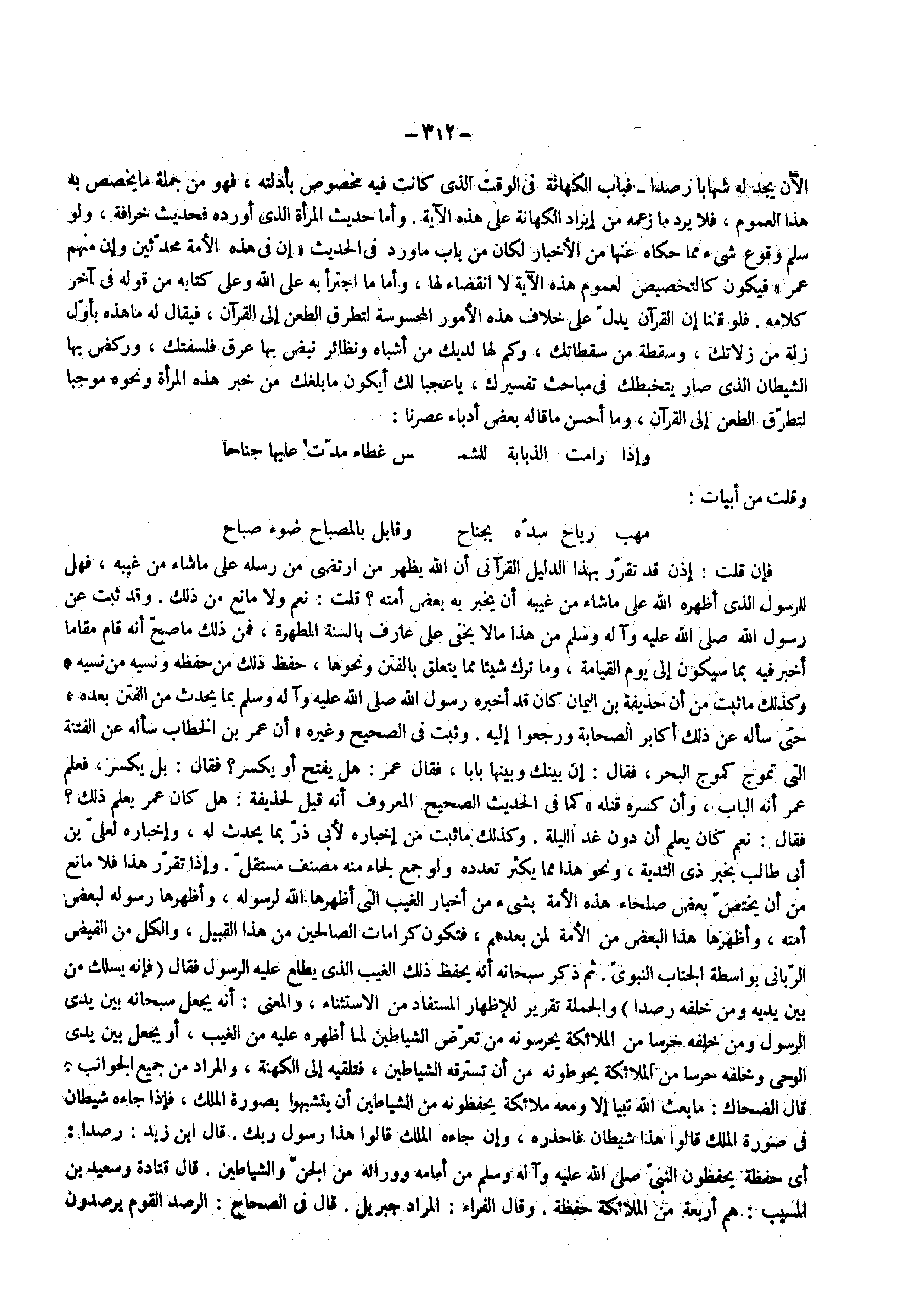 الأن يجد له شهابا رصدا فباب الكهانة في الوقت الذي كانت فيه مخصوص بأدلته فهو من جملة ما يخصص به هذا العموم فلا يرد ما زعمه من إيراد الكهانة على هذه الآية واما حديث المراة الذي أورده فحديث خرافة ولو سلم وقوع شيء مما حكاه عنها من الأخبار لكان من باب ما ورد في الحديث إن في هذه الأمة محدثين وإن منهم عمر فيكون كالتخصيص لعموم هذه الآية لا انقضاء لها وأما ما أجترا به على الله وعلى كتابه من قوله في آخر كلامه فلو قلنا إن القرآن يدل على خلاف هذه الأمور المحسوسة لتطرق الطعن إلى القرآن فيقال له ما هذه بأول زلة من زلاتك وسقطة من سقطاتك وكم لها لديك من أشباه ونظائر نبض بها عرق فلسفتك وركض بها الشيطان الذي صار يتخبطك في مباحث تفسيرك يا عجبا لك أن يكون ما بلغك من خبر هذه المرأة ونحوه موجبا لتطرق الطعن إلى القرآن وما أحسن ما قاله بعض أدباء عصرنا وإذا رامت الذبابة للشمس