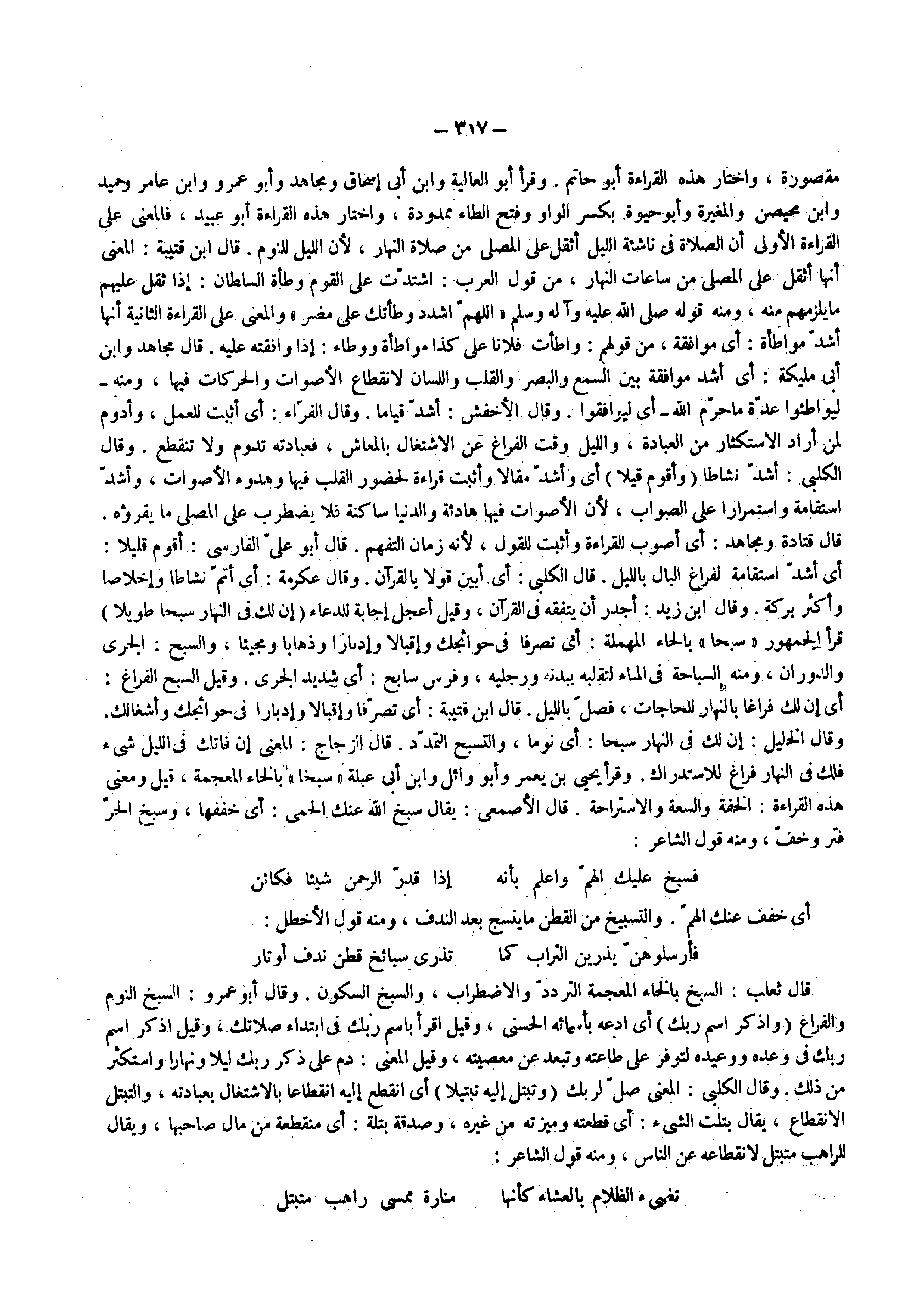 ( إن لك في النهار سبحا طويلا ) قرأ الجمهور سبحا بالحاء المهملة أي تصرفا في حوائجك وإقبالا وإدبارا وذهابا ومجيئا والسبح الجري والدوران ومنه السباحة في الماء لتقلبه ببدنه ورجليه وفرس سابح أي شديد الجري وقيل السبح الفراغ أي إن لك فراغا بالنهار للحاجات فصل بالليل قال أبن قتيبة أي تصرفا وإقبالا وإدبارا في حوائجك وأشغالك وقال الخليل إن لك في النهار سبحا أي نوما والتسبح التمدد قال الزجاج المعنى إن فاتك في الليل شيء فلك في النهار فراغ للاستدراك وقرأ يحيى بن يعمر وأبو وائل وأبن أبي عبلة سبحا بالحاء المعجمة وقيل معنى هذه القراءة الخفة والسعة والاستراحة قال الأصمعي يقال سبخ الله عنك الحمى أي خففها وسبخ الحر فتر وخف ومنه قول الشاعر فسبح عليك الهم واعلم بأنه