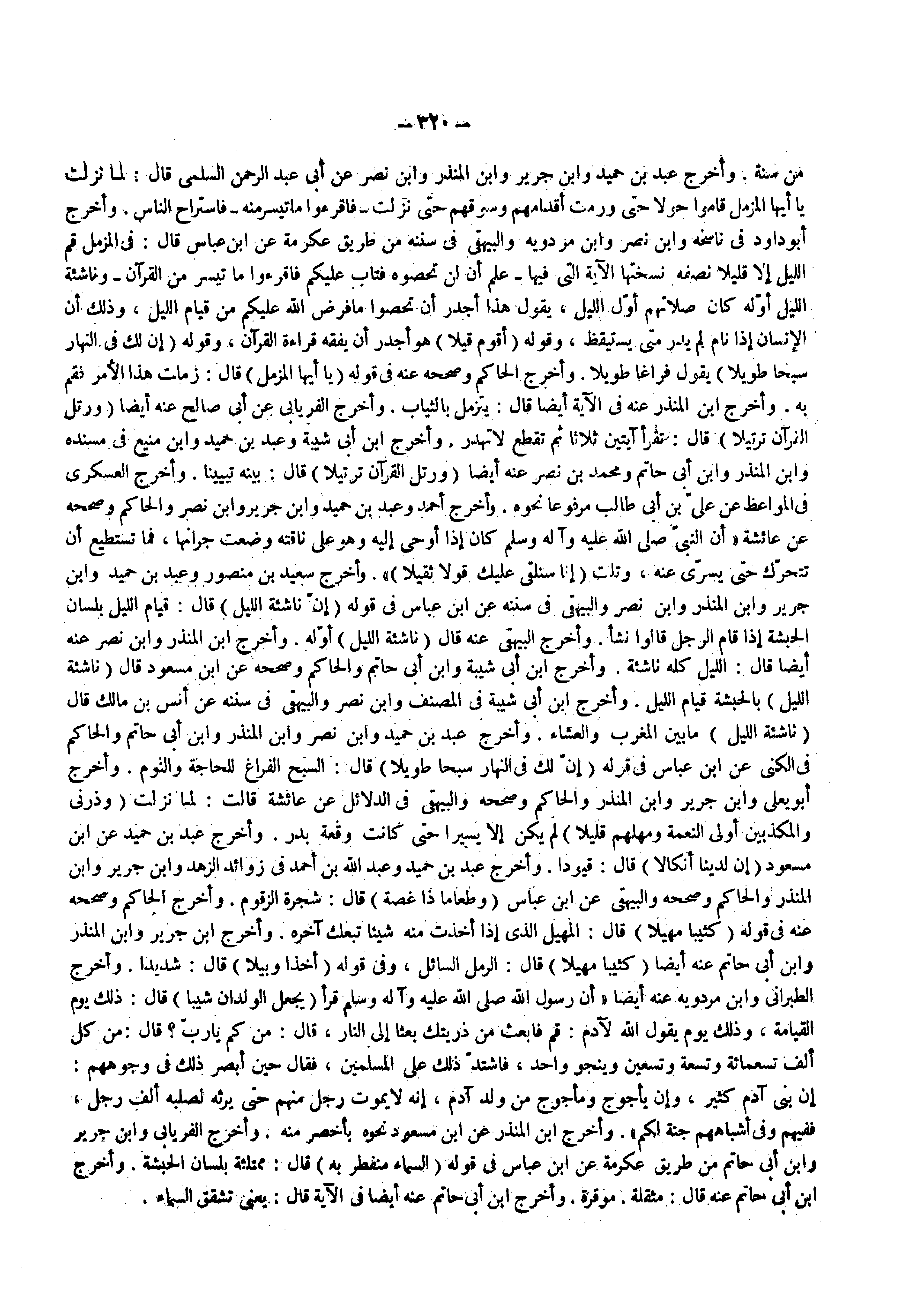 من سنة وأخرج عبد بن حميد وأبن جرير وأبن المنذر وأبن نصر عن أبي عبد الرحمن السلمي قال لما نزلت يا ايها المزمل قاموا حولا حتى ورمت أقدامهم وسوقهم حتى نزلت فاقرؤوا ما تيسر منه فاستراح الناس وأخرج أبو داود في ناسخه وابن نصر وأبن مردويه والبيهقي في سننه من طريق عكرمة عن ابن عباس قال في المزمل قم الليل إلا قليلا نصفه نسختها الآية التي فيها علم ان لن تحصوه فتاب عليكم فاقرؤوا ما تيسر من القرآن وناشئة اليل أوله كان صلاتهم أول الليل يقول هذا اجدر أن تحصوا ما فرض الله عليكم من قيام الليل وذلك أن الإنسان إذا نام لم يدر متى يستيقظ وقوله ( أقوم قيلا ) هو أجدر أن يفقه قراءة القرآن وقوله ( إن لك في النهار سبحا طويلا ) يقول فراغا طويلا وأخرج الحاكم وصححه عنه في قوله 0 يا ايها المزمل ) قال زملت هذا الأمر فقم به واخرج أبن المنذر عنه في الآية أيضا قال يتزمل بالثياب وأخرج الفريابي عن أبي صالح عنه أيضا ( ورتل القرآن ترتيلا ) قال تقرأ آيتين ثلاثا ثم تقطع لا تهدر وأخرج أبن أبي شيبة وعبد بن حميد وأبن منيع في مسنده وأبن المنذر وأبن أبي حاتم ومحمد بن نصر عنه أيضا ( ورتل القرآن ترتيلا ) قال بينه تبيينا واخرج العسكري في المواعظ عن علي بن أبي طالب مرفوعا نحوه واخرج أحمد وعبد بن حميد وأبن جرير وابن نصر والحاكم وصححه عن عائشة أن النبي صلى الله عليه وإله وسلم كان إذا أوحى إليه وهو على ناقته وضعت جرانها فما تستطيع أن تتحرك حتى يسرى عنه وتلت إنا سنلقي عليك قولا ثقيلا وأخرج سعيد بن منصور وعبد بن حميد وابن جرير وأبن المنذر وأبن نصر والبيهقي في سننه عن أبن عباس في قوله ( إن ناشئة الليل ) قال قيام الليل بلسان الحبشة إذا قام الرجل قالو نشأ وأخرج البيهقي عنه قال ( ناشئة الليل ) أوله وأخرج ابن المنذر وأبن نصر عنه أيضا قال الليل كله ناشئة واخرج أبن أبي شيبة وابن أبي حاتم والحاكم وصححه عن أبن مسعود قال ( ناشئة الليل ) بالحبشة قيام الليل واخرج أبن أبي شيبة في المصنف وأبن نصر والبيهقي في سننه عن أنس بن مالك قال ( ناشئة الليل ) ما بين المغرب والعشاء وأخرج عبد بن حميد وأبن نصر وأبن المنذر وأبن أبي حاتم والحاكم في الكنى عن أبن عباس في قوله 0 إن لك في النهار سبحا طويلا ) قال السبح الفراغ للحاجة والنوم وأخرج أبو يعلي وابن جرير وابن المنذر والحاكم وصححه والبيهقي في الدلائل عن عائشة قالت لما نزلت ( وذرني والمكذبين أولى النعمة ومهلهم قليلا ) لم يكن إلا يسيرا حتى كانت وقعة بدر واخرج عبد بن حميد عن ابن مسعود ( إن لدينا أنكالا ) قال قيودا وأخرج عبد بن حميد وعبد الله بن أحمد في زوائد الزهد وأبن جرير وأبن المنذر والحاكم وصححه والبيهقي عن ابن عباس ( وطعاما ذا غصة ) قال شجرة الزقوم واخرج الحاكم وصححه عنه في قوله ( كثيبا مهيلا ) قال المهيل الذي إذا أخذت منه شيئا تبعك آخره واخرج أبن جرير وأبن المنذر وأبن أبي حاتم عنه أيضا ( كثيبا مهيلا ) قال الرمل السائل وفي قوله ( أخذا وبيلا ) قال شديدا وأخرج الطبراني وأبن مردويه عنه أيضا أن رسول الله ( صلى الله عليه وسلم ) قرأ ( يجعل الولدان شيبا ) قال ذلك يوم القيامة وذلك يوم يقول الله لآدم قم فابعث من ذريتك بعثا إلى النار قال من كم يا رب قال من كل ألف تسعمائة وتسعة وتسعين وينجو واحد فاشتد ذلك على المسلمين فقال حين ابصر ذلك في وجوههم إن بني آدم كثير وإن ياجوج ومأجوج من ولد آدم إنه لا يموت رجل منهم حتى يرثه لصلبه ألف رجل ففيهم وفي أشباههم جنة لكم وأخرج أبن المنذر عن أبن مسعود نحوه بأخصر منه وأخرج الفريابي وأبن جرير وأبن أبي حاتم من طريق عكرمة عن ابن عباس في قوله ( السماء منفطر به ) قال ممتلئة بلسان الحبشة وأخرج أبن أبي حاتم عنه قال مثقلة موقرة واخرج أبن أبي حاتم عنه أيضا في الآية قال يعني تشقق السماء