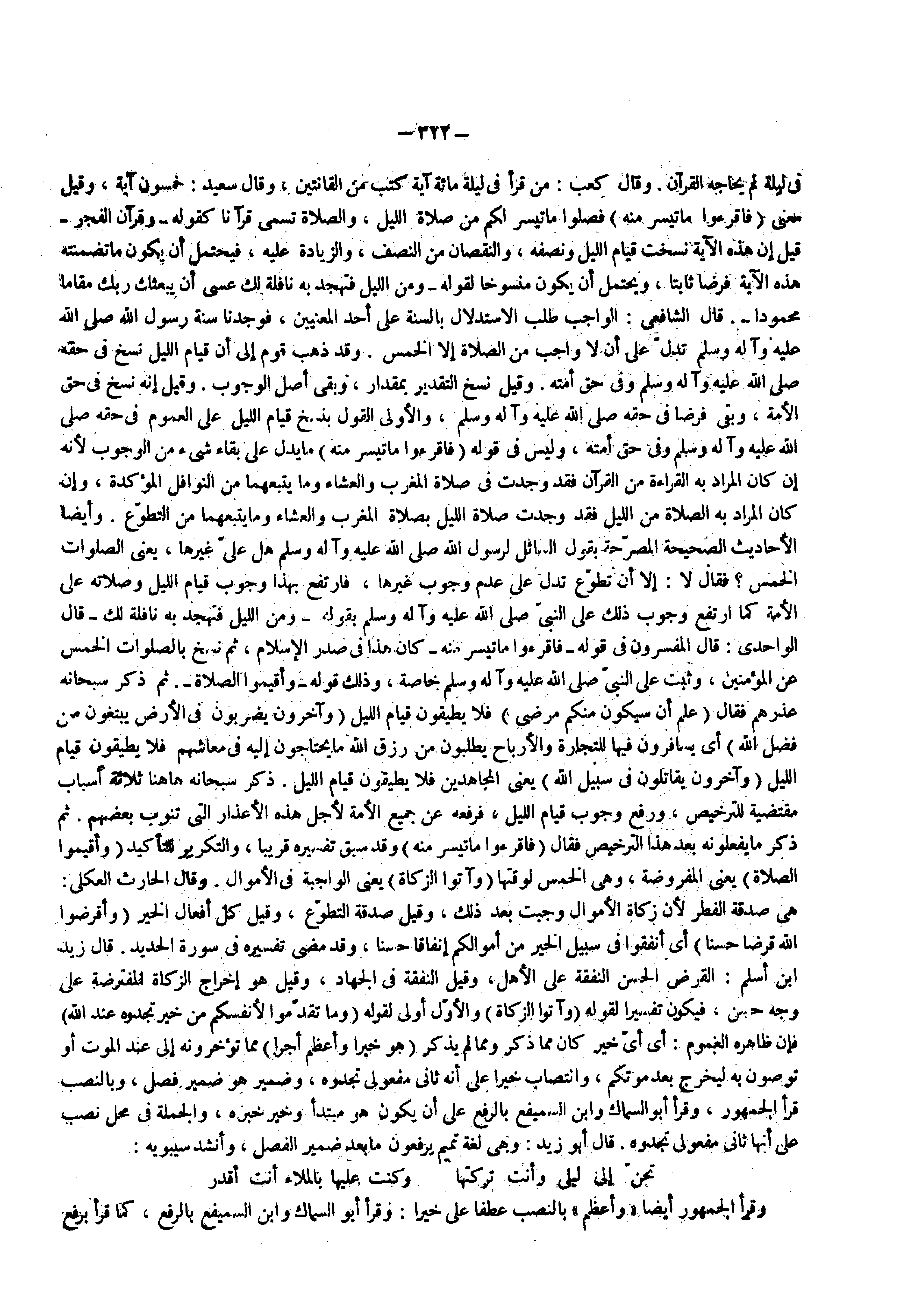 في ليلة لم يحاجه القرآن وقال كعب من قرا في ليلة مائة آية كتب من القانتين وقال سعيد خمسون آية وقيل معنى ( فاقرءوا ما تيسر منه ) فصلوا ما تيسر لكم من صلاة الليل والصلاة تسمى قرأنا كقوله وقرآن الفجر قيل ان هذه الاية نسخت قيام الليل ونصفه والنقصان من النصف والزيادة عليه فيحتمل أن يكون ما تضمنته هذه الآية فرضا ثابتا ويحتمل أن يكون منسوخا لقوله ومن الليل فتهجد به نافلة لك عسى أن يبعثك ربك مقاما محمودا قال الشافعي الواجب طلب الاستدلال بالسنة على أحد المعنيين فوجدنا سنة رسول الله صلى الله عليه وإله وسلم تدل على ان لا واجب من الصلاة إلا الخمس وقد ذهب قوم إلى أن قيام الليل نسخ في حقه ( صلى الله عليه وسلم ) وفي حق أمته وقيل نسخ التقدير بمقدار وبقي أصل الوجوب وقيل إنه نسخ في حق الأمة وبقي فرضا في حقه ( صلى الله عليه وسلم ) والأول ألاولى القول بنسخ قيام الليل على العموم في حقه صلى الله عليه وإله وسلم وفي حق أمته وليس في قوله ( فاقرءوا ما تيسر منه ) ما يدل على بقاء شئ من الوجوب لأنه 4 إن كان المراد به القراة من القرآن فقد وجدت في صلاة المغرب والعشاء وما يتبع من النوافل المؤكدة وإن كان المراد به الصلاة من الليل فقد وجدت صلاة الليل بصلاة المغرب والعشاء وما يتبعهما من التطوع وأيضا الأحاديث الصحيحة المصرحة بقول السائل لرسول الله صلى الله عليه وإله وسلم هل على غيرها يعني الصلوات الخمس فقال لا إلا أن تطوع تدل على عدم وجوب غيرها فارتفع بهذا وجوب قيام الليل وصلاته على الأمة كما ارتفع وجوب ذلك على النبي ( صلى الله عليه وسلم ) بقوله ومن الليل فتهجد به نافلة لك قال الواحدي قال المفسرون في قوله فاقرؤوا ما تيسر منه كان هذا في صدر الإسلام ثم نسخ بالصلوات الخمس عن المؤمنين وثبت على النبي ( صلى الله عليه وسلم ) خاصة وذلك قوله وأقيموا الصلاة ثم ذكر سبحانه عذرهم فقال ( علم أن سيكون منكم مرضى ) فلا يطيقون قيام الليل ( وآخرون يضربون في الأرض يبتغون من فضل الله ) أي يسافرون فيها للتجارة والأرباح يطلبون من رزق الله ما يحتاجون إليه في معاشهم فلا يطيقون قيام الليل ( وآخرون يقاتلون في سبيل الله ) يعني المجاهدين فلا يطيقون قيام الليل ذكر سبحانه ها هنا ثلاثة اسباب مقتضية للترخيص ورفع وجوب قيام الليل فرفعه عن جميع الأمة لأجل هذه الأعذار التي تنوب بعضهم ثم ذكر ما يفعلونه بعد هذا الترخيص فقال ( فاقرءوا ما تيسر منه ) وقد سبق تفسيره قريبا والتكرير للتأكيد ( وأقيموا الصلاة ) يعني المفروضة وهي الخمس لوقتها ( وآتوا الزكاة ) يعني الواجبة في الأموال وقال الحارث العكلي هي صدقة الفطر لأن زكاة الأموال وجبت بعد ذلك وقيل صدقة التطوع وقيل كل أفعال الخير ( وأقرضوا الله قرضا حسنا ) أي أنفقوا في سبيل الخير من أموالكم إنفاقا حسنا وقد مضى تفسيره في سورة الحديد قال زيد ابن اسلم القرض الحسن النفقة على ا لأهل وقيل النفقة في الجهاد وقيل هو أخراج الزكاة المفترضة على وجه حسن فيكون تفسيرا لقوله ( وآتوا الزكاة ) والأول أولى لقوله ( وما تقدموا لأنفسكم من خير تجدوه عند الله ) فإن ظاهرة العموم أي خير كان مما ذكر ومما لم يذكر ( هو خيرا وأعظم أجرا ) مما تؤخرونه إلى عند الموت أو توصون به ليخرج بعد موتكم وانتصاب خيرا على انه ثاني مفعولي تجدوه وضمير هو ضمير فصل وبالنصب قرأ الجمهور وقرأ أبو السماك وابن السميفع بالرفع على أن يكون هو مبتدا وخبر خبره والجملة في محل نصب على أنها ثاني مفعولي تجدوه قال أبو زيد وهي لغة تميم يرفعون ما بعد ضمير الفصل وأنشد سيبويه تحن إلى ليلى وأنت تركتها وكنت