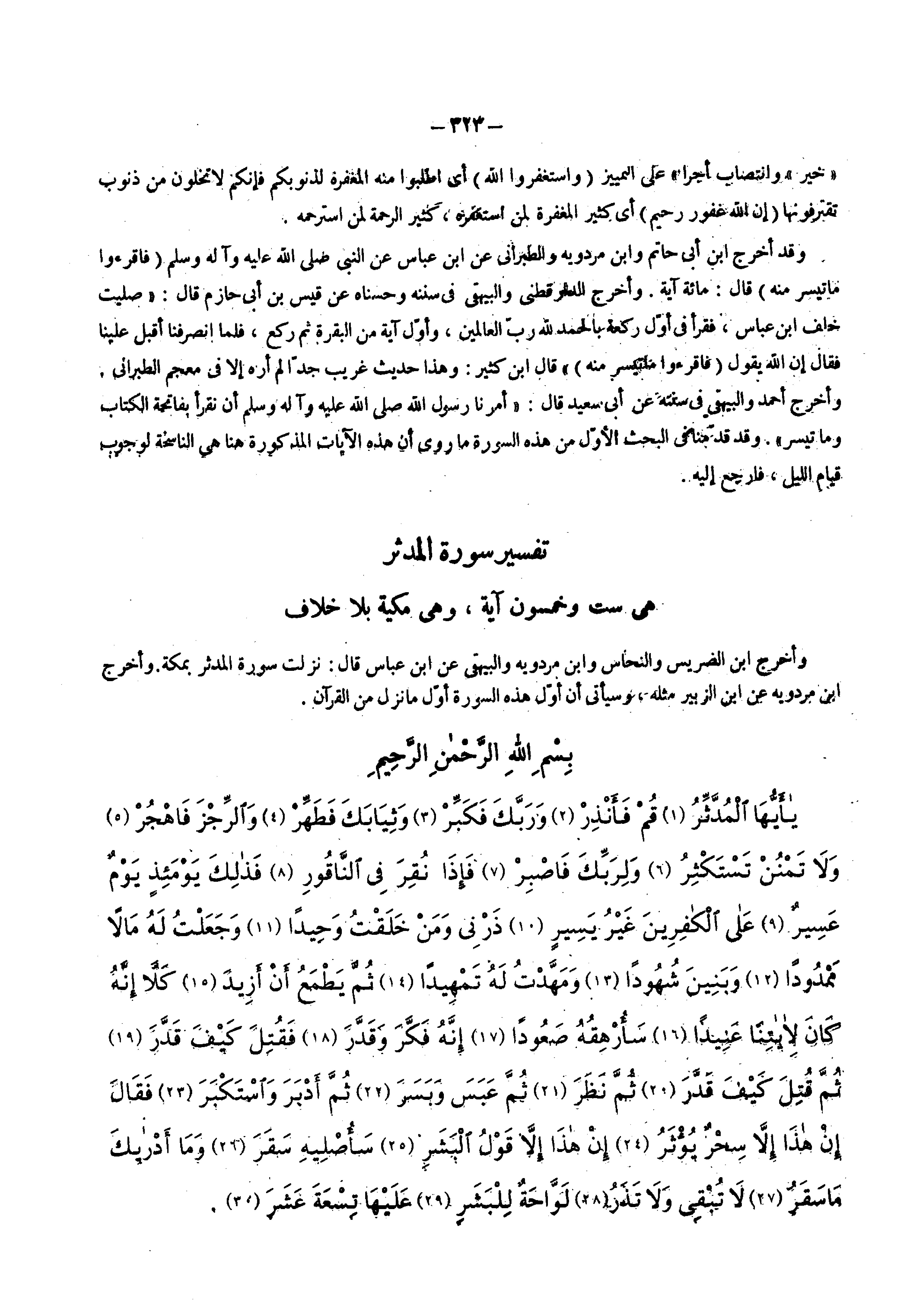 وأخرج أبن الضريس والنحاس وابن مردويه والبيهقي عن ابن عباس قال نزلت سورة المدثر بمكة واخرج أبن مردويه عن ابن الزبير مثله وسيأتي أن اول هذه السورة أول ما نزل من القرآن
