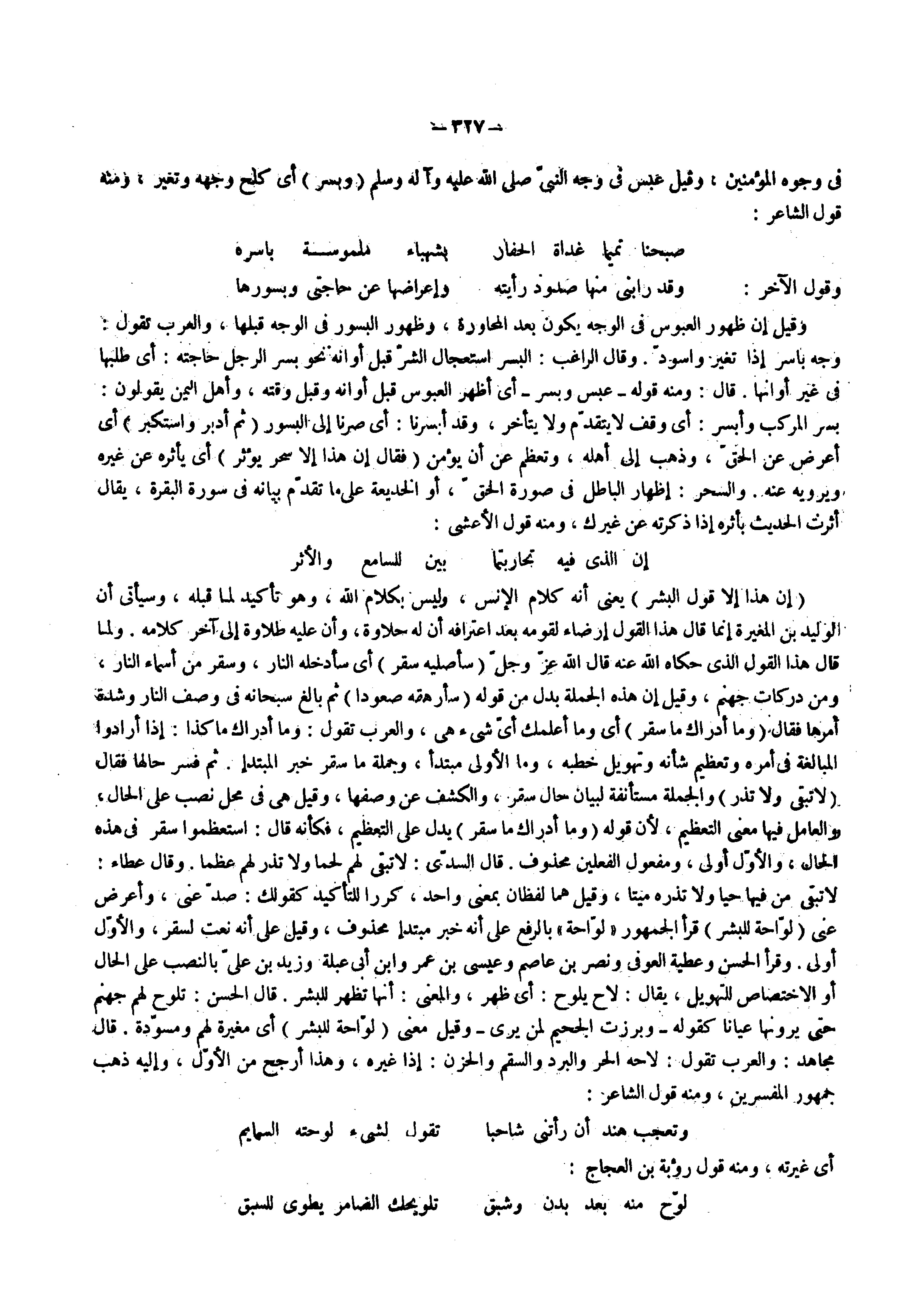 وقيل إن ظهور العبوس في الوجه يكون بعد المجاورة وظهور البسور في الوجه قبلها والعرب تقول وجه باسر إذا تغير واسود وقال الراغب البسر استعجال الشر قبل أوانه نحو بسر الرجل حاجته أي طلبها في غير أوانها قال ومنه قوله عبس وبسر أي أظهر العبوس قبل اوانه وقبل وقته وأهل اليمن يقولون بسر المركب وأبسر أي وقف لا يتقدم ولا يتأخر وقد ابسرنا أي صرنا إلى البسور