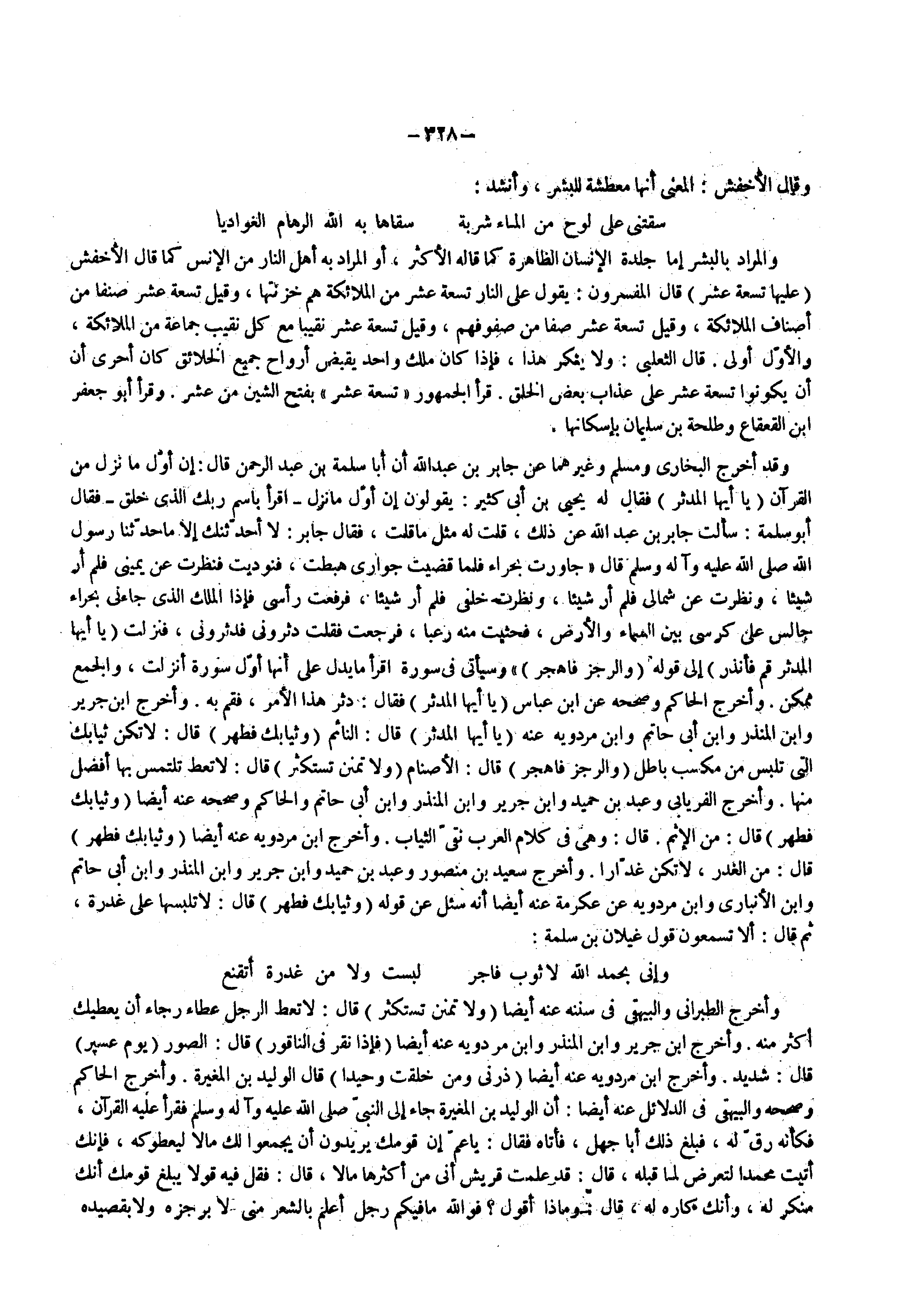 وأخرج الطبراني والبيهقي في سننه عنه أيضا ( ولا تمنن تستكثر ) قال لا تعط الرجل عطاء رجاء أن يعطيك أكثر منه وأخرج ابن جرير وابن المنذر وابن مردويه عنه أيضا ( فإذا نقر في الناقور ) قال الصور ( يوم عسير ) قال شديد وأخرج ابن مردويه عنه أيضا ( ذرني ومن خلقت وحيدا ) قال الوليد بن المغيرة وأخرج الحاكم وصححه والبيهقي في الدلائل عنه أيضا أن الوليد بن المغيرة جاء إلى النبي ( صلى الله عليه وسلم ) فقرأ عليه القرآن فكأنه رق له فبلغ ذلك أبا جهل فأتاه فقال يا عم إن قومك يريدون أن يجمعوا لك مالا ليعطوكه فإنك أتيت محمدا لتعرض لما قبله قال قد علمت قريش أني من أكثرها مالا قال فقل فيه قولا يبلغ قومك أنك منكر له وأنك كارة له قال وماذا أقول فوالله ما فيكم رجل أعلم بالشعر مني لا برجزه ولا بقصيدة