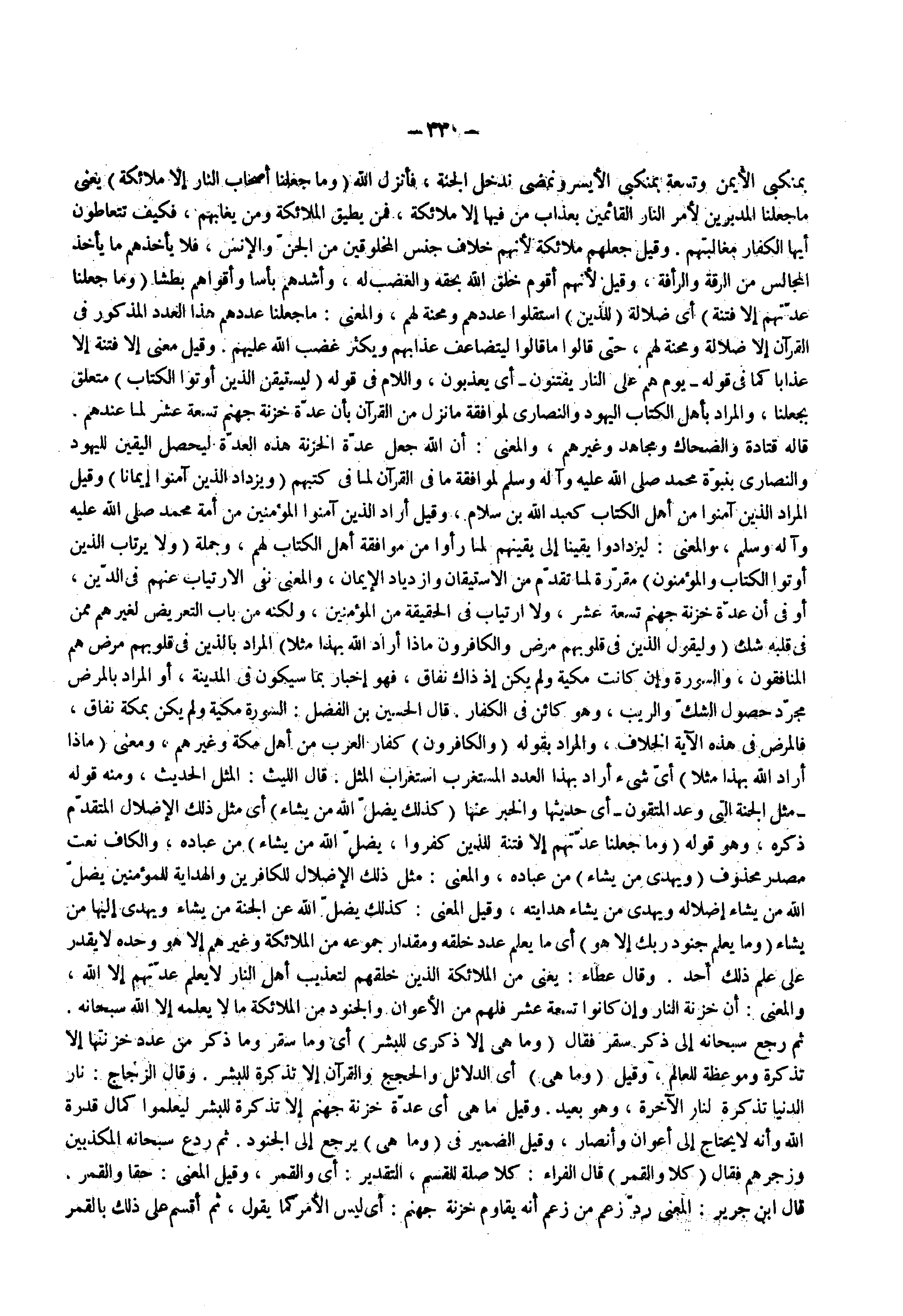 بمنكبي الأيمن وتسعة بمنكبي الأيسر ونمضي ندخل الجنة فأنزل الله ( وما جعلنا أصحاب النار إلا ملائكة ) يعني ما جعلنا المدبرين لأمر النار القائمين بعذاب من فيها إلا ملائكة فمن يطيق الملائكة ومن يغلبهم فكيف تتعاطون أيها الكفار مغالبتهم وقيل جعلهم ملائكة لأنهم خلاف جنس المخلوقين من الجن والإنس فلا يأخذهم ما يأخذ المجالس من الرقة والرأفة وقيل لأنهم أقوم خلق الله بحقه والغضب له وأشدهم بأسا وأقواهم بطشا ( وما جعلنا عدتهم إلا فتنة ) أي ضلالة ( للذين ) استقلوا عددهم ومحنة لهم والمعنى ما جعلنا عددهم هذا العدد المذكور في القرآن إلا ضلالة ومحنة لهم حتى قالوا ما قالوا ليتضاعف عذابهم ويكثر غضب الله عليهم وقيل معنى إلا فتنة إلا عذابا كما في قوله يوم هم على النار يفتنون أي يعذبون واللام في قوله ( ليستيقن الذين أوتوا الكتاب ) متعلق بجعلنا والمراد بأهل الكتاب اليهود والنصارى لموافقة ما نزل من القرآن بأن عدة خزنة جهنم تسعة عشر لما عندهم قاله قتادة والضحاك ومجاهد وغيرهم والمعنى أن الله جعل عدة الخزنة هذه العدة ليحصل اليقين لليهود والنصارى بنبوة محمد ( صلى الله عليه وسلم ) لموافقة ما في القرآن لما في كتبهم ( ويزداد الذين آمنوا إيمانا ) وقيل المراد الذين آمنوا من أهل الكتاب كعبد الله بن سلام وقيل أراد الذين آمنوا المؤمنين من أمة محمد ( صلى الله عليه وسلم ) والمعنى ليزدادوا يقينا إلى يقينهم لما رأوا من موافقة أهل الكتاب لهم وجملة ( ولا يرتاب الذين أوتوا الكتاب والمؤمنون ) مقررة لما تقدم من الاستيقان وازدياد الإيمان والمعنى نفى الارتياب عنهم في الدين أو في أن عدة خزنة جهنم تسعة عشر ولا ارتياب في الحقيقة من المؤمنين ولكنه من باب التعريض لغيرهم ممن في قلبه شك ( وليقول الذين في قلوبهم مرض والكافرون ماذا أراد الله بهذا مثلا ) المراد بالذين في قلوبهم مرض هم المنافقون والسورة وإن كانت مكية ولم يكن إذ ذاك نفاق فهو إخبار بما سيكون في المدينة أو المراد بالمرض مجرد حصول الشك والريب وهو كائن في الكفار قال الحسين بن الفضل السورة مكية ولم يكن بمكة نفاق فالمرض في هذه الآية الخلاف والمراد بقوله ( والكافرون ) كفار العرب من أهل مكة وغيرهم ومعنى ( ماذا أراد الله بهذا مثلا ) أي شيء أراد بهذا العدد المستغرب استغراب المثل قال الليث المثل الحديث ومنه قوله مثل الجنة التى وعد المتقون أي حديثها والخبر عنها ( كذلك يضل الله من يشاء ) أي مثل ذلك الإضلال المتقدم ذكره وهو قوله ( وما جعلنا عدتهم إلا فتنة للذين كفروا يضل الله من يشاء ) من عباده والكاف نعت مصدر محذوف ( ويهدى من يشاء ) من عباده والمعنى مثل ذلك الإضلال للكافرين والهداية للمؤمنين يضل الله من يشاء إضلاله ويهدي من يشاء هدايته وقيل المعنى كذلك يضل الله عن الجنة من يشاء ويهدي إليها من يشاء ( وما يعلم جنود ربك إلا هو ) أي ما يعلم عدد خلقه ومقدار جموعه من الملائكة وغيرهم إلا هو وحده لا يقدر على علم ذلك أحد وقال عطاء يعنى من الملائكة الذين خلقهم لتعذيب أهل النار لا يعلم عدتهم إلا الله والمعنى أن خزنة النار وإن كانوا تسعة عشر فلهم من الأعوان والجنود من الملائكة ما لا يعلمه إلا الله سبحانه ثم رجع سبحانه إلى ذكر سقر فقال ( وما هي إلا ذكرى للبشر ) أي وما سقر وما ذكر من عدد خزنتها إلا تذكرة وموعظة للعالم وقيل ( وما هي ) أي الدلائل والحجج والقرآن إلا تذكرة للبشر وقال الزجاج نار الدنيا تذكرة لنار الآخرة وهو بعيد وقيل ما هي أي عدة خزنة جهنم إلا تذكرة للبشر ليعلموا كمال قدرة الله وأنه لا يحتاج إلى أعوان وأنصار وقيل الضمير في ( وما هي ) يرجع إلى الجنود