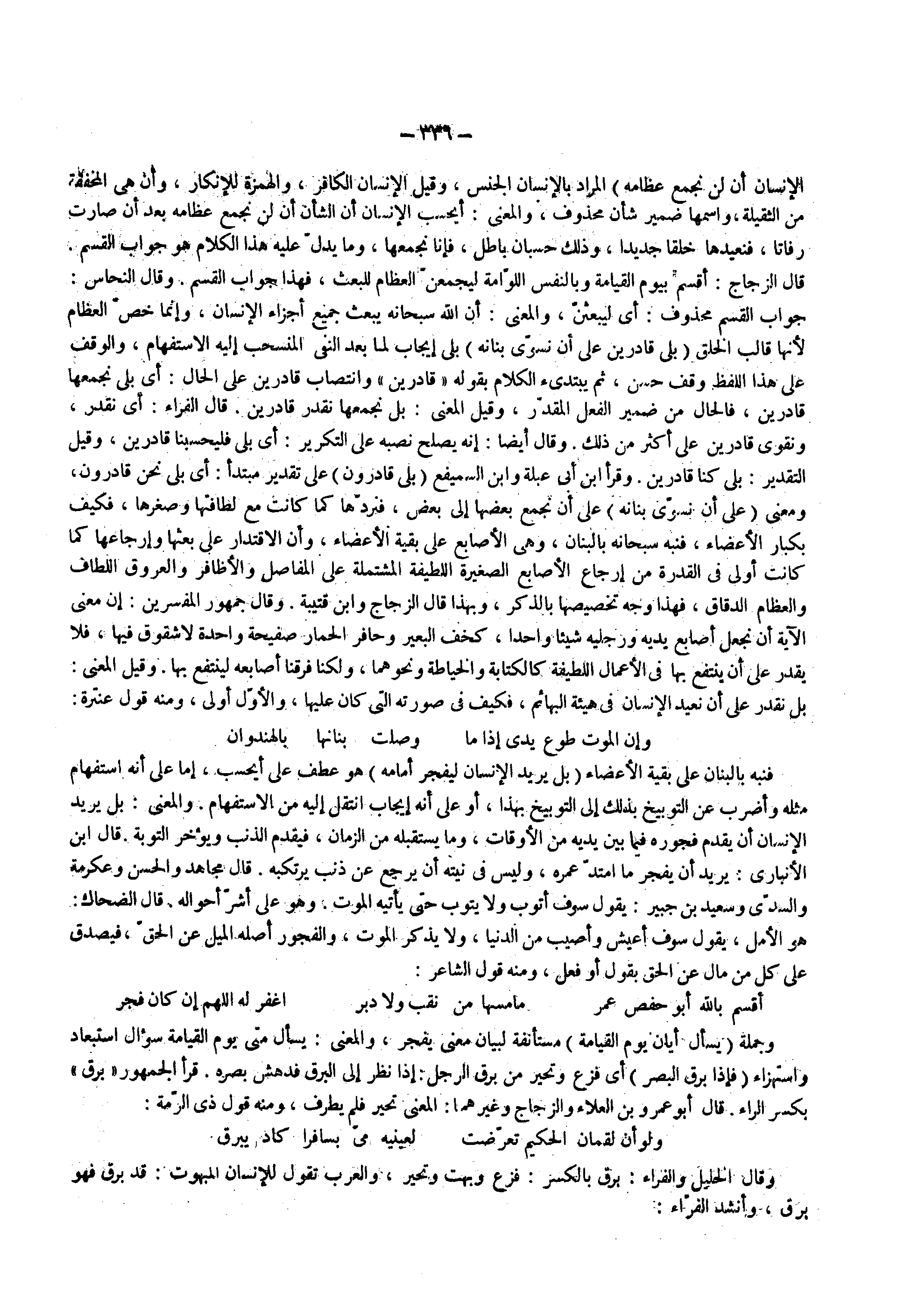 ( بلى قادرين على أن نسوي بنانه ) بل إيجاب لما بعد النفي المنسحب إليه الاستفهام والوقف على هذا اللفظ وقف حسن ثم يبتدئ الكلام بقوله قادرين وانتصاب قادرين على الحال أي بلى نجمعها قادرين فالحال من ضمير الفعل المقدر وقيل المعنى بل نجمعها نقدر قادرين قال الفراء أي نقدر ونقوي قادرين على أكثر من ذلك وقال أيضا إنه يصلح نصبه على التكرير أي بلى فليحسبنا قادرين وقيل التقدير بل كنا قادرين وقرأ ابن أبي عبلة وابن السميفع ( بلى قادرون ) على تقدير مبتدأ أي بلى نحن قادرون ومعنى ( على أن نسوي بنانه ) على أن نجمع بعضها إلى بعض فنردها كما كانت مع لطافتها وصغرها فكيف بكبار الأعضاء فنبه سبحانه بالبيان وهي الأصابع على بقية الأعضاء وأن الاقتدار على بعثها وإرجاعها كما كانت أولى في القدرة من إرجاع الأصابع الصغيرة اللطيفة المشتملة على المفاصل والأظافر والعروق اللطاف والعظام الدقاق فهذا وجه تخصيصها بالذكر وبهذا قال الزجاج وابن قتيبة وقال جمهور المفسرين إن معنى الآية أن نجعل أصابع يديه ورجليه شيئا واحدا كخف البعير وحافر الحمار صفيحة واحدة لا شقوق فيها فلا يقدر على أن ينتفع بها في الأعمال اللطيفة كالكتابة والخياطة ونحوهما ولكنا فرقنا أصابع لينتفع بها وقيل المعنى بل نقدر على أن نعيد الإنسان في هيئة البهائم فكيف في صورته التي كان عليها والأول أولى ومنه قول عنترة وإن الموت طوع يدي إذا ما