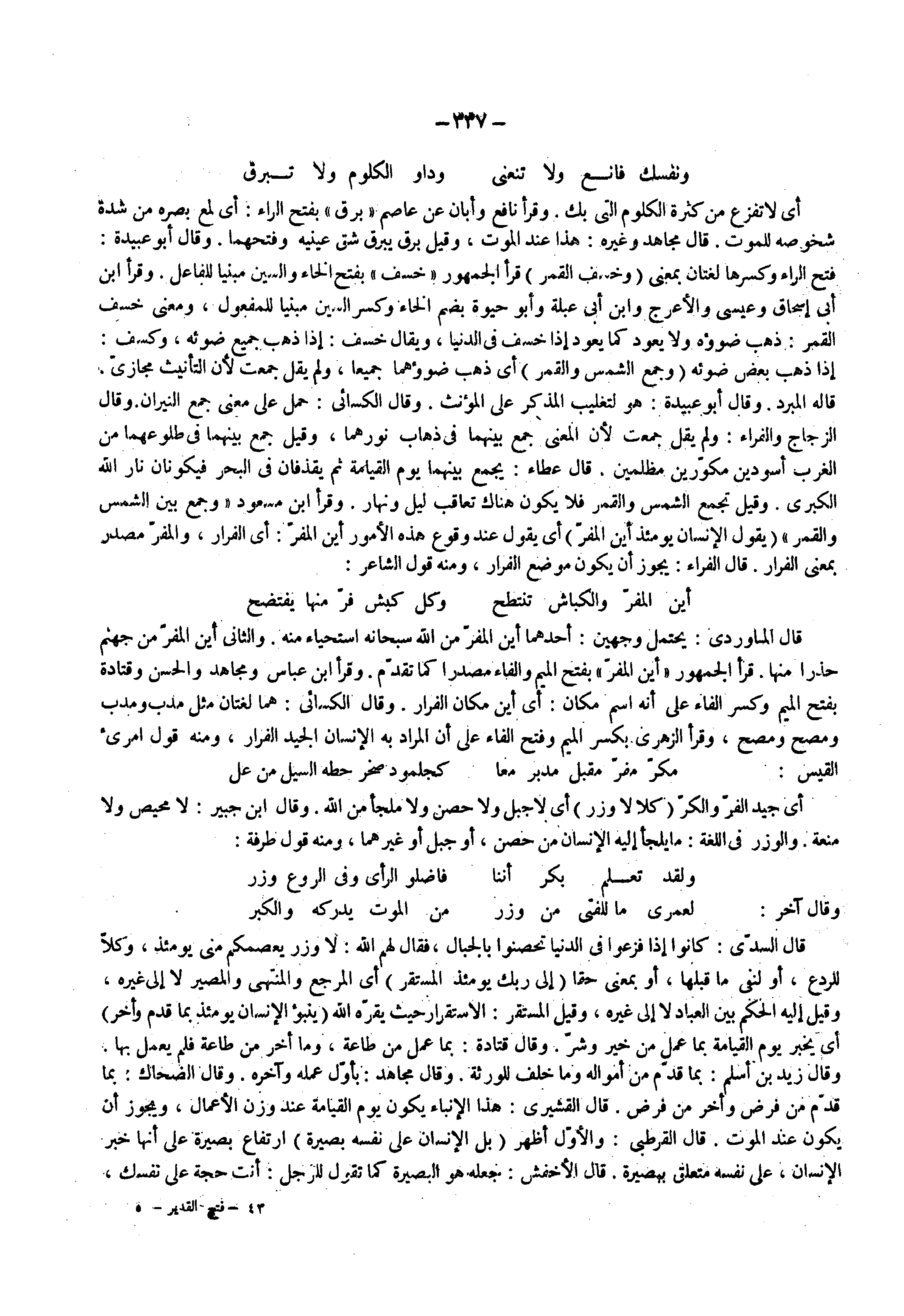 4 أي لا تفزع من كثرة الكلوم التي بك وقرأ نافع وأبان عن عاصم برق بفتح الراء أي لمع بصره من شدة شخوصه للموت قال مجاهد وغيره هذا عند الموت وقيل برق يبرق شق عينيه وفتحهما وقال أبو عبيدة فتح الراء وكسرها لغتان بمعنى