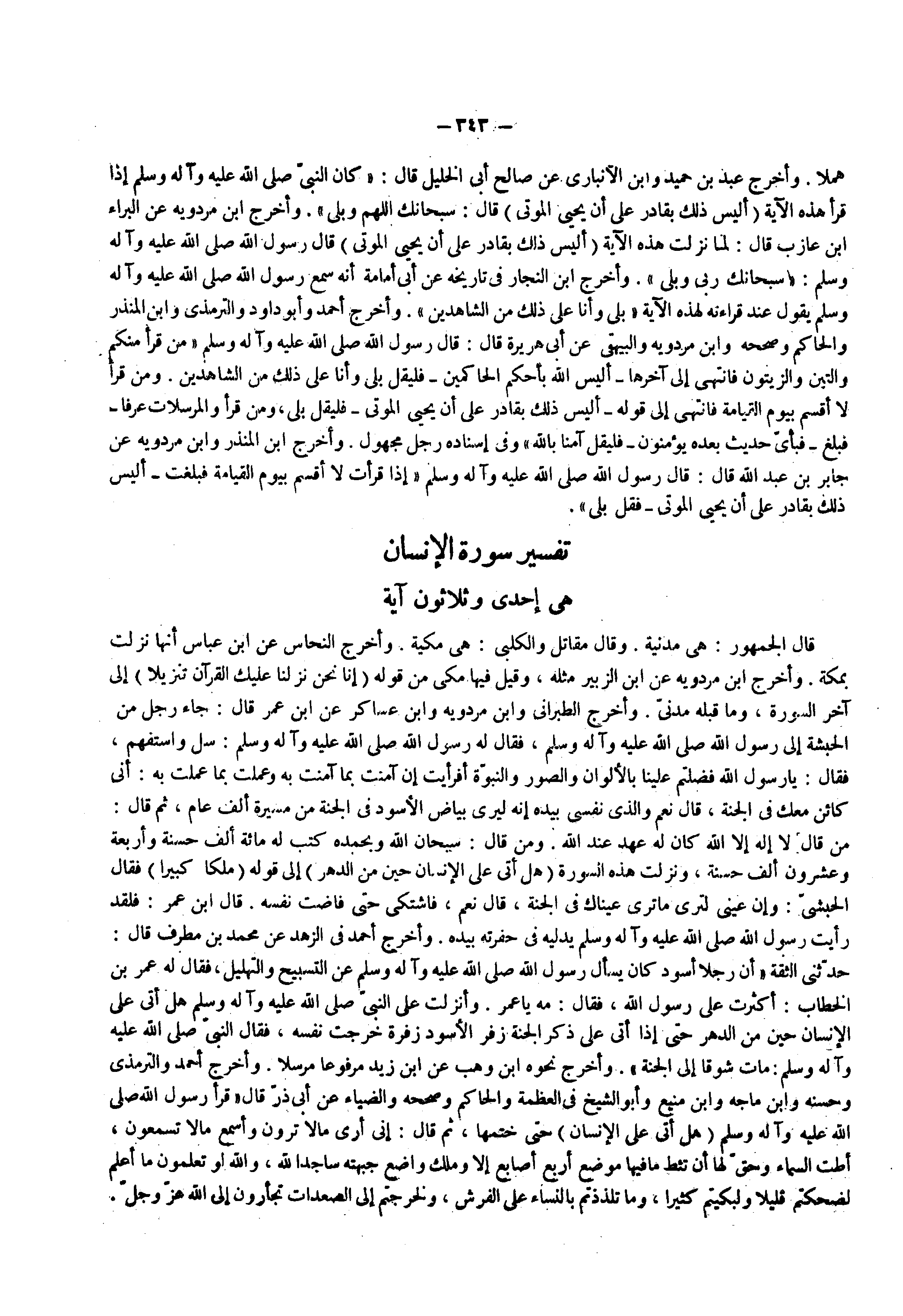قال الجمهور هي مدنية وقال مقاتل والكلبي هي مكية واخرج النحاس عن ابن عباس أنها نزلت بمكة واخرج أبن مردويه عن ابن الزبير مثله وقيل فيها مكى من قوله ( إنا نحن نزلنا عليك القرآن تنزيلا ) إلى آخر السورة وما قبله مدني واخرج الطبراني وابن مردويه وأبن عساكر عن أبن عمر قال جاء رجل من الحبشة إلى رسول الله ( صلى الله عليه وسلم ) فقال له رسول الله ( صلى الله عليه وسلم ) سل واستفهم فقال يا رسول الله فضلتم علينا بالألوان والصور والنبوة أفرأيت إن آمنت بما آمنت به وعملت بما عملت به إني كائن معك في الجنة قال نعم والذي نفسي بيده إنه ليرى بياض الأسود في الجنة من مسيرة الف عام ثم قال من قال لا آله إلا الله كان له عهد عند الله ومن قال سبحان الله وبحمده كتب له مائة الف حسنة وأربع وعشرون الف حسنة ونزلت هذه السورة ( هل أتى على الإنسان حين من الدهر ) إلى قوله ( ملكا كبيرا ) فقال الحبشي وإن عيني لنرى ما ترى عيناك في الجنة قال نعم فاشتكى حتى فاضت نفسه قال أبن عمر فلقد رأيت رسول الله ( صلى الله عليه وسلم ) يدليه في حفرته بيده واخرج أحمد في الزهد عن محمد بن مطرف قال حدثني الثقة إن رجلا أسود كان يسأل رسول الله ( صلى الله عليه وسلم ) عن التسبيح والتهليل فقال له عمر بن الخطاب أكثرت على رسول الله فقال مه يا عمر وأنزلت على النبي صلى الله عليه وغله وسلم هل أتى على الإنسان حين من الدهر حتى إذا أتى على ذكر الجنة زفر الأسود زفرة خرجت نفسه فقال النبي صلى الله عليه وإله وسلم مات شوقا إلى الجنة واخرج نحوه أبن وهب عن ابن زيد مرفوعا مرسلا واخرج أحمد والترمذي وحسنه وأبن ماجه وأبن منيع وابو الشيخ في العظمة والحاكم وصححه والضياء عن أبي ذر قال قرأ رسول الله ( صلى الله عليه وسلم ) ( هل أتى على الإنسان ) حتى ختمها ثم قال إني أرى ما لا ترون واسمع مالا تسمعون أطت السماء وحق لها أن تئط ما فيها موضع أربع اصابع إلا وملك واضع جبهته ساجدا لله والله لو تعلمون ما أعلم لضحكتم قليلا ولبكيتم كثيرا وما تلذذتم بالنساء على الفرش ولخرجتم إلى الصعدات تجأرون إلى الله عز وجل