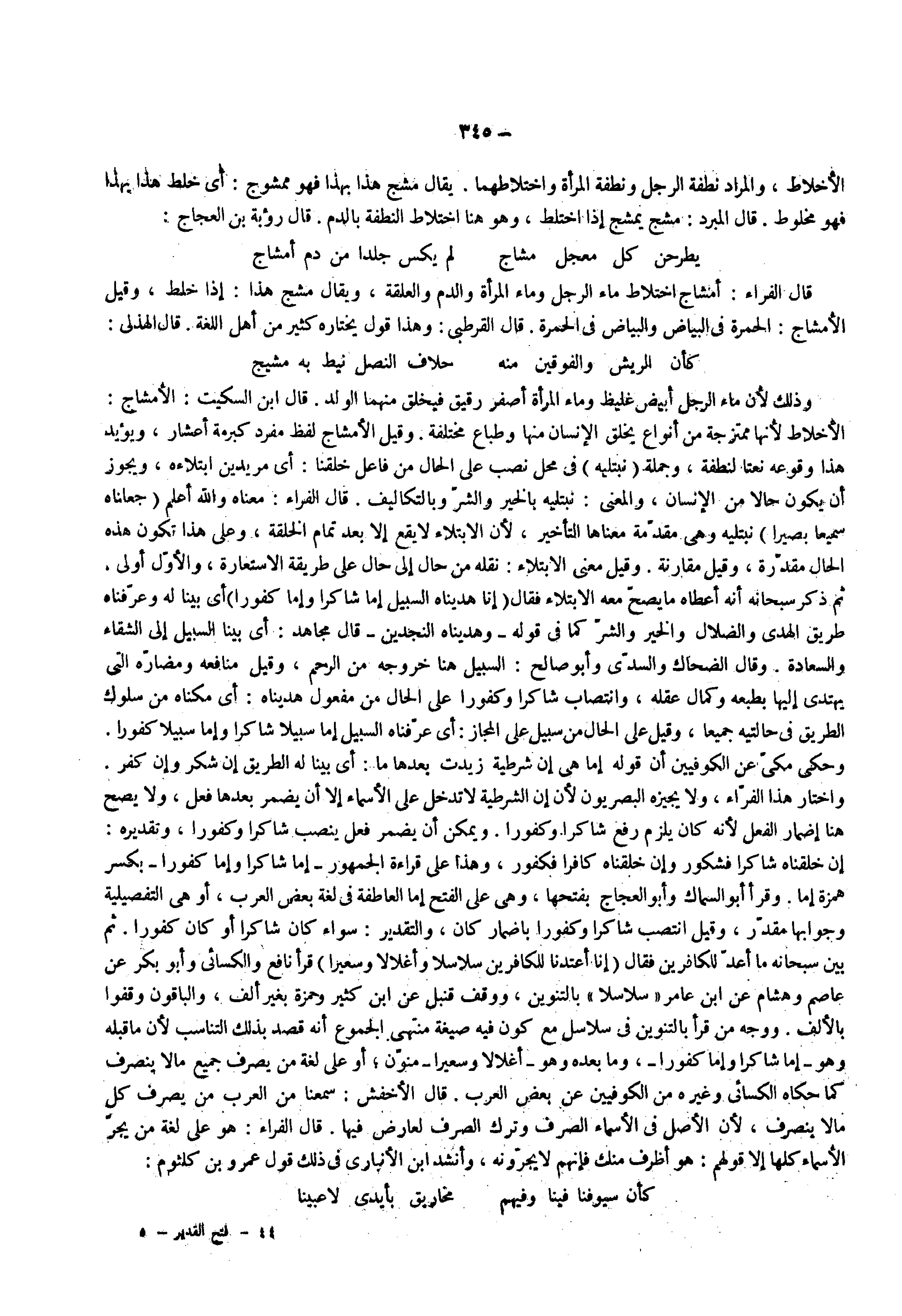قال الفراء أمشاج اختلاط ماء الرجل وماء المرأة والدم والعلقة ويقال مشج هذا إذا خلط وقيل الأمشاج الحمرة في البياض والبياض في الحمرة قال القرطبي وهذا قول يختاره كثير من أهل اللغة قال الهذلي كأن الريش والفوقين منه