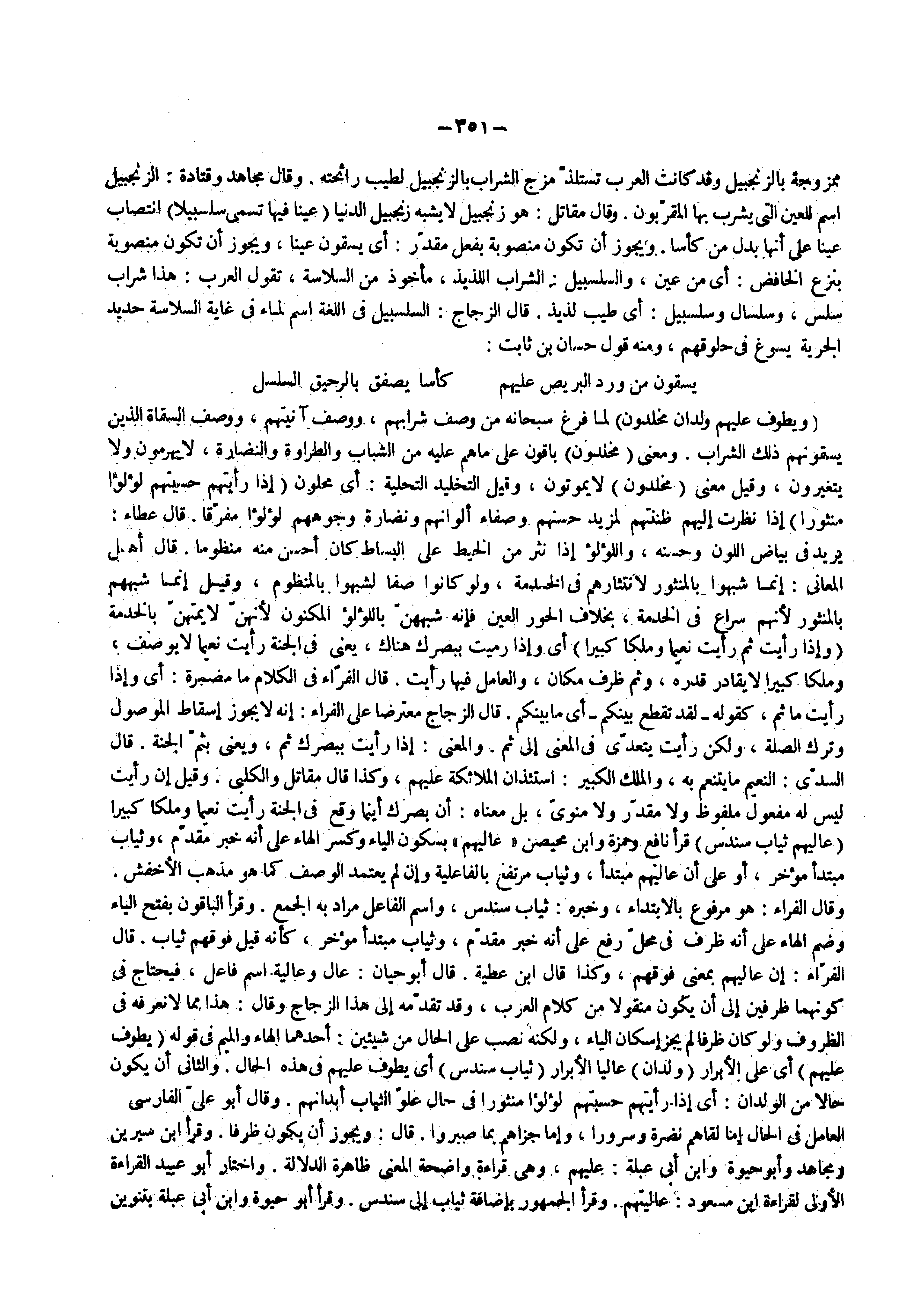 ) عينا فيها تسمى سلسبيلا ( انتصاب عينا على أنها بدل من كأسا ويجوز أن تكون منصوبة بفعل مقدر أي يسقون عينا ويجوز أن تكون منصوبة بنزع الخافض أي من عين والسلسبيل الشراب اللذيذ مأخوذ من السلاسة تقول العرب هذا شراب سلس وسلسال وسلسبيل أي طيب لذيذ قال الزجاج السلسبيل في اللغة اسم لماء في غاية السلاسة حديد الجرية يسوغ في حلوقهم ومنه قول حسان بن ثابت يسقون من ورد البريص عليهم