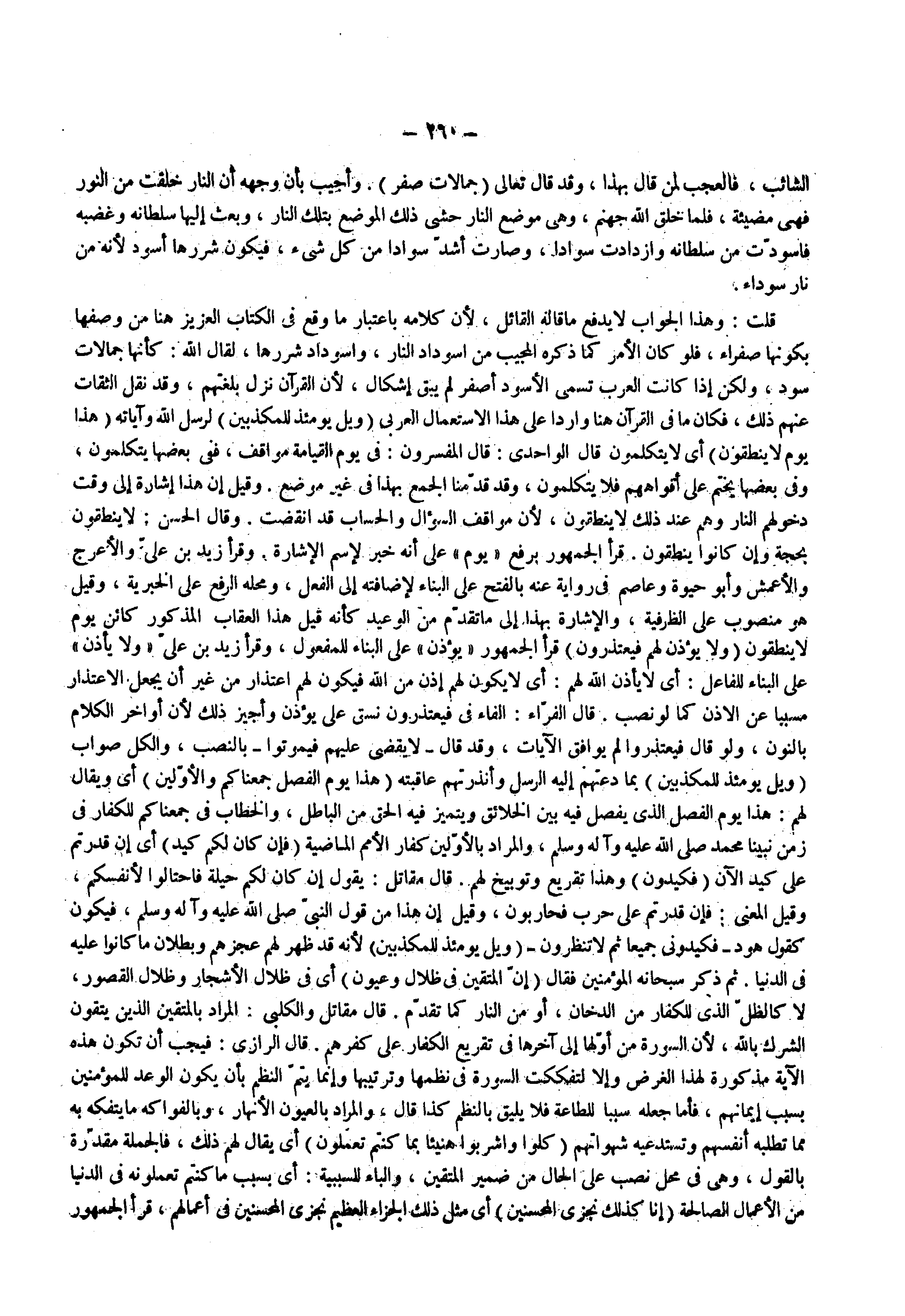 الشائب فالعجب لمن قال بهذا وقد قال تعالى ) جمالة صفر ( وأجيب بأن وجهه أن النار خلقت من النور فهي مضيئة فلما خلق الله جهنم وهي موضع النار حشى ذلك الموضع بتلك النار وبعث إليها سلطانه وغضبه فاسودت من سلطانه وازدادت سوادا وصارت أشد سوادا من كل شيء فيكون شررها أسود لأنه من نار سوداء قلت وهذا الجواب لا يدفع ما قاله القائل لأن كلامه باعتبار ما وقع في الكتاب العزيز هنا من وصفها بكونها صفراء فلو كان الأمر كما ذكره المجيب من اسوداد النار واسوداد شررها لقال الله كأنها جمالات سود ولكن إذا كانت العرب تسمى الأسود أصفر لم يبق إشكال لأن القرآن نزل بلغتهم وقد نقل الثقات عنهم ذلك فكان ما في القرآن هنا واردا على هذا الاستعمال العربي