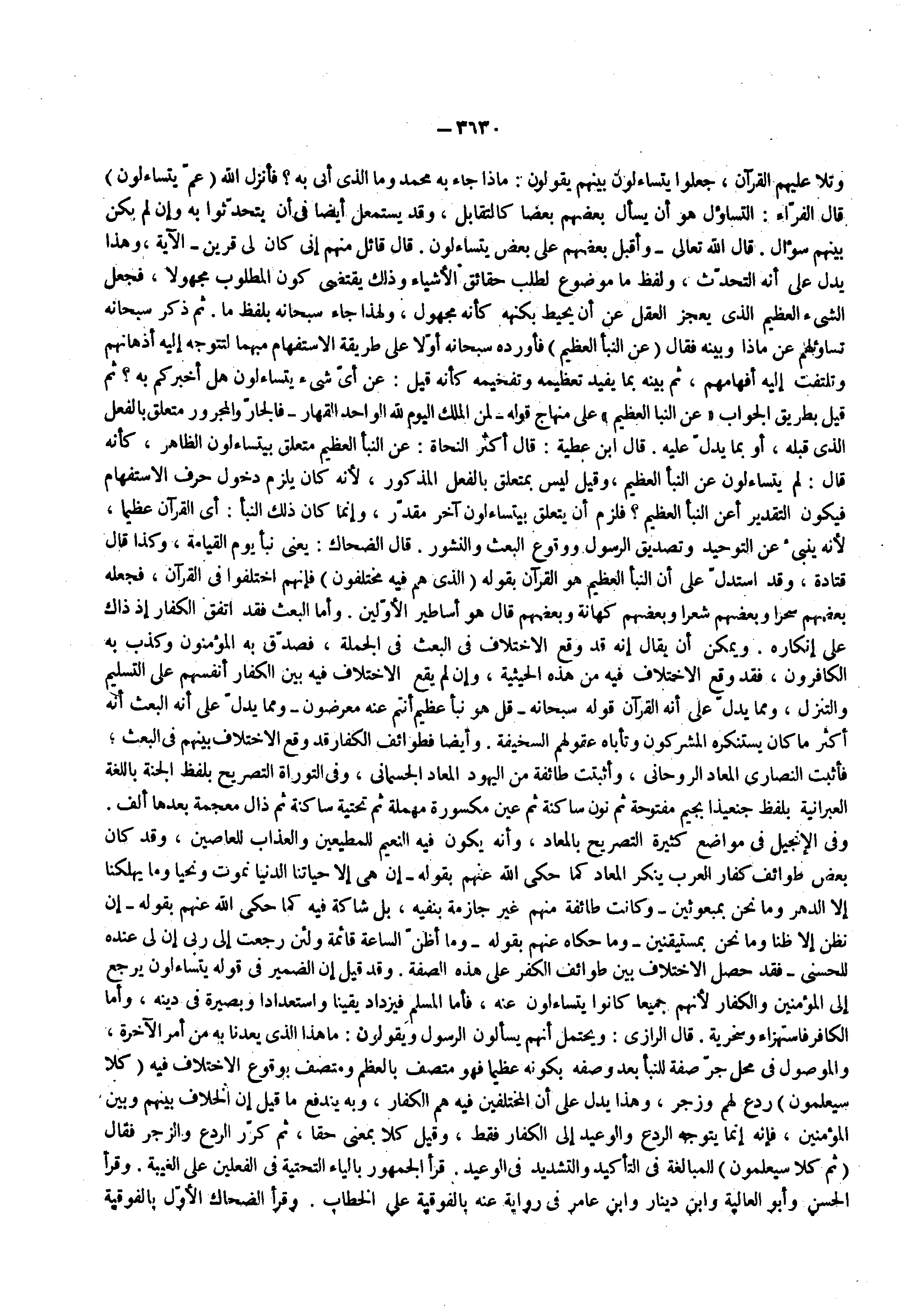 وتلا عليهم القرآن جعلوا يتساءلون بينهم يقولون ماذا جاء به محمد وما الذي أتى به فأنزل الله 0 عم يتساءلون ) قال الفراء التساؤل هو أن يسأل بعضهم بعضا كالتقابل وقد يستعمل أيضا في أن يتحدثوا به وان لم يكن بينهم سؤال قال الله تعالى واقبل بعضهم على بعض يتساءلون قال قائل منهم إنى كان لي قرين الآية وهذا يدل على أنه التحدث ولفظ ما موضوع لطلب حقائق الأشياء وذلك يقتضي كون المطلوب مجهولا فجعل الشي العظيم الذي يعجز العقل عن أن يحيط بكنهة كأنه مجهول ولهذا جاء سبحانه بلفظ ما