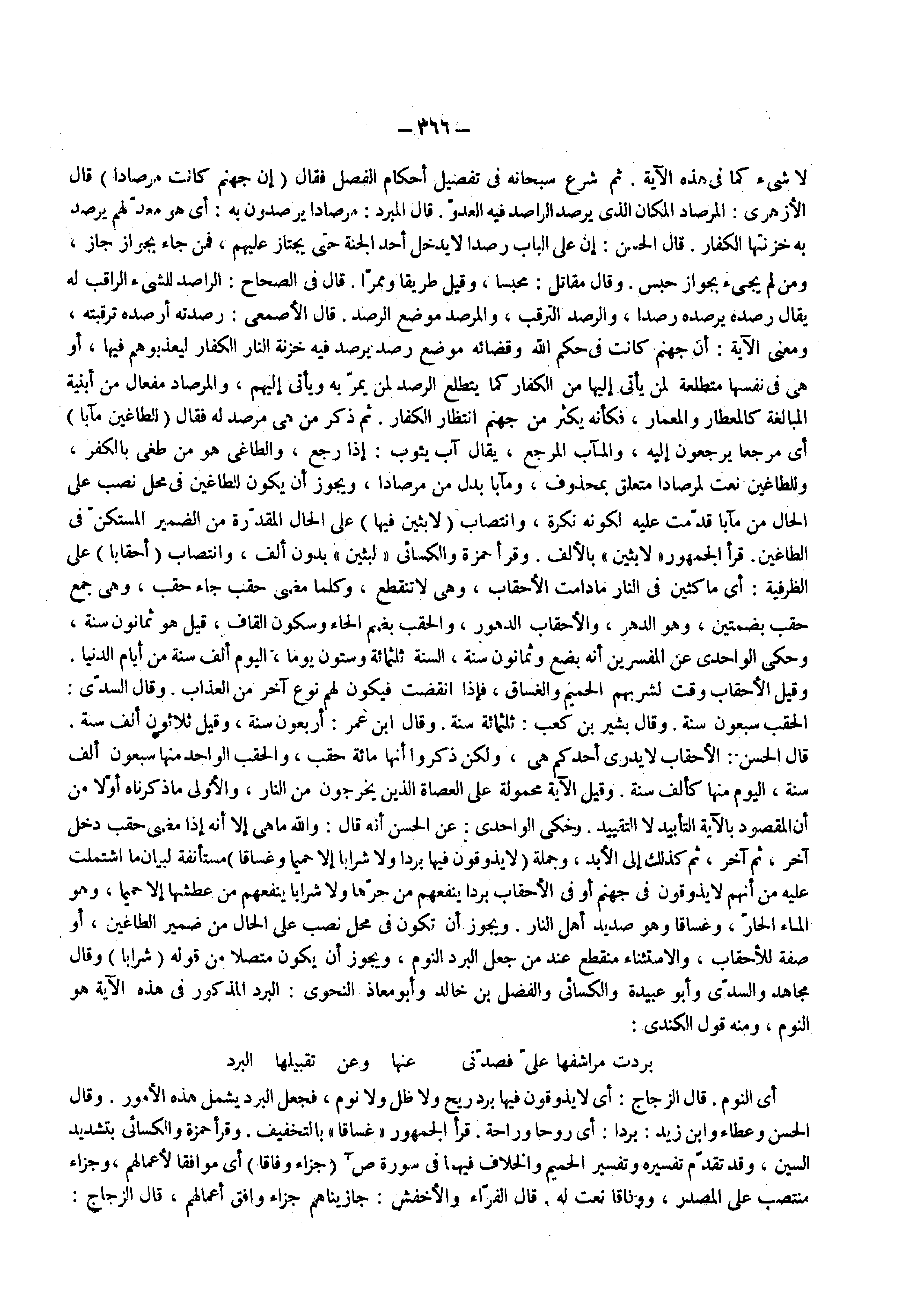وانتصاب ( لابثين فيها ) على الحال المقدرة من الضمير المستكن في الطاغين قرأ الجمهور لابثين بالألف وقرأ حمزة والكسائي لبثين بدون ألف وانتصاب ( أحقابا ) على الظرفية أي ماكثين في النار ما دامت الأحقاب وهي لا تنقطع وكلما مضى حقب جاء حقب وهي جمع حقب بضمتين وهو الدهر والأحقاب الدهور والحقب بضم الحاء وسكون القاف قيل هو ثمانون سنة وحكى الواحدي عن المفسرون أنه بضع وثمانون سنة السنة ثلثمائة وستون يوما اليوم ألف سنة من أيام الدنيا وقيل الأحقاب وقت لشربهم الحميم والغساق فإذا انقضت فيكون لهم نوع آخر من العذاب وقال السدي الحقب سبعون سنة وقال بشير بن كعب ثلثمائة سنة وقال ابن عمر أربعون سنة وقيل ثلاثون ألف سنة قال الحسن الأحقاف لا يدري أحدكم هي ولكن ذكروا أنها مائة حقب والحقب الواحد منها سبعون ألف سنة اليوم منها كألف سنة وقيل الآية محمولة على العصاة الذين يخرجون من النار والأولى ما ذكرناه أولا من أن المقصود بالآية التأبيد لا التقييد وحكى الواحدي عن الحسن أنه قال والله ما هي إلا أنه إذا مضى حقب دخل آخر ثم كذلك إلى الأبد