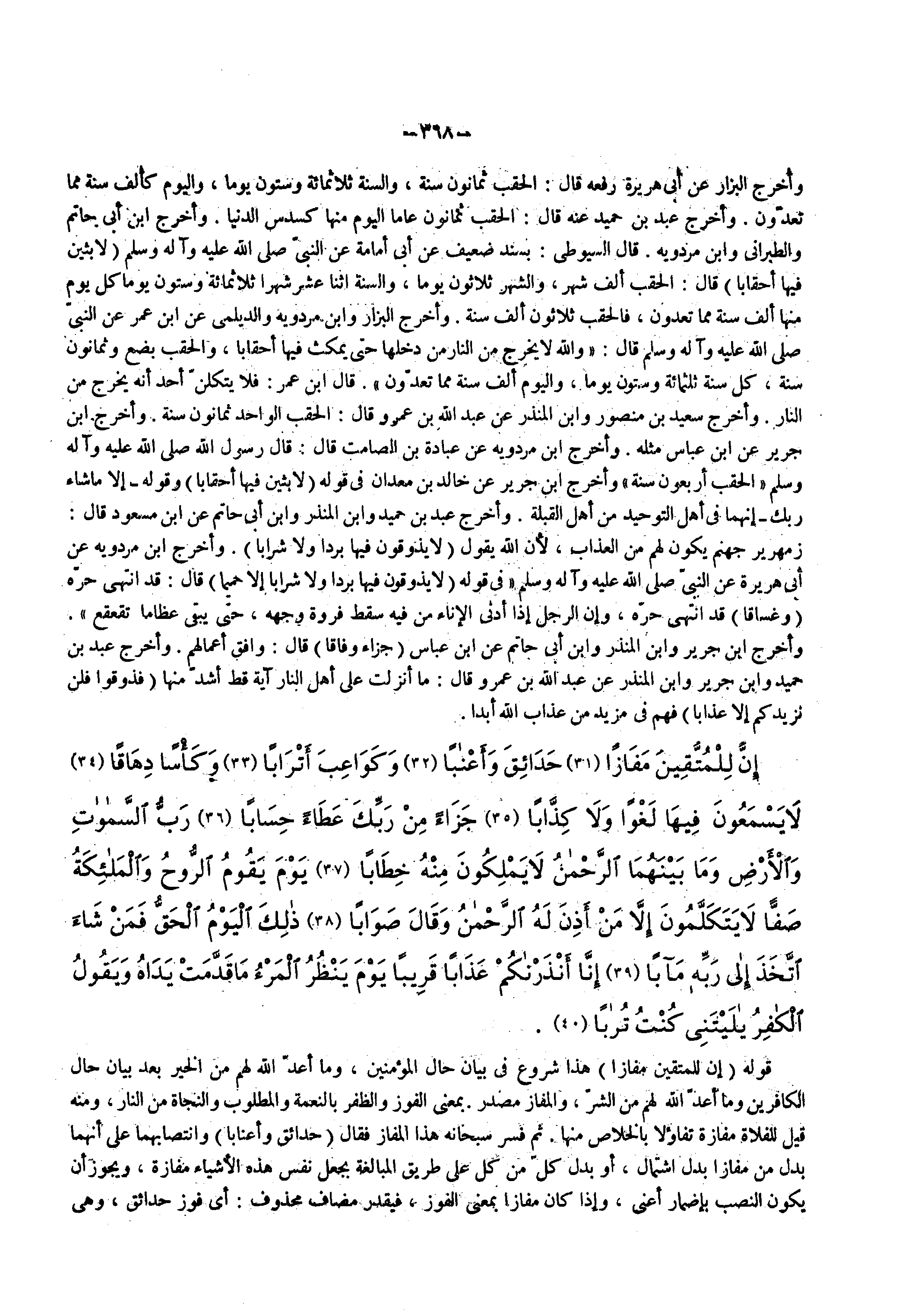 وأخرج البزار عن أبي هريرة رفعه قال الحقب ثمانون سنة والسنة ثلاثمائة وستون يوما واليوم كألف سنة مما تعدون واخرج عبد بن حميد عنه قال الحقب ثمانون عاما اليوم منها كسدس الدنيا واخرج أبن أبي حاتم والطبراني وأبن مردويه قال السيوطي بسند ضعيف عن أبي أمامة عن النبي ( صلى الله عليه وسلم ) ( لابثين فيها أحقابا ) قال الحقب ألف شهر والشهر ثلاثون يوما والسنة اثنا عشر شهرا ثلاثمائة وستون يوما كل يوم منها ألف سنة مما تعدون فالحقب ثلاثون ألف سنة وأخرج البزار وأبن مردويه والديلمي عن أبن عمر عن النبي صلى الله عليه وغله وسلم قال واله يخرج لا تخرج من النار من دخلها حتى يمكث فيها أحقابا والحقب بضع وثمانون سنة كل سنة ثلثمائة وستون يوما واليوم ألف سنة مما تعدون قال أبن عمر فلا يتكلن أحد أنه يخرج من النار أخرج سعيد بن منصور وأبن المنذر عن عبد الله بن عمرو قال الحقب الواحد ثمانون سنة واخرج أبن جرير عن ابن عباس مثله واخرج أبن مردويه عن عبادة بن الصامت قال قال رسول الله ( صلى الله عليه وسلم ) الحقب أربعون سنة واخرج أبن جرير عن خالد بن معدان في قوله ( لابثين فيها أحقابا ) وقوله إلا ما شاء ربك إنهما في أهل التوحيد من اهل القبلة واخرج عبد بن حميد وأبن المنذر وأبن أبي حاتم عن ابن مسعود قال زمهرير جهنم يكون لهم من العذاب لأن الله يقول ( لا يذوقون فيها بردا ولا شرابا ) وأخرج أبن مردويه عن أبي هريرة عن النبي ( صلى الله عليه وسلم ) في قوله ( لايذوقون فيها بردا ولا شرابا إلا حميما ) قال قد انتهى حرة ( وغساقا ) قد انتهى حرة وإن الرجل إذا ادنى الإناء من فيه سقط فروة وجهه حتى يبقى عظاما تقعقع ) وأخرج أبن جرير وابن المنذر وأبن أبي حاتم عن ابن عباس ( جزاء وفاقا ) قال وافق أعمالهم وأخرج عبد بن حميد وأبن جرير وابن المنذر عن عبد الله بن عمرو قال ما أنزلت على أهل النار آية قط أشد منها ( فذوقوا فلن نزيدكم إلا عذابا ) فهم في مزيد من عذاب الله ابدا