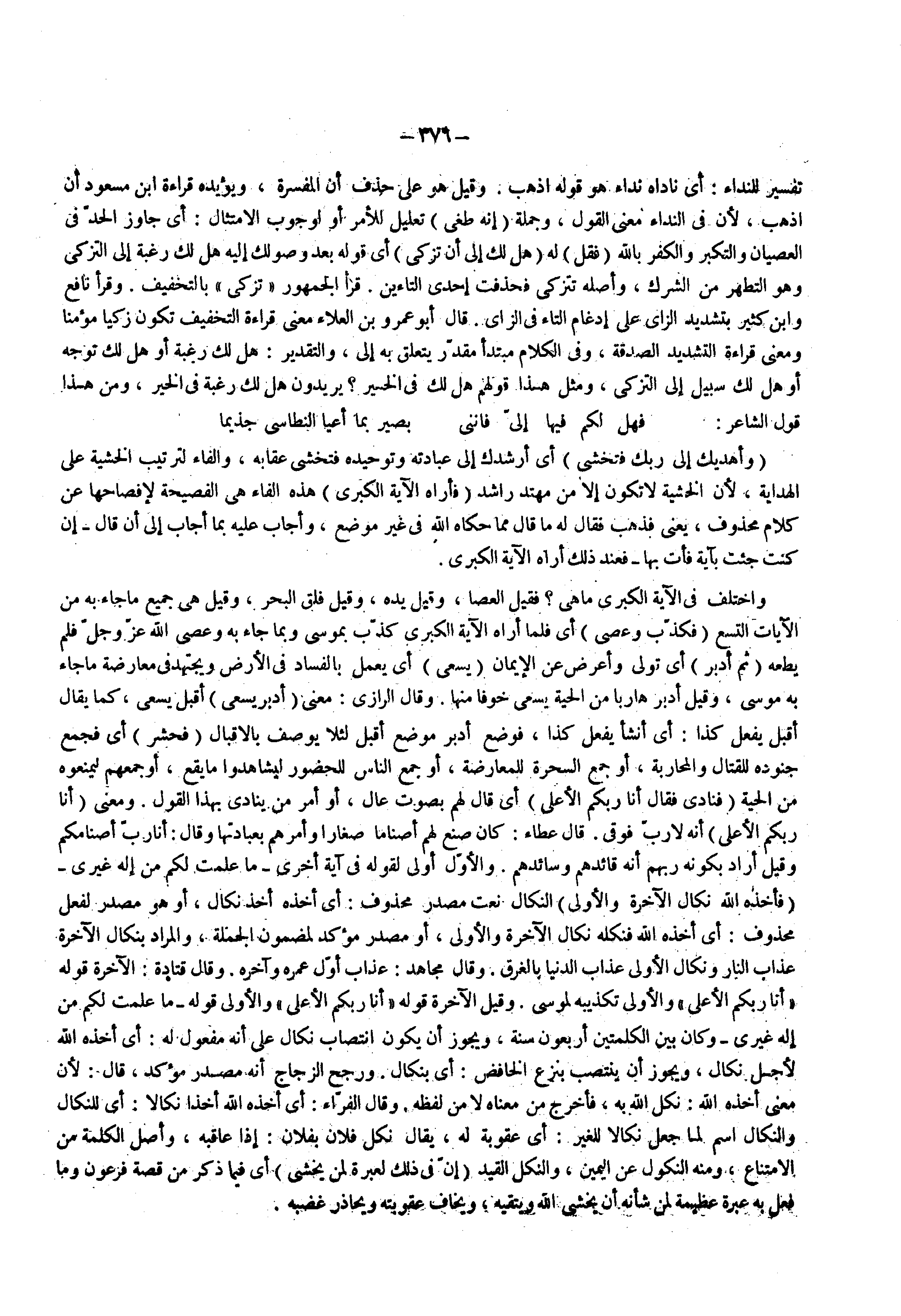 ( فقل ) له ( هل لك إلي ان تزكى ) أي قوله بعد وصولك إليه هل لك رغبة إلى التزكي وهو التطهر من الشرك واصله تتزكى فحذفت احدى التاءين قرأ الجمهور تزكى بالتخفيف وقرا نافع وأبن كثير بتشديد الزاي على إدغام التاء في الزاي قال أبو عمرو بن العلاء معنى قراءة التخفيف تكون زكيا مؤمنا ومعنى قراءة التشديد الصدقة وفي الكلام مبتدأ مقدر يتعلق به إلى والتقدير هل لك رغبة أو هل لك توجه أو هل لك سبيل إلى التزكى ومثل هذا قولهم هل لك في الخير يريدون هل لك رغبة في الخير ومن هذا قول الشاعر فهل لكم فيها إلى فانني