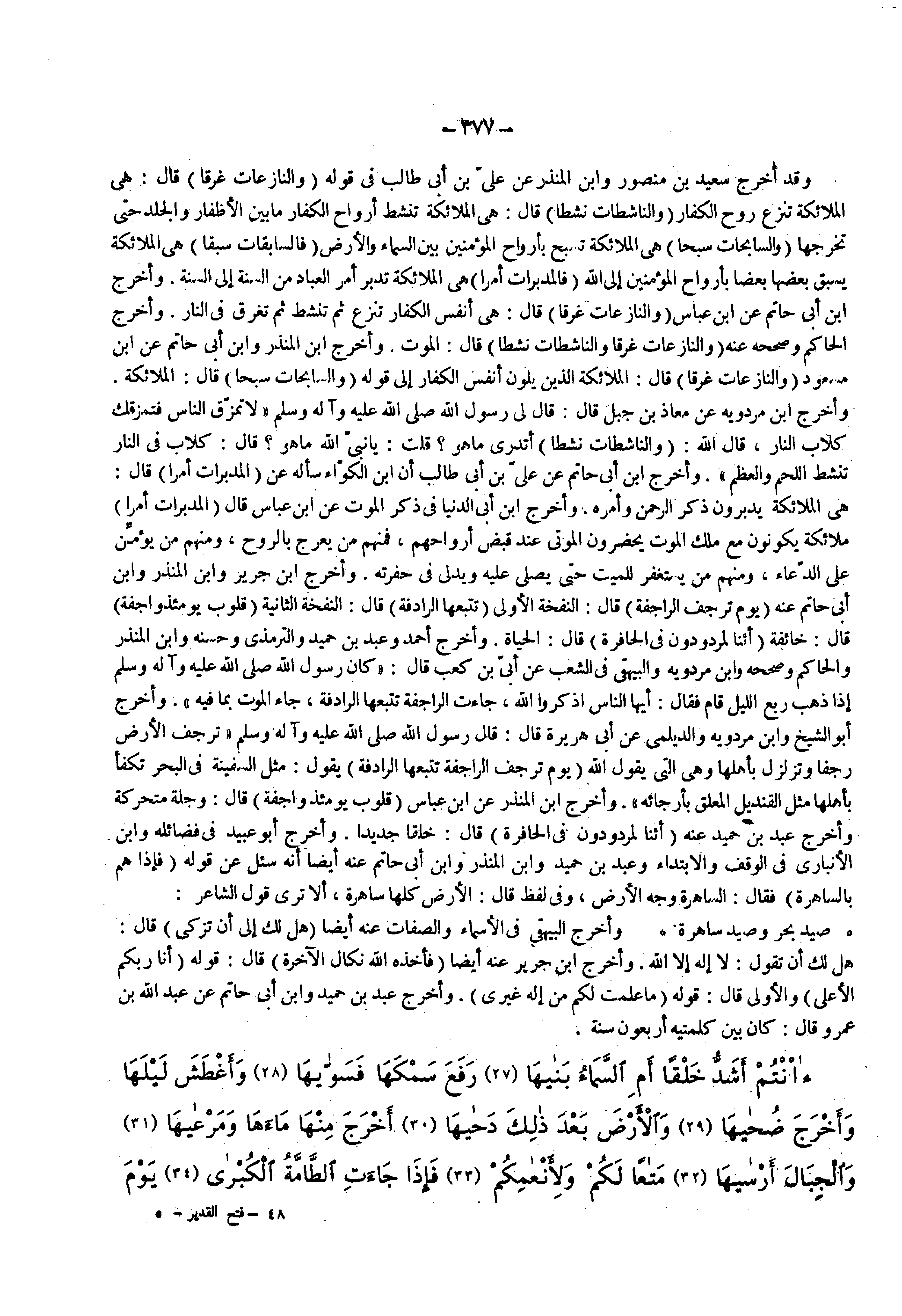 وقد اخرج سعيد بن منصور وابن المنذر عن علي بن أبي طالب في قوله ( والنازعات غرقا ) قال هي الملائكة تنزع روح الكفار ( والناشطات نشطا ) قال هي الملائكة تنشط أرواح الكفار ما بين الأظفار والجلد حتى تخرجها ( والسابحات سبحا ) هي الملائكة تسبح بأرواح المؤمنين بين السماء والأرض ( فالسابقات سبقا ) هي الملائكة يسبق بعضها بعضا بأرواح المؤمنين إلى الله ( فالمدبرات أمرا ) هي الملائكة تدبر امر العباد من السنة إلى السنة وأخرج أبن أبي حاتم عن ابن عباس ( والنازعات غرقا ) قال هي أنفس الكفار تنزع ثم تنشط ثم تغرق في النار واخرج الحاكم وصححه عنه 0 والنازعات غرقا والناشطات نشطا ) قال الموت وأخرج أبن المنذر وأبن أبي حاتم عن ابن مسعود ( والنازعات غرقا ) قال الملائكة الذين يلون أنفس الكفار إلى قوله 0 والسابحات سبحا ) قال الملائكة وأخرج أبن مردويه عن معاذ بن جبل قال قال لي رسول الله ( صلى الله عليه وسلم ) لا تمزق الناس فتمزقك كلاب النار ) قال الله ( والناشطات نشطا ) أتدري ما هو قلت يا نبي الله ما هو قال كلاب في النار تنشط اللحم والعظم وأخرج أبن أبي حاتم عن علي بن أبي طالب أن أبن الكواء سأله عن ( المدبرات أمرا ) قال هي الملائكة يدبرون ذكر الرحمن وأمره وأخرج أبن أبي الدنيا في ذكر الموت عن أبن عباس قال ( المدبرات أمرا ) ملائكة يكونون مع ملك الموت يحضرون الموتى عند قبض أرواحهم فمنهم من يعرج بالروح ومنهم من يؤمن على الدعاء ومنهم من يستغفر للميت حتى يصلي عليه ويدلي في حفرته وأخرج أبن جرير وأبن المنذر وأبن أبي حاتم عنه ( يوم ترجف الراجفة ) قال النفخة الأولى ( تتبعها الرادفة ) قال النفخة الثانية ( قلوب يومئذ واجفة ) قال خائفة ( أئنا لمردودون في الحافرة ) قال الحياة وأخرج أحمد وعبد بن حميد والترمذي وحسنه وأبن المنذر والحاكم وصححه وأبن مردويه والبيهقي في الشعب عن أبي كعب قال كان رسول الله ( صلى الله عليه وسلم ) إذا ذهب ربع الليل قام فقال أيها الناس أذكروا الله جاءت الراجفة تتبعها الرادفة جاء الموت بما فيه وأخرج أبو الشيخ وأبن مردويه والديلمي عن أبي هريرة قال قال رسول الله ( صلى الله عليه وسلم ) ترجف الأرض رجفا وتزلزل بأهلها وهي التي يقول الله ( يوم ترجف الراجفة تتبعها الرادفة ) يقول مثل السفينة في البحر تكفأ بأهلها مثل القنديل المعلق بأرجائه واخرج أبن المنذر عن ابن عباس ( قلوب يومئذ واجفه ) قال وجلة متحركة وأخرج عبد بن حميد عنه ( أئنا لمردودون في الحافرة ) قال خلقا جديدا واخرج أبو عبيد في فضائله وأبن الأنباري في الوقف والابتداء وعبد بن حميد وابن المنذر وأبن أبي حاتم عنه أيضا أنه سئل عن قوله ( فإذا هم بالساهرة ) فقال الساهرة وجه الأرض وفي لفظ قال الأرض كلها ساهرة ألا ترى قول الشاعر صيد بحر وصيد ساهرة