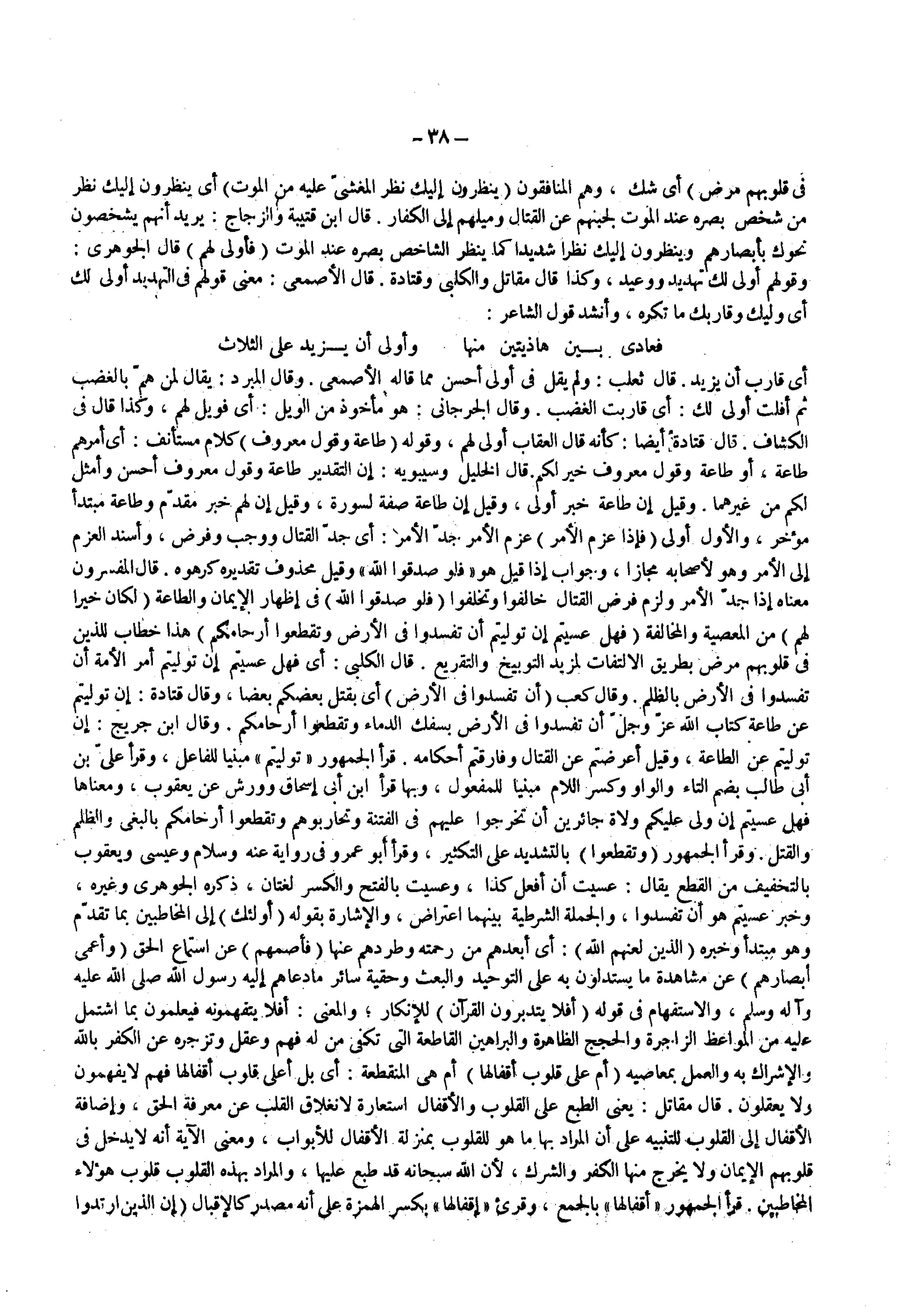 ( فهل عسيتم إن توليتم أن تفسدوا في الأرض وتقطعوا أرحامكم ) هذا خطاب للذين في قلوبهم مرض بطريق الالتفات لمزيد التوبيخ والتقريع قال الكلبي أي فهل عسيتم إن توليتم أمر الأمة أن تفسدوا في الأرض بالظلم وقال كعب ( إن تفسدوا في الأرض ) أي بقتل بعضكم بعضا وقال قتادة إن توليتم عن طاعة كتاب الله عز وجل أن تفسدوا في الأرض بسفك الدماء وتقطعوا أرحامكم وقال ابن جريج إن توليتم عن الطاعة وقيل أعرضتم عن القتال وفارقتم أحكامه قرأ الجمهور توليتم مبنيا للفاعل وقرأ على بن أبي طالب بضم التاء والواو وكسر اللام مبنيا للمفعول وبها قرأ ابن أبي إسحاق وورش عن يعقوب ومعناها فهل عسيتم أن ولى عليكم ولاة جائرين أن تخرجوا عليهم في الفتنة وتحاربوهم وتقطعوا أرحامكم بالبغي والظلم والقتل وقرأ الجمهور ( وتقطعوا ) بالتشديد على التكثير وقرأ أبو عمرو في رواية عنه وسلام وعيسى ويعقوب بالتخفيف من القطع يقال عسيت أن إفعل كذا وعسيت بالفتح والكسر لغتان ذكره الجوهري وغيره وخبر عسيتم هو أن تفسدوا والجملة الشرطية بينهما اعتراض