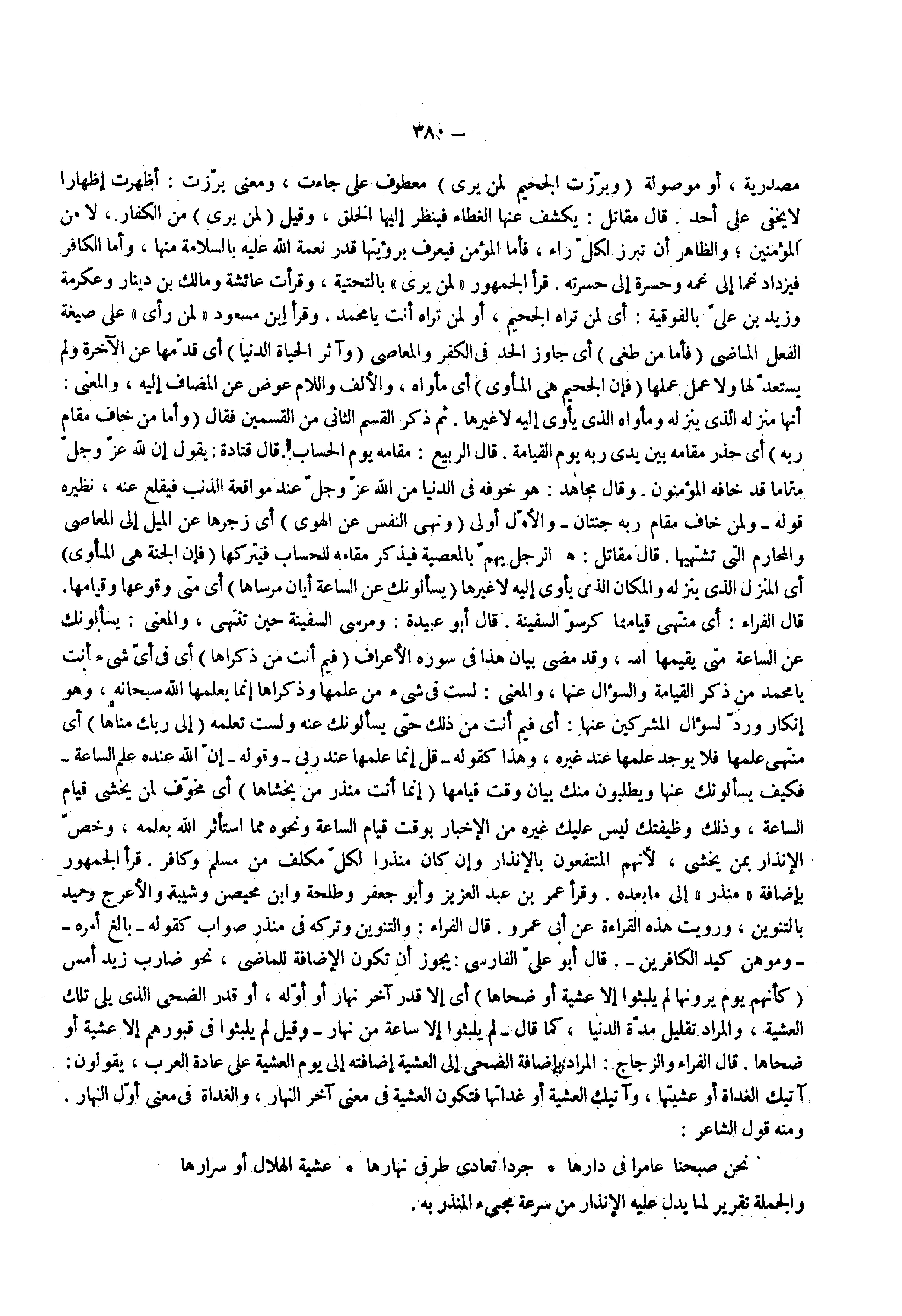 ( كأنهم يوم يرونها لم يلبثوا إلا عشية أو ضحاها ) أي إلا قدر آخر نهار أو أوله أو قدر الضحى الذي يلي تلك العشية والمراد تقليل مدة الدنيا كما قال لم يلبثوا إلا ساعة من نهار وقيل لم يلبثوا في قبورهم إلا عشية أو ضحاها قال الفراء والزجاج المراد بإضافة الضحى إلى العشية إضافة إلى يوم العشية على عادة العرب يقولون آتيك الغداة أو عشيتها وآتيك العشية أو غداتها فتكون العشية في معنى آخر النهار والغداة في معنى أول النهار ومنه قول الشاعر نحن صبحنا عامرا في دارها