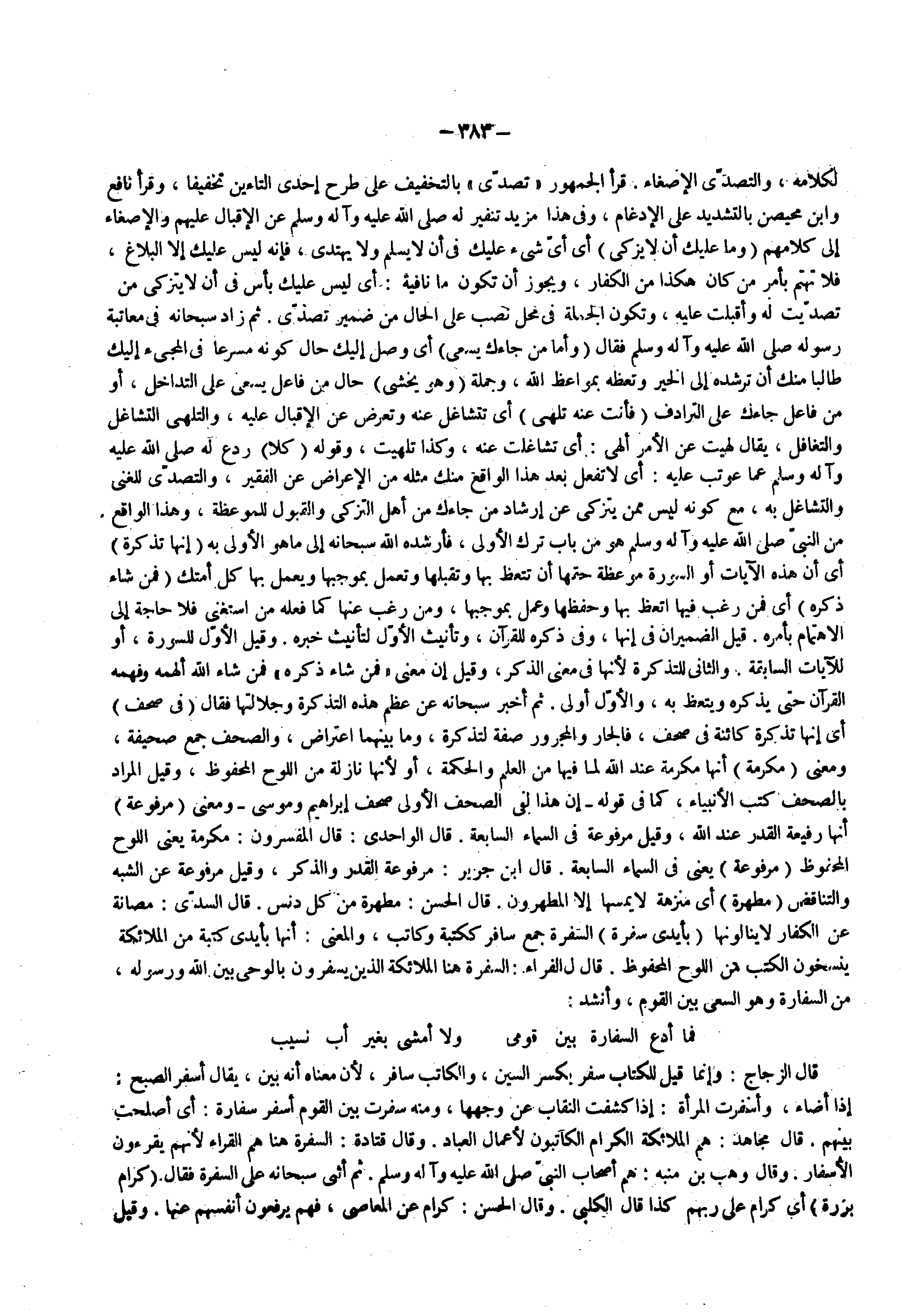 قال الزجاج وإنما قيل للكتاب سفر بكسر السين والكاتب سافر لأن معناه أنه بين يقال أسفر الصبح إذا أضاء وأسفرت المرأة إذا كشفت النقاب عن وجهها ومنه سفرت بين القوم أسفر سفارة أي أصلحت بينهم قال مجاهد هم الملائكة الكرام الكاتبون لأعمال العباد وقال قتادة السفرة هنا هم القراء لأنهم يقرؤون الأسفار وقال وهب بن منبه هم أصحاب النبي ( صلى الله عليه وسلم )