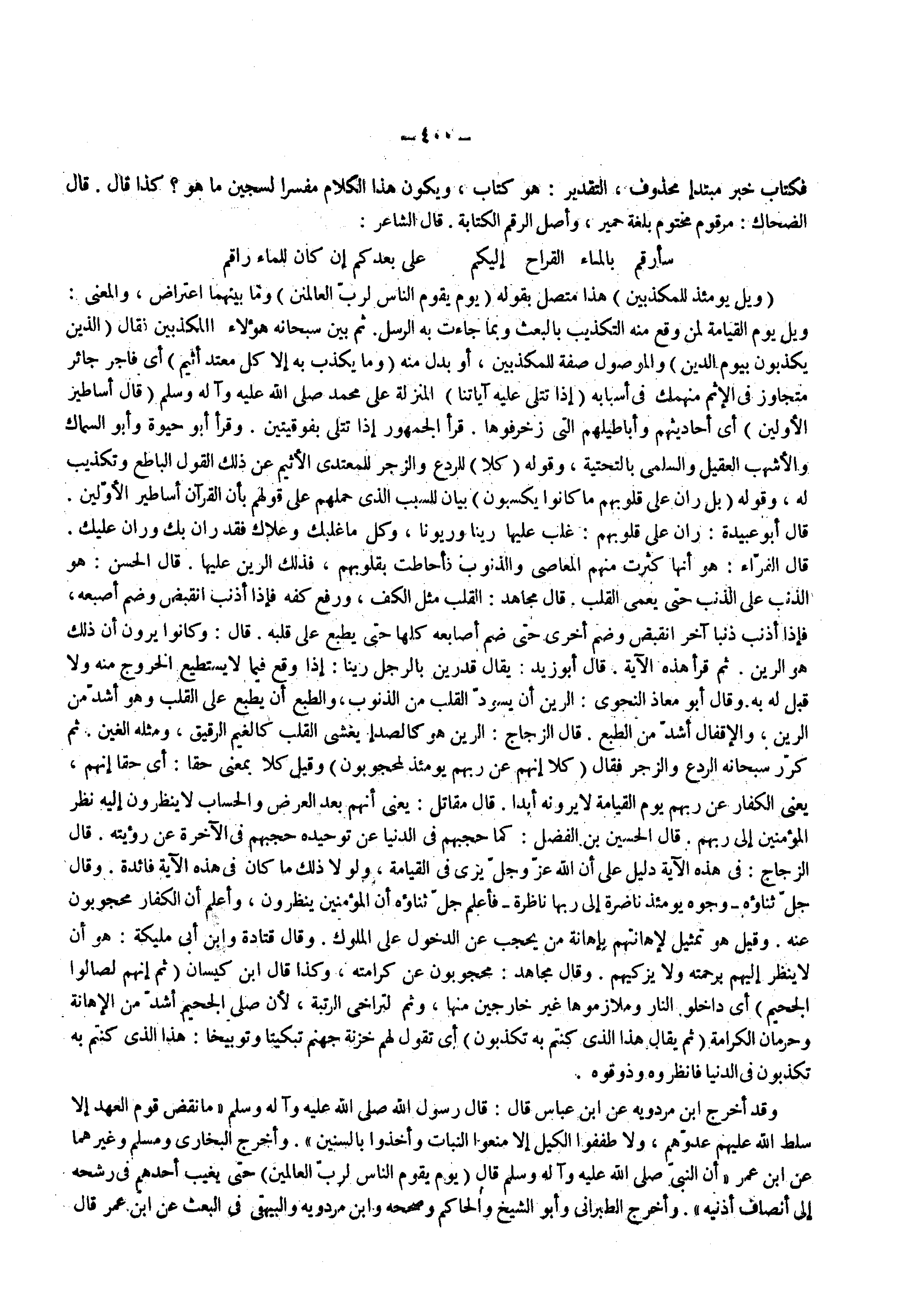 وقد أخرج ابن مردويه عن ابن عباس قال قال رسول الله ( صلى الله عليه وسلم ) ما نقض قوم العهد إلا سلط الله عليهم عدوهم ولا طففوا الكيل إلا منعوا النبات وأخذوا بالسنين وأخرج البخاري ومسلم وغيرهما عن ابن عمر أن النبي ( صلى الله عليه وسلم ) قال ( يوم يقوم الناس لرب العالمين ) حتى يغيب أحدهم في رشحه إلى أنصاف أذنيه وأخرج الطبراني وأبو الشيخ والحاكم وصححه وابن مردويه والبيهقي في البعث عن ابن عمر قال