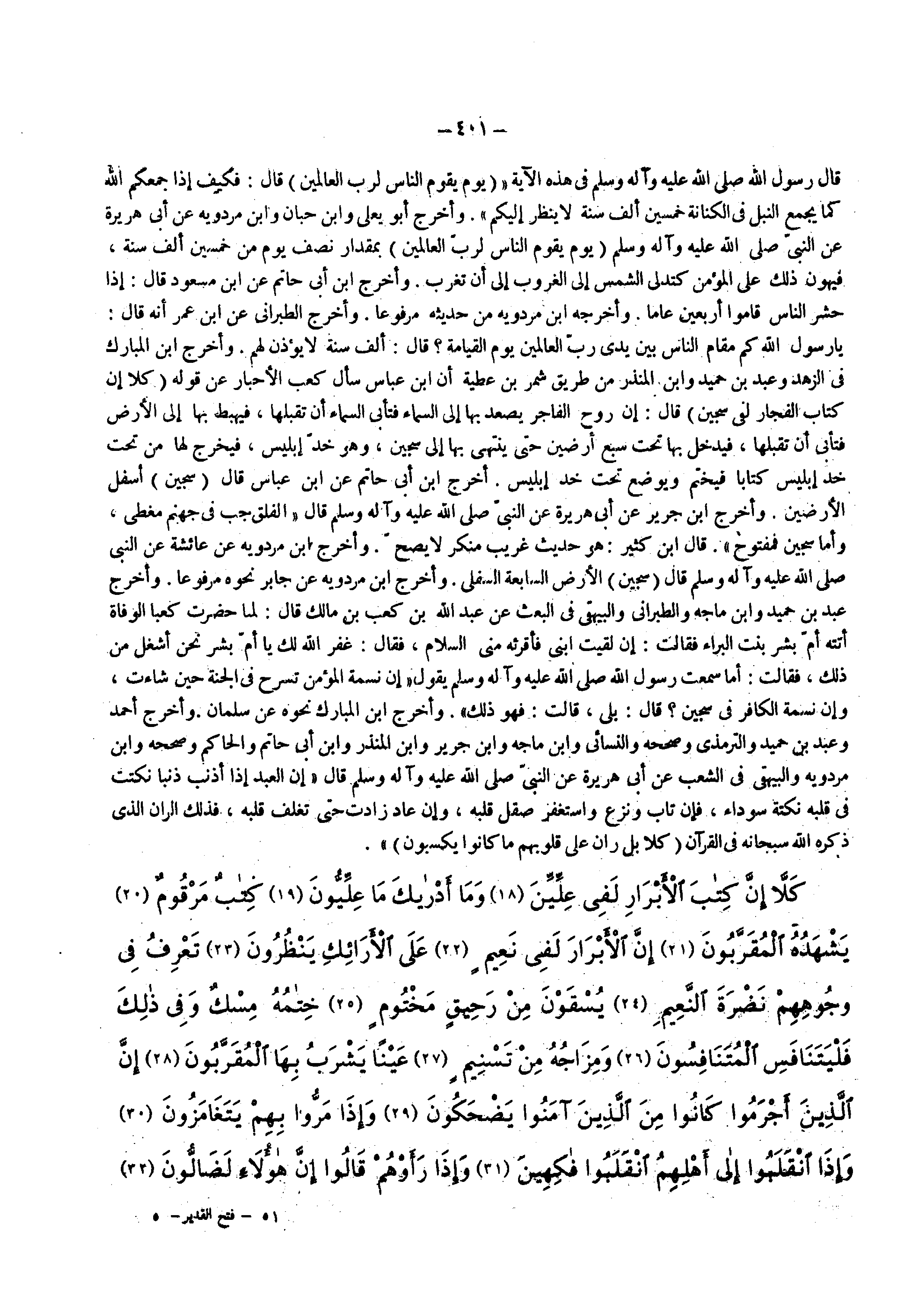 قال رسول الله ( صلى الله عليه وسلم ) في هذه الآية ( يوم يقوم الناس لرب العالمين ) قال فكيف إذا جمعكم الله كما يجمع النبل في الكنانة خمسين ألف سنة لا ينظر إليكم وأخرج أبو يعلى وابن حبان وابن مردويه عن أبي هريرة عن النبي ( صلى الله عليه وسلم ) ( يوم يقوم الناس لرب العالمين ) بمقدار نصف يوم من خمسين ألف سنة فيهون ذلك على المؤمن كتدلى الشمس إلى الغروب إلى أن تغرب وأخرج ابن أبي حاتم عن ابن مسعود قال إذا حشر الناس قاموا أربعين عاما وأخرجه ابن مردويه من حديثه مرفوعا وأخرج الطبراني عن ابن عمر أنه قال يا رسول الله كم مقام الناس بين يدي رب العالمين يوم القيامة قال ألف سنة لا يؤذن لهم وأخرج ابن المبارك في الزهد وعبد بن حميد وابن المنذر من طريق شمر بن عطية أن ابن عباس سأل كعب الأحبار عن قوله ( كلا إن كتاب الفجار لفي سجين ) قال إن روح الفاجر يصعد بها إلى السماء فتأبى السماء أن تقبلها فيهبط بها إلى الأرض فتأبى أن تقبلها فيدخل بها تحت سبع أرضين حتى ينتهي بها إلى سجين وهو خد إبليس فيخرج لها من تحت خد إبليس كتابا فيختم ويوضع تحت خد إبليس أخرج ابن أبي حاتم عن ابن عباس قال ( سجين ) أسفل الأرضين وأخرج ابن جرير عن أبي هريرة عن النبي ( صلى الله عليه وسلم ) قال الفلق جب في جهنم مغطى وأما سجين فمفتوح قال ابن كثير هو حديث غريب منكر لا يصح وأخرج ابن مردويه عن عائشة عن النبي ( صلى الله عليه وسلم ) قال ( سجين ) الأرض السابعة السفلى وأخرج ابن مردويه عن جابر نحوه مرفوعا وأخرج عبد بن حميد وابن ماجه والطبراني والبيهقي في البعث عن عبد الله بن كعب بن مالك قال لما حضرت كعبا الوفاة أتته أم بشر بنت البراء فقالت إن لقيت ابني فأقرئيه منى السلام فقال غفر الله لك يا أم بشر نحن أشغل من ذلك فقالت أما سمعت رسول الله ( صلى الله عليه وسلم ) يقول إن نسمة المؤمن تسرح في الجنة حين شاءت وإن نسمة الكافر في سجين قال بلى قالت فهو ذلك وأخرج ابن المبارك نحوه عن سلمان وأخرج أحمد وعبد بن حميد والترمذى وصححه والنسائي وابن ماجه وابن جرير وابن المنذر وابن أبي حاتم والحاكم وصححه وابن مردويه والبيهقي في الشعب عن أبي هريرة عن النبي ( صلى الله عليه وسلم ) قال إن العبد إذا أذنب ذنبا نكتت في قلبه نكتة سوداء فإن تاب ونزع واستغفر صقل قلبه وإن عاد زادت حتى تغلف قلبه فذلك الران الذي ذكره الله سبحانه في القرآن ( كلا بل ران على قلوبهم ما كانوا يكسبون ) سورة المطففين من ( 18 36 )