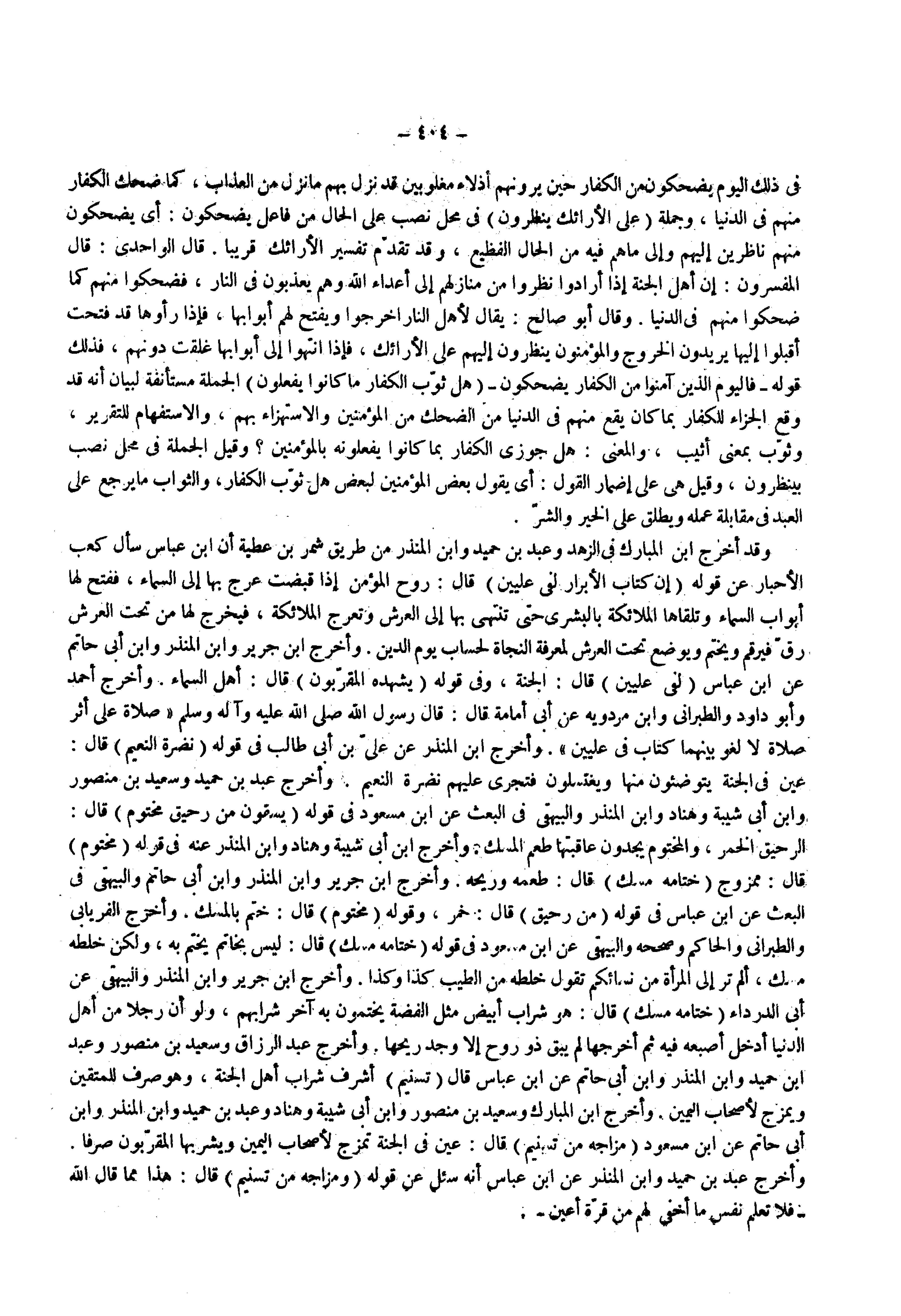 وقد أخرج أبن المبارك في الزهد وعبد بن حميد وأبن المنذر من طريق شمر بن عطية أن ابن عباس سأل كعب الأحبار عن قوله ( إن كتاب الأبرار لفي عليين ) قال روح المؤمن إذا قبضت عرج بها إلى السماء ففتح لها أبواب السماء وتلقاها الملائكة بالبشرى حتى تنتهي بها إلى العرش وتعرج الملائكة فيخرج لها من تحت العرش رق فيرقم ويختم ويوضع تحت العرش لمعرفة النجاة لحساب يوم الدين واخرج أبن جرير وأبن المنذر وأبن أبي حاتم عن أبن عباس ( لفي عليين ) قال الجنة وفي قوله ( يشهده المقربون ) قال أهل السماء وأخرج أحمد وأبو داود والطبراني وأبن مردويه عن أبي أمامة قال قال رسول الله ( صلى الله عليه وسلم ) صلاة على أثر صلاة لا لغو بينهما كتاب في عليين واخرج أبن المنذر عن علي بن أبي طالب في قوله 0 نضرة النعيم ) قال عين في الجنة يتوضئون منها ويغتسلون فتجرى عليهم نضرة النعيم وأخرج عبد بن حميد وسعيد بن منصور وأبن أبي شيبة وهناد وأبن المنذر والبهيقي في البعث عن أبن مسعود في قوله ( يسقون من رحيق مختوم ) قال الرحيق الخمر والمختوم يجدون عاقبتها طعم المسك وأخرج أبن أبي شيبة وهناد وأبن المنذر عنه في قوله 0 مختوم ) قال ممزوج ( ختامة مسك ) قال طعمه وريحه واخرج أبن جرير وأبن المنذر وأبن أبي حاتم والبيهقي في البعث عن أبن عباس في قوله 0 من رحيق ) قال خمر وقوله ( مختوم ) قال ختم بالمسك وأخرج الفريابي والطبراني والحاكم وصححه والبيهقي عن أبن مسعود في قوله ( ختامه مسك قال ليس بخاتم يختم به ولكن خلطه مسك ألم تر إلى المرأة من نسائكم تقول خلطه من الطيب كذا وكذا وأخرج أبن جرير وابن المنذر والبيهقي عن أبي الدرداء ( ختامه مسك ) قال هو شراب أبيض مثل الفضة يختمون به آخر شرابهم ولو أن رجلا من أهل الدنيا أدخل أصبعه فيه ثم أخرجها لم يبق ذو روح إلا وجد ريحها وأخرج عبد الرزاق وسعيد بن منصور وعبد أبن حميد وأبن المنذر وأبن أبي حاتم عن أبن عباس قال ( تسنيم ) أشرف شراب أهل الجنة وهو صرف للمتقين ويمزج لأصحاب اليمين واخرج أبن المبارك وسعيد بن منصور وأبن أبي شيبة وهناد وعبد بن حميد وأبن المنذر وأبن أبي حاتم عن أبن مسعود ( مزاجه من تسنيم ) قال عين في الجنة تمزج لأصحاب اليمين ويشربها المقربون صرفا واخرج عبد بن حميد وأبن المنذر عن ابن عباس أنه سئل عن قوله ( ومزاجه من تسنيم ) قال هذا مما قال الله فلا تعلم نفس ما اخفى لهم من قرة اعين