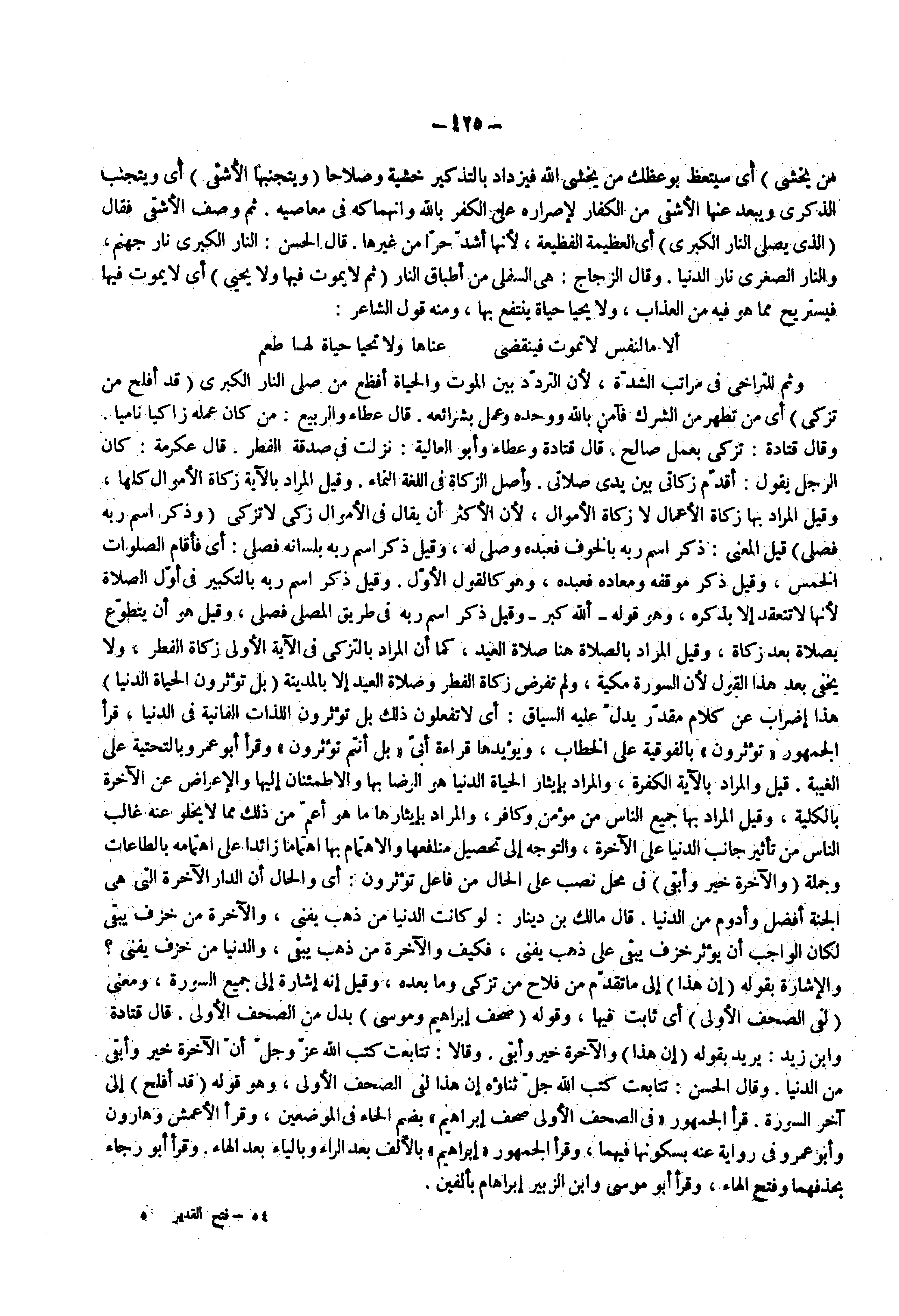 ) قد أفلح من تزكى ( أي من تطهر من الشرك فامن بالله ووحده وعمل بشرائعة قال عطاء والربيع من كان عمله زاكيا ناميا وقال قتادة تزكى بعمل صالح قال قتادة وعطاء وأبو العالية نزلت في صدقة الفطر قال عكرمة كان الرجل يقول أقدم زكاتي بين يدي صلاتي وأصل الزكاة في اللغة النماء وقيل المراد بالاية زكاة الأموال كلها وقيل المراد بها زكاة الأعمال لا زكاة الأموال لأن الأكثر أن يقال في الأموال زكى لا تزكى