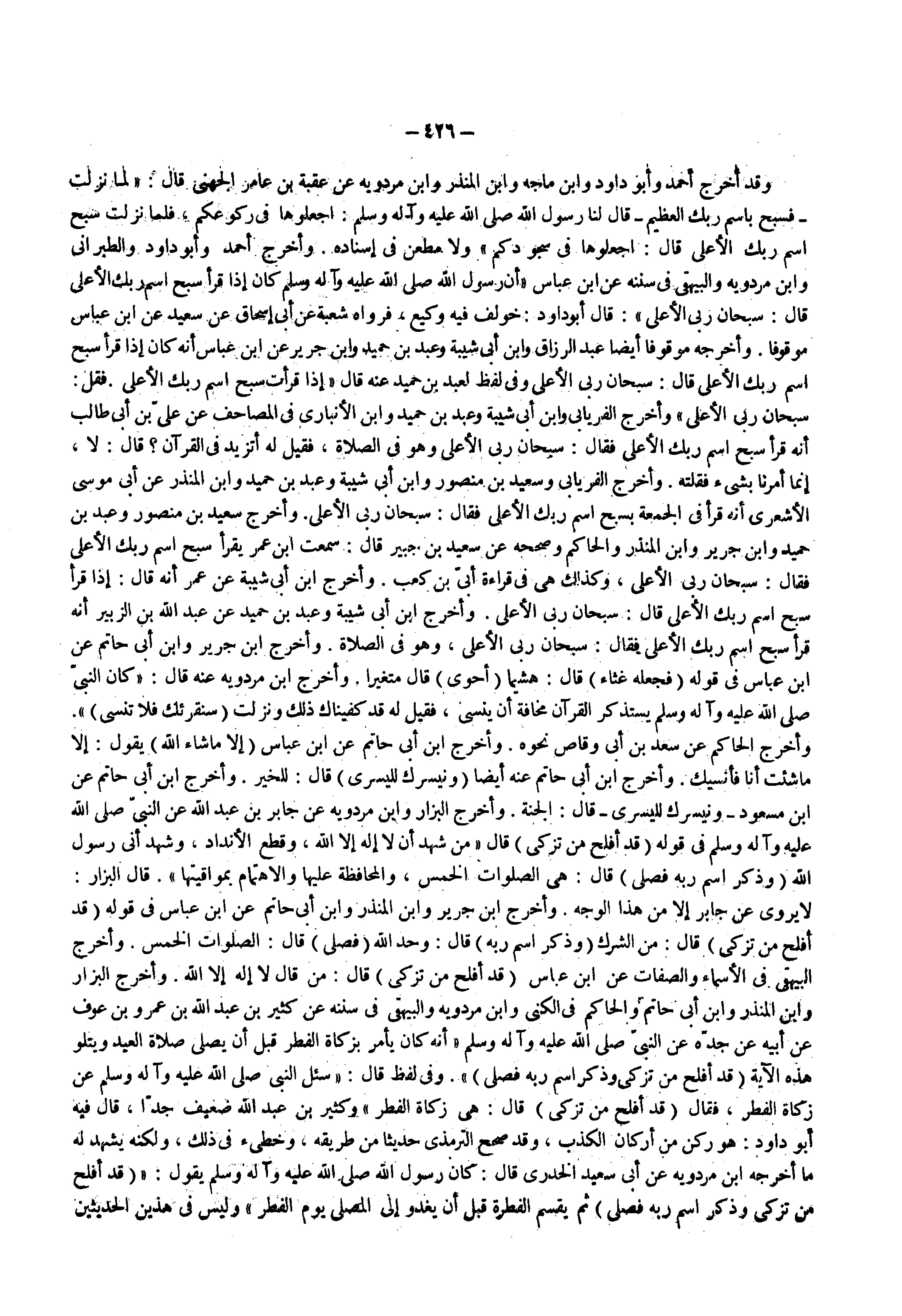 وقد أخرج أحمد وأبو داود وابن ماجه وابن المنذر وابن مردويه عن عقبة بن عامر الجهني قال لما نزلت فسبح باسم ربك العظيم قال لنا رسول الله صلى الله عليه واله وسلم اجعلوها في ركوعكم فلما نزلت سبح اسم ربك الأعلى قا 4 ل اجعلوها في سجودكم ولا مطعن في إسناده وأخرج أحمد وأبو داود والطبراني وابن مردويه والبيهقي في سننه عن ابن عباس أن رسول الله صلى الله عليه واله وسلم كان إذا قرأ سبح اسم ربك الأعلى قال سبحان ربي الأعلى قال أبو داود خولف فيه وكيع فرواه شعبة عن أبي إسحاق عن سعيد عن ابن عباس موقوفا وأخرجه موقوفا أيضا عبد الرزاق وابن أبي شيبة وعبد بن حميد وابن جرير عن ابن عباس أنه كان إذا قرأ سبح اسم ربك الأعلى قال سبحان ربي الأعلى وفي لفظ لعبد بن حميد عنه قال إذا قرأت سبح اسم ربك الأعلى فقل سبحان ربي الأعلى وأخرج الفريابي وابن أبي شيبة وعبد بن حميد وابن الأنباري في المصاحف عن علي بن أبي طالب أنه قرأ سبح اسم ربك الأعلى فقال سبحان ربي الأعلى وهو في الصلاة فقيل له أتزيد في القران قال لا إنما أمرنا بشيء فقلته وأخرج الفريابي وسعيد بن منصور وابن أبي شيبة وعبد بن حميد وابن المنذر عن أبي موسى الأشعري أنه قرأ في الجمعه بسبح اسم ربك الأعلى فقال سبحان ربي الأعلى وأخرج سعيد بن منصور وعبد بن حميد وابن جرير وابن المنذر والحاكم وصححه عن سعيد بن جبير قال سمعت ابن عمر يقرأ سبح اسم ربك الأعلى فقال سبحان ربي الأعلى وكذلك هي في قراءة أبي بن كعب وأخرج ابن أبي شيبة عن عمر أنه قال إذا قرأ سبح اسم ربك الأعلى قال سبحان ربي الأعلى وأخرج ابن أبي شيبة وعبد بن حميد عن عبد الله بن الزبير أنه قرأ سبح اسم ربك الأعلى فقال سبحان ربي الأعلى وهو في الصلاة وأخرج ابن جرير وابن أبي حاتم عن ابن عباس في قوله ) فجعله غثاء ( قال هشيما ) أحوى ( قال متغيرا وأخرج ابن مردويه عنه قال كان النبي صلى الله عليه واله وسلم يستذكر القران مخافة أن ينسى فقيل له قد كفيناك ذلك ونزلت ) سنقرئك فلا تنسى ( وأخرج الحاكم عن سعد بن أبي وقاص نحوه وأخرج ابن أبي حاتم عن ابن عباس ) إلا ما شاء الله ( يقول إلا ما شئت أنا فأنسيك وأخرج ابن أبي حاتم عنه أيضا ) ونيسرك لليسرى ( قال للخير وأخرج ابن أبي حاتم عن ابن مسعود ونيسرك لليسرى قال الجنة وأخرج البزار وابن مردويه عن جابر بن عبد الله عن النبي صلى الله عليه واله وسلم في قوله ) قد أفلح من تزكى ( قال من شهد أن لا إله إلا الله وقطع الأنداد وشهد إني رسول الله ) وذكر اسم ربه فصلى ( قال هي الصلوات الخمس والمحافظة عليها والاهتمام بمواقيتها قال البزار لا يروي عن جابر إلا من هذا الوجه وأخرج ابن جرير وابن المنذر وابن أبي حاتم عن ابن عباس في قوله ) قد أفلح من تزكى ( قال من الشرك وذكر اسم ربه قال وحد الله فصلى قال الصلوات الخمس وأخرج البيهقي في الأسماء والصفات عن ابن عباس ) قد أفلح من تزكى ( قال من قال لا إله إلا الله وأخرج البزار وابن المنذر وابن أبي حاتم والحاكم في الكنى وابن مردويه والبيهقي في سننه عن كثير بن عبد الله بن عمرو بن عوف عن أبيه عن جده عن النبي صلى الله عليه واله وسلم أنه كان يأمر بزكاة الفطر قبل أن يصلي صلاة العيد ويتلو هذه الاية ) قد أفلح من تزكى وذكر اسم ربه فصلى ( وفي لفظ قال سئل النبي صلى الله عليه واله وسلم عن زكاة الفطر فقال ) قد أفلح من تزكى ( قال هي زكاة الفطر وكثير بن عبد الله ضعيف جدا قال فيه أبو داود هو ركن من أركان الكذب وقد صحح الترمذي حديثا من طريقه وخطىء في ذلك ولكنه يشهد له ما أخرجه ابن مردويه عن أبي سعيد الخدري قال كان رسول الله صلى الله عليه واله وسلم يقول ) قد أفلح من تزكى وذكر اسم ربه فصلى ( ثم يقسم الفطرة قبل أن يغدو إلى المصلى يوم الفطر وليس في هذين الحديثين