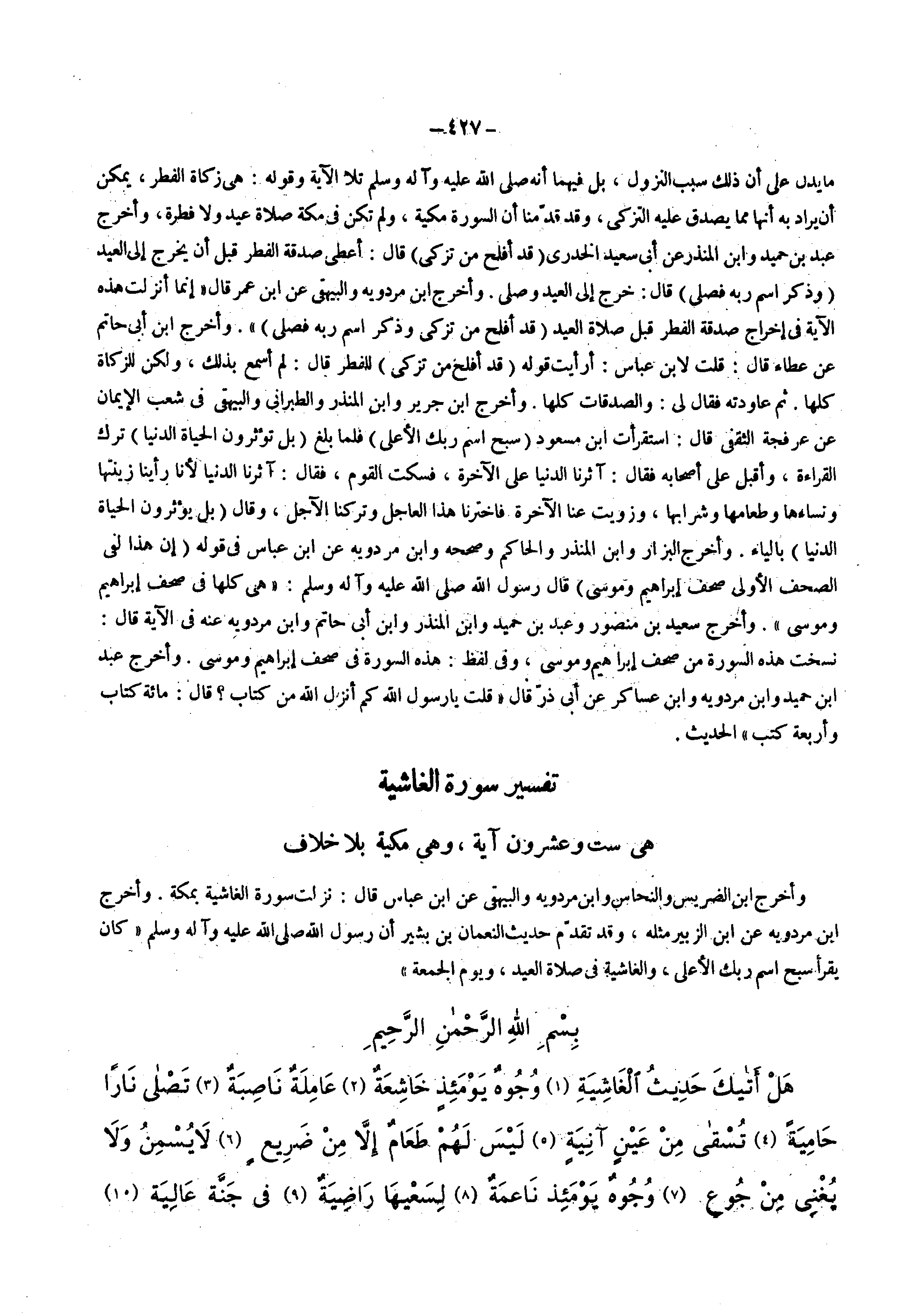 وأخرج ابن الضريس والنحاس وابن مردويه والبيهقي عن ابن عباس قال نزلت سورة الغاشية بمكة وأخرج ابن مردويه عن ابن الزبير مثله وقد تقدم حديث النعمان بن بشير أن رسول الله صلى الله عليه واله وسلم كان يقرأ سبح اسم ربك الأعلى والغاشية في صلاة العيد ويوم الجمعه بسم الله الرحمن الرحيم سورة الغاشية ( 1 26 )