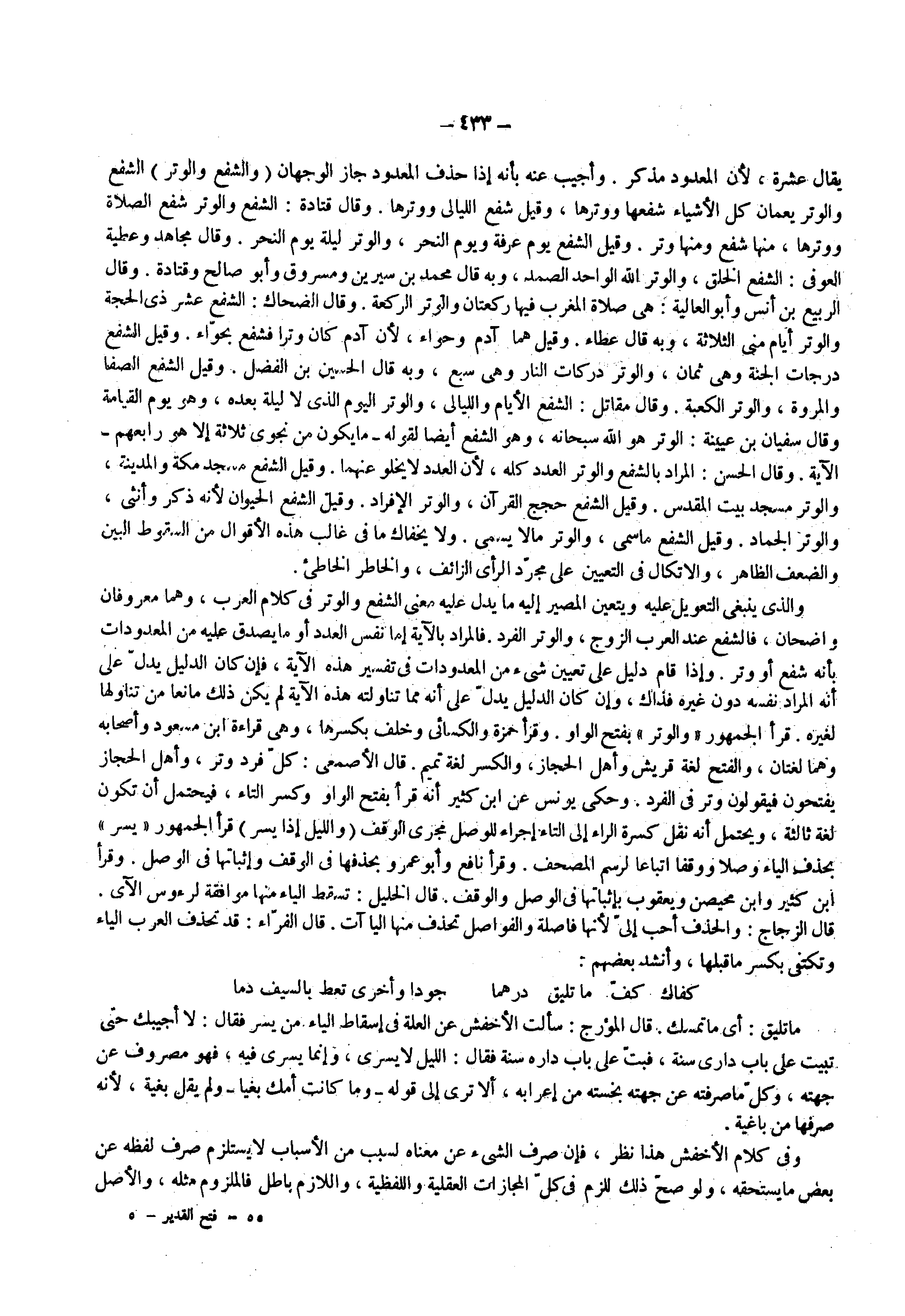 والذي ينبغي التعويل عليه ويتعين المصير إليه ما يدل عليه معنى الشفع والوتر في كلام العرب وهما معروفان واضحان فالشفع عند العرب الزوج والوتر الفرد فالمراد بالاية إما نفس العدد أو ما يصدق عليه من المعدودات بأنه شفع أو وتر وإذا قام دليل على تعيين شيء من المعدودات في تفسير هذه الاية فإن كان الدليل يدل على أنه المراد نفسه دون غيره فذاك وإن كان الدليل يدل على أنه مما تناولته هذه الاية لم يكن ذلك مانعا من تناولها لغيره قرأ الجمهور والوتر بفتح الواو وقرأ حمزه والكسائي وخلف بكسرها وهي قراءة ابن مسعود وأصحابه وهما لغتان والفتح لغة قريش وأهل الحجاز والكسر لغة تميم قال الأصمعي كل فرد وتر وأهل الحجاز يفتحون فيقولون وتر في الفرد وحكى يونس عن ابن كثير أنه قرأ بفتح الواو وكسر التاء فيحتمل أن تكون لغة ثالثة ويحتمل أنه نقل كسرة الراء إلى التاء إجراء للوصل مجرى الوقف