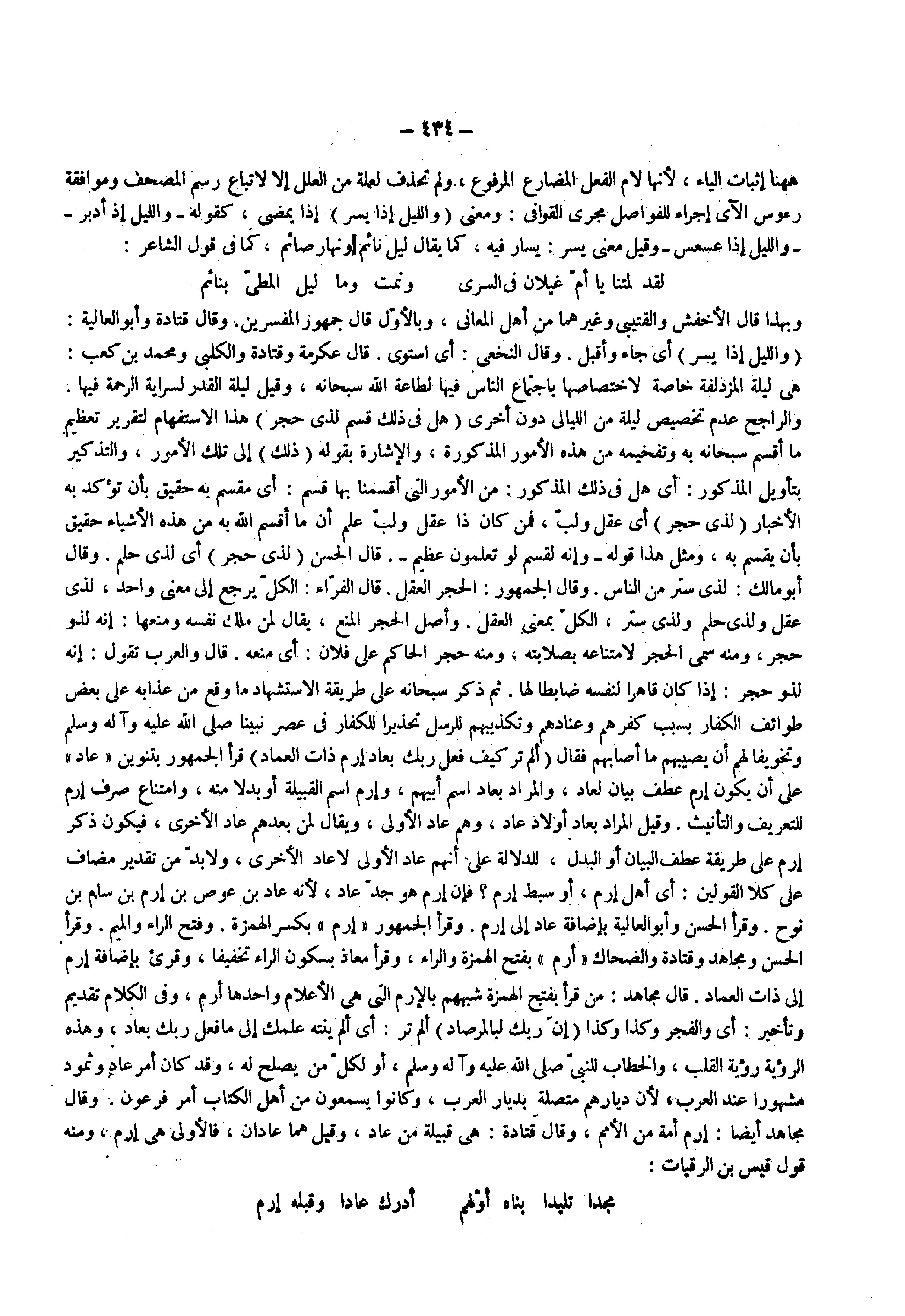 ههنا إثبات الياء لأنها لام الفعل المضارع المرفوع ولم تحذف لعلة من العلل إلا لاتباع رسم المصحف وموافقة رؤوس الاى إجراء للفواصل مجرى القوافى ومعنى ) والليل إذا يسر ( إذا يمضى كقوله والليل إذا أدبر والليل إذا عسعس وقيل معنى يسر يسار فيه كما يقال ليل نائم ونهار صائم كما في قول الشاعر لقد لمتنا يا أم غيلان في السرى
