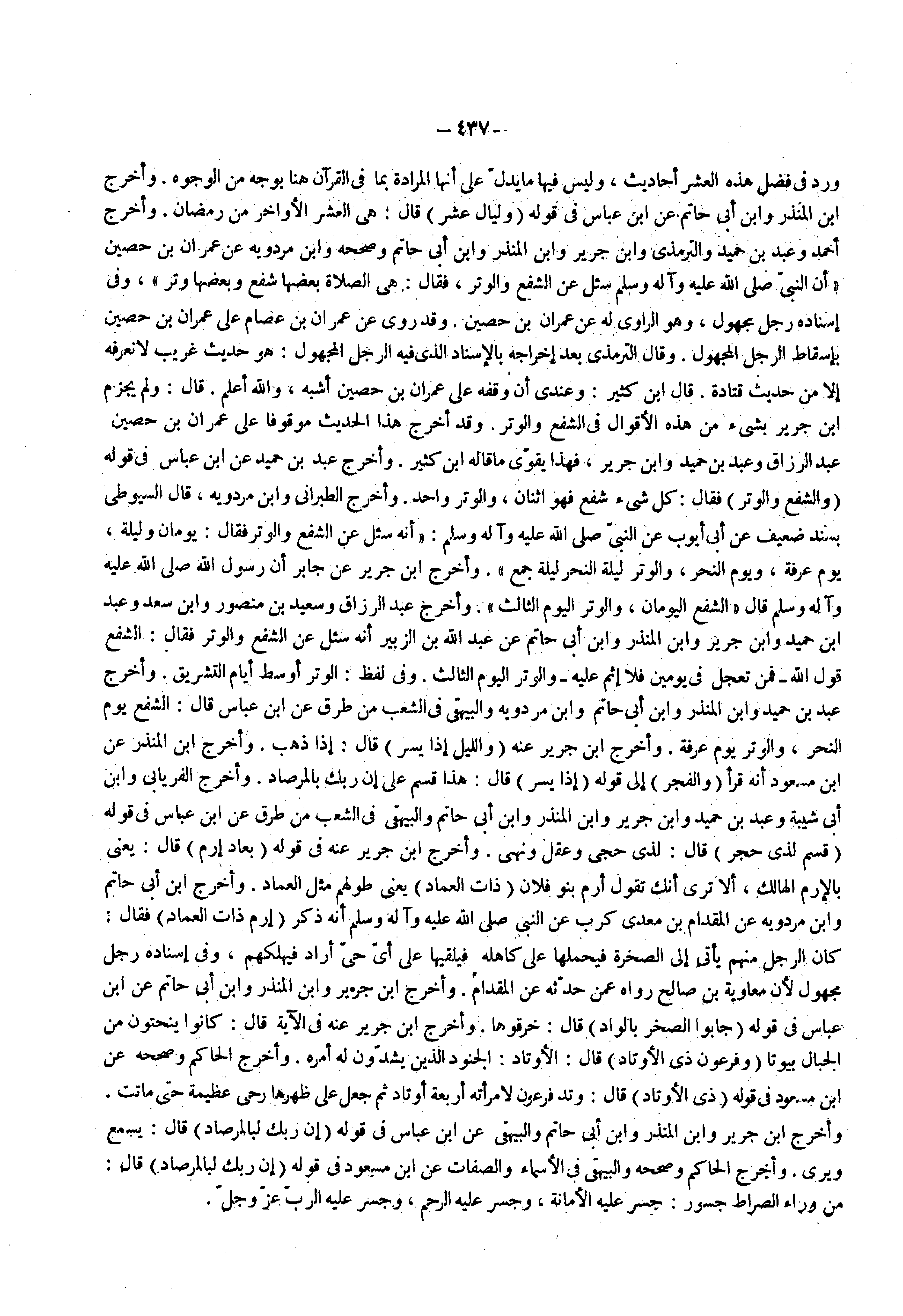 ورد في فضل هذه العشر أحاديث وليس فيها ما يدل على أنها المرادة بما في القران هنا بوجه من الوجوه وأخرج ابن المنذر وابن أبي حاتم عن ابن عباس في قوله ) وليال عشر ( قال هي العشر الأواخر من رمضان وأخرج أحمد وعبد بن حميد والترمذي وابن جرير وابن المنذر وابن أبي حاتم وصححه وابن مردويه عن عمران بن حصين أن النبي صلى الله عليه واله وسلم سئل عن الشفع والوتر فقال هي الصلاة بعضها شفع وبعضها وتر وفي إسناده رجل مجهول وهو الراوي له عن عمران بن حصين وقد روى عن عمران بن عصام على عمران بن حصين بإسقاط الرجل المجهول وقال الترمذي بعد أخراجه بالإسناد الذي فيه الرجل المجهول هو حديث غريب لا نعرفه الا من حديث قتادة قال ابن كثير وعندي أن وقفه على عمران بن حصين أشبه والله أعلم قال ولم يجزم ابن جرير بشيء من هذه الأقوال في الشفع والوتر وقد أخرج هذا الحديث موقوفا على عمران بن حصين عبد الرزاق وعبد بن حميد وابن جرير فهذا يقوى ما قاله ابن كثير وأخرج عبد بن حميد عن ابن عباس في قوله والشفع والوتر فقال كل شيء شفع فهو اثنان والوتر واحد وأخرج الطبراني وابن مردويه قال السيوطي بسند ضعيف عن أبي أيوب عن النبي صلى الله عليه واله وسلم أنه سئل عن الشفع والوتر فقال يومان وليلة يوم عرفة ويوم النحر والوتر ليلة النحر ليلة جمع وأخرج ابن جرير عن جابر أن رسول الله صلى الله عليه واله وسلم قال الشفع اليومان والوتر اليوم الثالث وأخرج عبد الرزاق وسعيد بن منصور وابن سعد وعبد ابن حميد وابن جرير وابن المنذر وابن أبي حاتم عن عبد الله بن الزبير أنه سئل عن الشفع والوتر فقال الشفع قول الله فمن تعجل في يومين فلا إثم عليه والوتر اليوم الثالث وفي لفظ الوتر أوسط أيام التشريق وأخرج عبد بن حميد وابن المنذر وابن أبي حاتم وابن مردويه والبيهقي في الشعب من طرق عن ابن عباس قال الشفع يوم النحر والوتر يوم عرفة وأخرج ابن جرير عنه والليل إذا يسر قال إذا ذهب وأخرج ابن المنذر عن ابن مسعود أنه قرأ والفجر إلى قوله إذا يسر قال هذا قسم على إن ربك بالمرصاد وأخرج الفريابي وابن أبي شيبة وعبد بن حميد وابن جرير وابن المنذر وابن أبي حاتم والبيهقي في الشعب من طرق عن ابن عباس في قوله قسم لذي حجر قال لذي حجى وعقل ونهى وأخرج ابن جرير عنه في قوله ) بعاد إرم ( قال يعني بالإرم الهالك ألا ترى أنك تقول أرم بنو فلان ) ذات العماد ( يعني طولهم مثل العماد وأخرج ابن أبي حاتم وابن مردويه عن المقدام بن معدي كرب عن النبي صلى الله عليه واله وسلم أنه ذكر ) إرم ذات العماد ( فقال كان الرجل منهم يأتي إلى الصخرة فيحملها على كاهله فيلقيها على أي حي أراد فيهلكهم وفي إسناده رجل مجهول لأن معاوية بن صالح رواه عمن حدثه عن المقدام وأخرج ابن جرير وابن المنذر وابن أبي حاتم عن ابن عباس في قوله ) جابوا الصخر بالواد ( قال خرقوها وأخرج ابن جرير عنه في الاية قال كانوا ينحتون من الجبال بيوتا وفرعون ذي الأوتاد قال الأوتاد الجنود الذين يشدون له أمره وأخرج الحاكم وصححه عن ابن مسعود في قوله ) ذي الأوتاد ( قال وتد فرعون لامرأته أربعة أوتاد ثم جعل على ظهرها رحى عظيمة حتى ماتت وأخرج ابن جرير وابن المنذر وابن أبي حاتم والبيهقي عن ابن عباس في قوله ) إن ربك لبالمرصاد ( قال يسمع ويرى وأخرج الحاكم وصححه والبيهقي في الأسماء والصفات عن ابن مسعود في قوله ) إن ربك لبالمرصاد ( قال من وراء الصراط جسور جسر عليه الأمانة وجسر عليه الرحم وجسر عليه الرب عز وجل