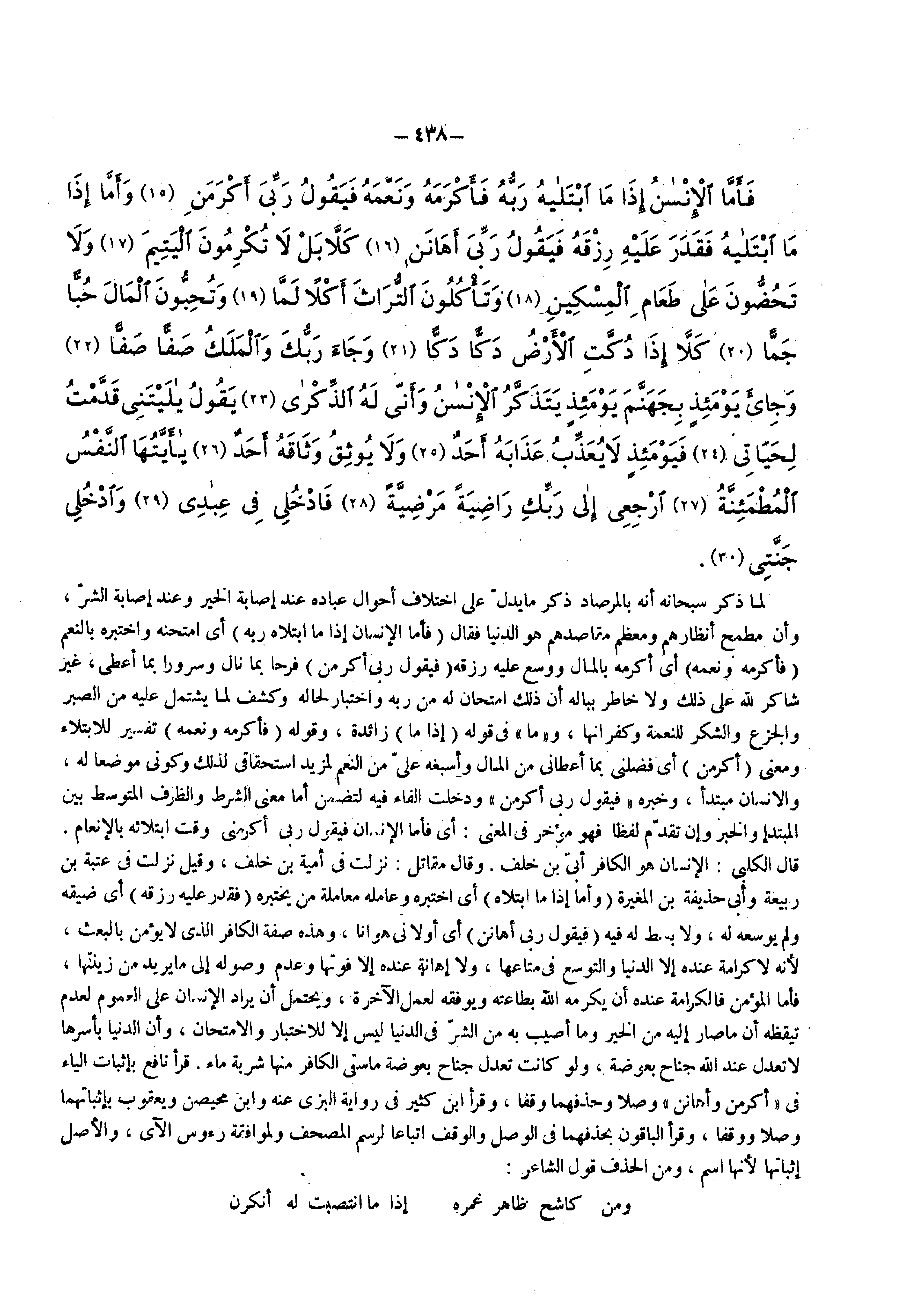 ) وأما إذا ما ابتلاه ( أي اختبره وعامله معاملة من يختبره ) فقدر عليه رزقه ( أي ضيقه ولم يوسعه له ولا بسط له فيه ) فيقول ربي أهانن ( أي أولاني هوانا وهذه صفة الكافر الذي لا يؤمن بالبعث لأنه لاكرامة عنده إلا الدنيا والتوسع في متاعها ولا إهانة عنده إلا فوتها وعدم وصوله إلى مايريد من زينتها فأما المؤمن فالكرامة عنده أن يكرمه الله بطاعته ويوفقه لعمل الاخرة ويحتمل ن يراد الإنسان على العموم لعدم تيقظة أن ما صار إليه من الخير وما أصيب به من الشر في الدنيا ليس إلا للاختبار والامتحان وأن الدنيا بأسرها لا تعدل عند الله جناح بعوضة ولو كانت تعدل جناح بعوضة ما سقى الكافر منها شربة ماء قرأنا نافع بإثبات الياء في أكرمن وأهانن وصلا وحذفهما وقفا وقرأ ابن كثير في رواية البزي عنه وابن محيصن ويعقوب بإثباتهما وصلا ووقفا وقرأ الباقون بحذفهما في الوصل والوقف اتباعا لرسم المصحف والموافقة رؤوس الاى والأصل إثباتها لأنها اسم ومن الحذف قول الشاعر ومن كاشح ظاهر غمره