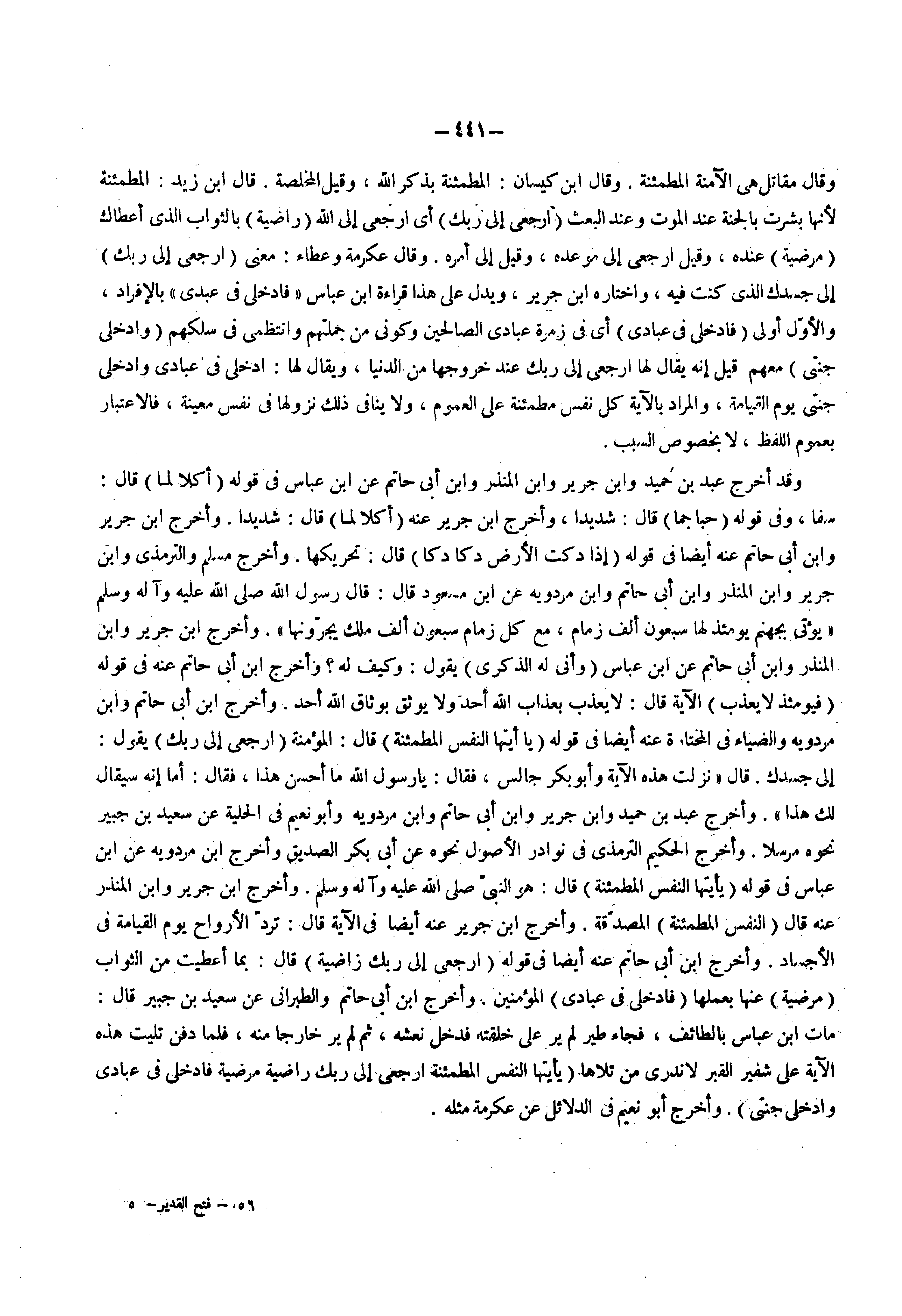 وقد أخرج عبد بن حميد وابن جرير وابن المنذر وابن أبي حاتم عن ابن عباس في قوله ) أكلا لما ( قال سفا وفي قوله ) حبا جما ( قال شديدا وأخرج ابن جرير عنه أكلا لما قال شديدا وأخرج ابن جرير وابن أبي حاتم عنه أيضا في قوله ) إذا دكت الأرض دكا دكا ( قال تحريكها وأخرج مسلم والترمذي وابن جرير وابن المنذر وابن أبي حاتم وابن مردويه عن ابن مسعود قال قال رسول الله صلى الله عليه واله وسلم يؤتى بجهنم يومئذ لها سبعون ألف زمام مع كل زمام سبعون ألف ملك يجرونها وأخرج ابن جرير وابن المنذر وابن أبي حاتم عن ابن عباس ) وأنى له الذكرى ( يقول وكيف له وأخرج ابن أبي حاتم عنه في قوله ) فيومئذ لا يعذب ( الاية قال لا يعذب بعذاب الله أحد ولا يوثق بوثاق الله أحد وأخرج ابن أبي حاتم وابن مردويه والضياء في المختارة عنه أيضا في قوله ) يا أيتها النفس المطمئنة ( قال المؤمنة ) ارجعي إلى ربك ( يقول إلى جسدك قال نزلت هذه الاية وابو بكر جالس فقال يا رسول الله ما أحسن هذا فقال أما إنه سيقال لك هذا وأخرج عبد بن حميد وابن جرير وابن أبي حاتم وابن مردويه وأبو نعيم في الحلية عن سعيد بن جبير نحوه مرسلا وأخرج الحكيم الترمذي في نوادر الأصول نحوه عن أبي بكر الصديق وأخرج ابن مردويه عن ابن عباس في قوله ) يا أيتها النفس المطمئنة ( قال هو النبي صلى الله عليه واله وسلم وأخرج ابن جرير وابن المنذر عنه قال ) النفس المطمئنة ( المصدقة وأخرج ابن جرير عنه أيضا في الاية قال ترد الأرواح يوم القيامة في الأجساد وأخرج ابن أبي حاتم عنه أيضا في قوله ) ارجعي إلى ربك راضية ( قال بما أعطيت من الثواب ) مرضية ( عنها بعملها ) فادخلي في عبادي ( المؤمنين وأخرج ابن أبي حاتم والطبراني عن سعيد بن جبير قال مات ابن عباس بالطائف فجاء طير لم ير على خلقته فدخل نعشه ثم لم ير خارجا منه فلما دفن تليت هذه الاية على شفير القبر لا ندري من تلاها ) يا أيتها النفس المطمئنة ارجعي إلى ربك راضية مرضية فادخلي في عبادي وادخلي جنتي ( وأخرج أبو نعيم في الدلائل عن عكرمة مثله