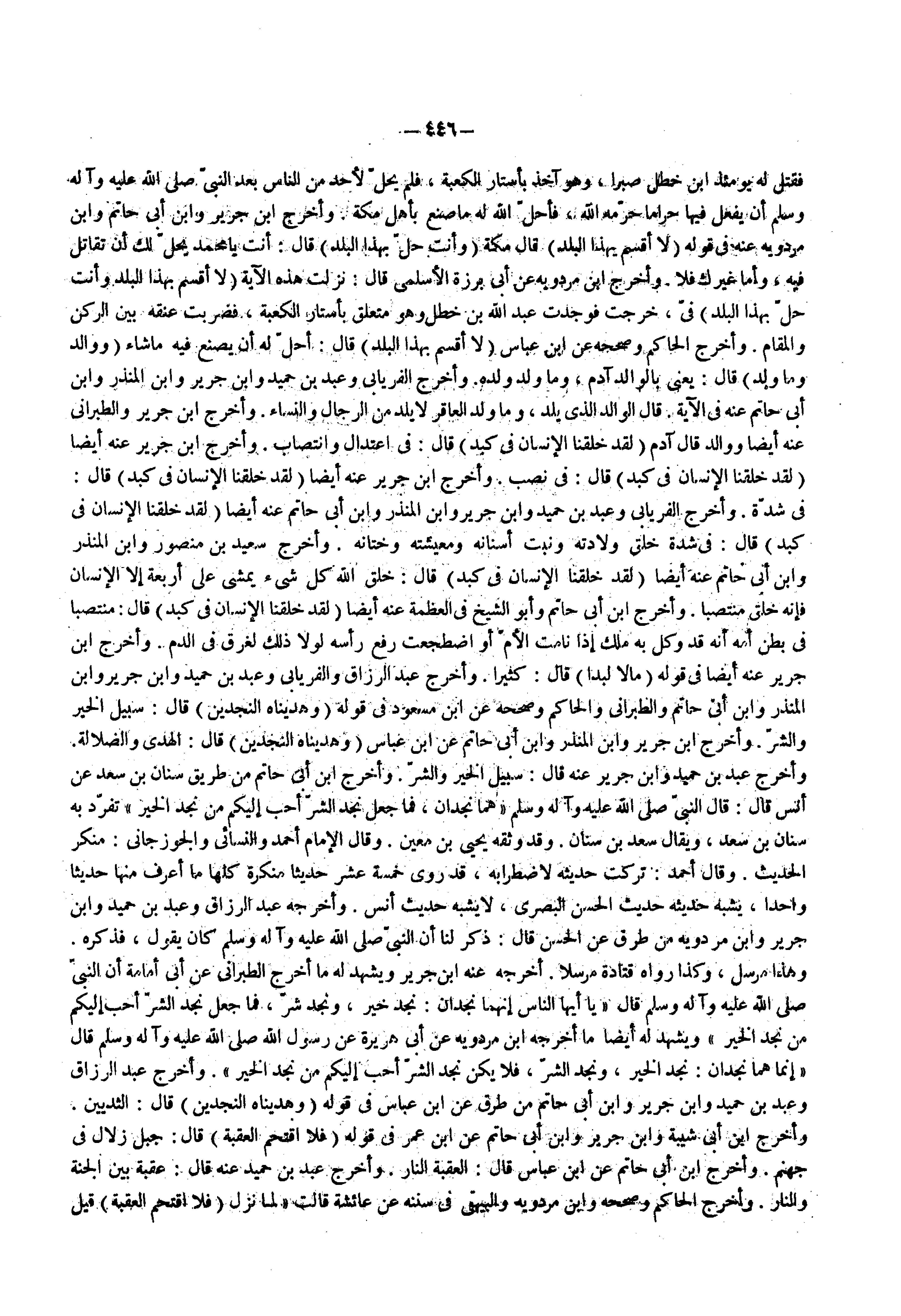 فقتل له يومئذ ابن خطل صبرا وهو اخذ بأستار الكعبة فلم يحل لأحد من الناس بعد النبي صلى الله عليه واله وسلم أن يفعل فيها حراما حرمه الله فأحل الله له ما صنع بأهل مكة وأخرج ابن جرير وابن أبي حاتم وابن مردويه عنه في قوله ) لا أقسم بهذا البلد ( قال مكة ) وأنت حل بهذا البلد ( قال أنت يا محمد يحل لك أن تقاتل فيه وأما غيرك فلا وأخرج ابن مردويه عن أبي برزة الأسلمي قال نزلت هذه الاية ) لا أقسم بهذا البلد وأنت حل بهذا البلد ( في خرجت فوجدت عبد الله بن خطل وهو متعلق بأستار الكعبة فضربت عنقه بين الركن والمقام وأخرج الحاكم وصححه عن ابن عباس ) لا أقسم بهذا البلد ( قال أحل له أن يصنع فيه ما شاء ) ووالد وما ولد ( قال يعني بالوالد ادم وما ولد ولده وأخرج الفريابي وعبد بن حميد وابن جرير وابن المنذر وابن أبي حاتم عنه في الاية قال الوالد الذي يلد وما ولد العاقر لا يلد من الرجال والنساء وأخرج ابن جرير والطبراني عنه أيضا ووالد قال ادم ) لقد خلقنا الإنسان في كبد ( 6 قال في اعتدال وانتصاب وأخرج ابن جرير عنه أيضا ) لقد خلقنا الإنسان في كبد ( قال في نصب وأخرج ابن جرير عنه أيضا ) لقد خلقنا الإنسان في كبد ( قال في شدة وأخرج الفريابي وعبد بن حميد وابن جرير وابن المنذر وابن أبي حاتم عنه أيضا ) لقد خلقنا الإنسان في كبد ( قال في شدة حلق ولادته ونبت أسنانه ومعيشته وختانه وأخرج سعيد بن منصور وابن المنذر وابن أبي حاتم عنه أيضا ) لقد خلقنا الإنسان في كبد ( قال خلق الله كل شيء يمشي على أربعة إلا الإنسان فإنه خلق منتصبا وأخرج ابن أبي حاتم وأبو الشيخ في العظمة عنه أيضا ) لقد خلقنا الإنسان في كبد ( قال منتصبا في بطن أمه أنه قد وكل به ملك إذا نامت الأم أو اضطجعت رفع رأسه لولا ذلك لغرق في الدم وأخرج ابن جرير عنه أيضا في قوله ) مالا لبدا ( قال كثيرا وأخرج عبد الرزاق والفريابي وعبد بن حميد وابن جرير وابن المنذر وابن أبي حاتم والطبراني والحاكم وصححه عن ابن مسعود في قوله ) وهديناه النجدين ( قال سبيل الخير والشر وأخرج ابن جرير وابن المنذر وابن أبي حاتم عن ابن عباس ) وهديناه النجدين ( قال الهدي والضلالة وأخرج عبد بن حميد وابن جرير عنه قال سبيل الخير والشر وأخرج ابن أبي حاتم من طريق سنان بن سعد عن أنس قال قال النبي صلى الله عليه واله وسلم هما نجدان فما جعل نجد الشر أحب إليكم من نجد الخير تفرد به سنان بن سعد ويقال سعد بن سنان وقد وثقه يحيى بن معيت وقال الإمام أحمد والنسائي والجوزجاني منكر الحديث وقال أحمد تركت حديثه لاحنطرابه قد روى خمسة عشر حديثا منكرة كلها ما أعرف منها حديثا واحدا يشبه حديثه حديث الحسن البصري لا يشبه حديث أنس وأخرجه عبد الرزاق وعبد بن حميد وابن جرير وابن مردويه من طرق عن الحسن قال ذكر لنا أن النبي صلى الله عليه واله وسلم كان يقول فذكره وهذا مرسل وكذا رواه قتادة مرسلا أخرجه عنه ابن جرير ويشهد له ما أخرج الطبراني عن أبي أمامة أن النبي صلى الله عليه واله وسلم قال يا إيها الناس إنهما نجدان نجد خير ونجد شر فما جعل نجد الشر أحب إليكم من نجد الخير ويشهد له أيضا ما أخرجه ابن مردويه عن أبي هريرة عن رسول الله صلى الله عليه واله وسلم قال إنما هما نجدان نجد الخير ونجد الشر فلا يكن نجد الشر أحب إليكم من نجد الخير وأخرج عبد الرزاق وعبد بن حميد وابن جرير وابن أبي حاتم من طرق عن ابن عباس في قوله ) وهديناه النجدين ( قال الثديين وأخرج ابن أبي شيبة وابن جرير وابن أبي حاتم عن ابن عمر في قوله ) فلا اقتحم العقبة ( قال جبل زلال في جهنم وأخرج ابن أبي حاتم عن ابن عباس قال العقبة النار وأخرج عبد بن حميد عنه قال عقبة بين الجنة النار وأخرج الحاكم وصححه وابن مردويه والبيهقي في سننه عن عائشة قالت لما نزل ) فلا اقتحم العقبة ( قيل