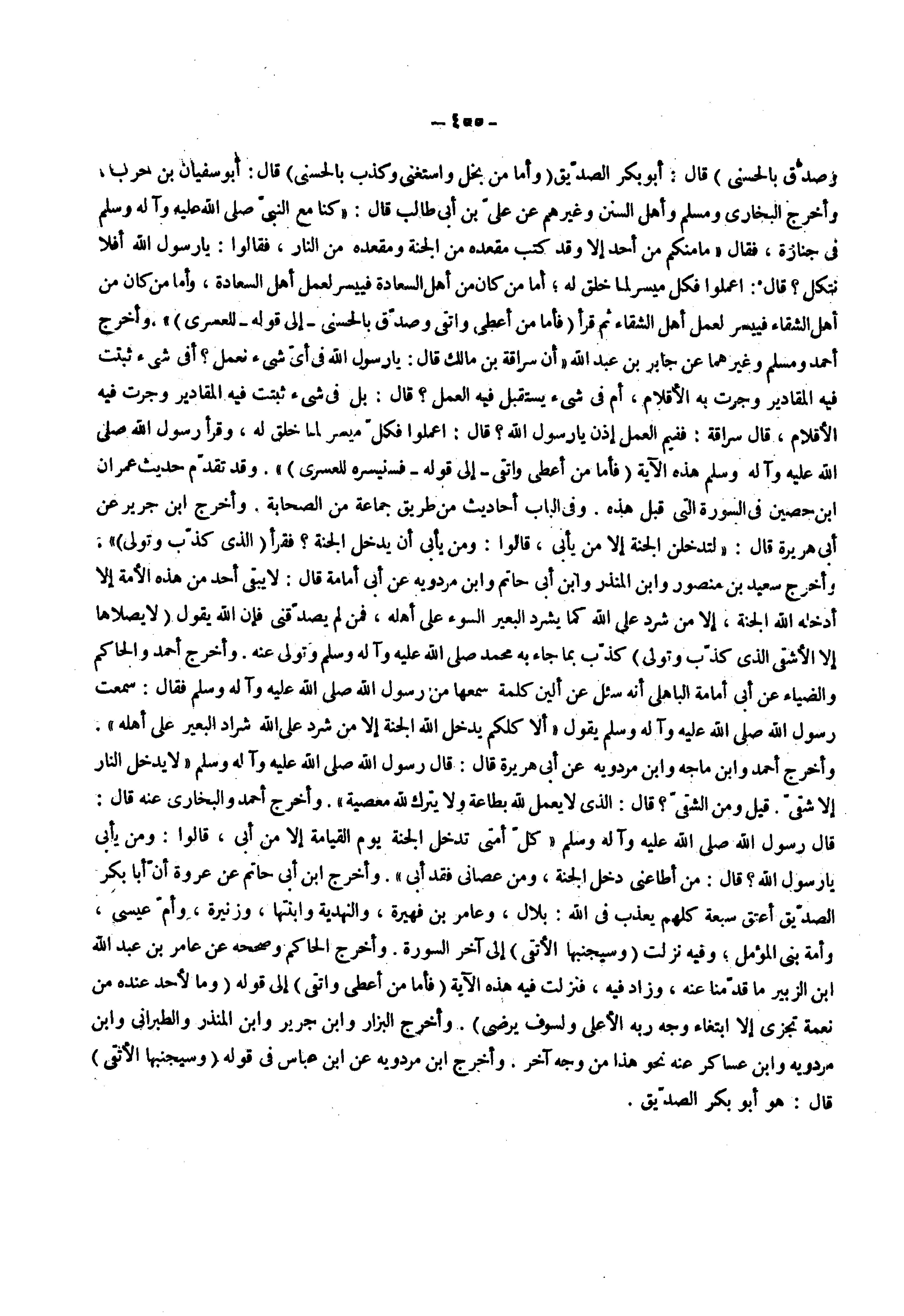 قال أبو بكر الصديق ) وأما من بخل واستغنى وكذب بالحسنى ( قال أبو سفيان بن حرب وأخرج البخاري ومسلم وأهل السنن وغيرهم عن علي بن أبي طالب قال كنا مع النبي صلى الله عليه واله وسلم في جنازة فقال ما منكم من أحد إلا وقد كتب مقعده من الجنة ومقعده من النار فقالوا يا رسول الله أفلا نتكل قال اعملوا فكل ميسر لما خلق له أما من كان من أهل السعادة فييسر لعمل أهل السعادة وأما من كان من أهل الشقاء فييسر لعمل أهل الشقاء ثم قرأ ) فأما من أعطى واتقى وصدق بالحسنى ( إلى قوله للعسرى وأخرج أحمد ومسلم وغيرهما عن جابر بن عبد الله أن سراقة بن مالك قال يا رسول الله في أي شيء نعمل أفي شيء ثبتت فيه المقادير وجرت به الأقلام أم في شيء يستقبل فيه العمل قال بل في شيء ثبتت فيه المقادير وجرت فيه الأقلام قال سراقة ففيم العمل إذن يا رسول الله قال اعملوا فكل ميسر لما خلق له وقرأ رسول الله صلى الله عليه واله وسلم هذه الاية ) فأما من أعطى واتقى ( إلى قوله ) فسنيسره للعسرى ( وقد تقدم حديث عمران ابن حصين في السورة التي قبل هذه وفي الباب أحاديث من طريق جماعة من الصحابة وأخرج ابن جرير عن أبي هريرة قال لتدخلن الجنة إلا من يأبى قالوا ومن يأبى أن يدخل الجنة فقرأ ) الذي كذب وتولى ( وأخرج سعيد بن منصور وابن المنذر وابن أبي حاتم وابن مردويه عن أبي أمامة قال لا يبقى أحد من هذه الأمة إلا أدخله الله الجنة إلا من شرد على الله كما يشرد البعير السوء على أهله فمن لم يصدقني فإن الله يقول ) لا يصلاها إلا الأشقى الذي كذب وتولى ( كذب بما جاء به محمد صلى الله عليه واله وسلم وتولى عنه وأخرج أحمد والحاكم والضياء عن أبي أمامة الباهلي أنه سئل عن ألين كلمه سمعها من رسول الله صلى الله عليه واله وسلم فقال سمعت رسول الله صلى الله عليه واله وسلم يقول ألا كلكم يدخل الله الجنة إلا من شرد على الله شراد البعير على أهله وأخرج أحمد وابن ماجه وابن مرويه عن أبي هريرة قال قال رسول اله صلى الله عليه واله وسلم لا يدخل النار إلا شقي قيل ومن الشقي قال الذي لا يعمل لله بطاعة ولا يترك لله معصية وأخرج أحمد والبخاري عنه قال قال رسول الله صلى الله عليه واله وسلم كل أمتي تدخل الجنة يوم القيامة إلا من أبى قالوا ومن يأبى يا رسول الله قال من أطاعني دخل الجنة ومن عصاني فقد أبى وأخرج ابن أبي حاتم عن عروة أن أبا بكر الصديق أعتق سبعة كلهم يعذب في الله بلال وعامر بن فهيرة والنهدية وابنتها وزنيرة وأم عيسى وأمة بني المؤمل وفيه نزلت ) وسيجنبها الأتقى ( إلى اخر السورة وأخرج الحام وصححه عن عامر بن عبد الله ابن الزبير ما قدمنا عنه وزاد فيه فنزلت فيه هذه الاية ) فأما من أعطى واتقى ( إلى قوله ) وما لأحد عنده من نعمة تجزى إلا ابتغاء وجه ربه الأعلى ولسوف يرضى ( وأخرج البزار وابن جرير وابن المنذر والطبراني وابن مردويه وابن عساكر عنه نحو هذا من وجه اخر وأخرج ابن مردويه عن ابن عباس في قوله ) وسيجنبها الأتقى ( قال هو أبو بكر الصديق