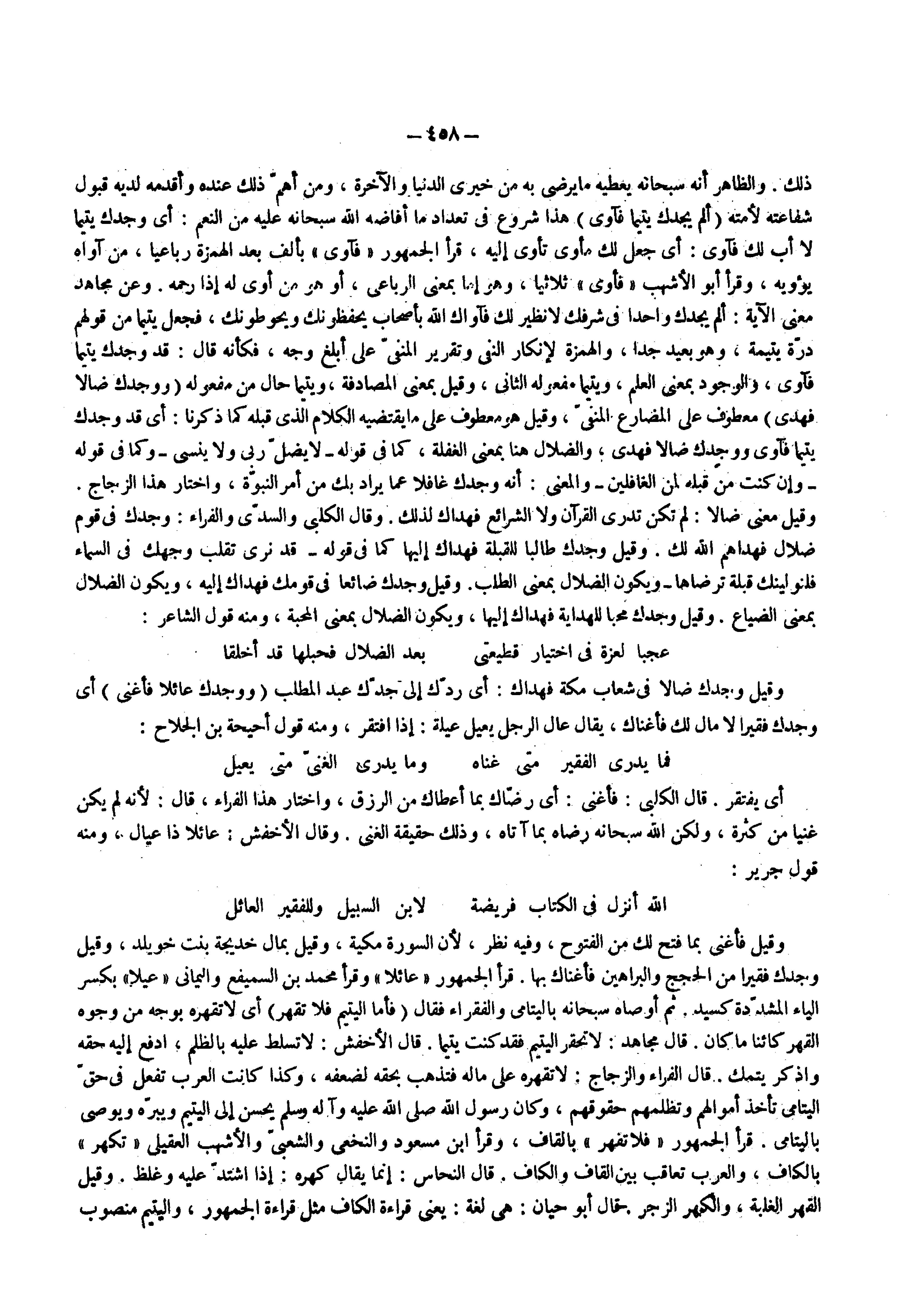 ) ووجدك عائلا فأغنى ( أي وجدك فقيرا لا مال لك فأغناك يقال عال الرجل يعيل عيلة إذا افتقر ومنه قول أحيحة بن الجلاح فما يدري الفقير متى غناه