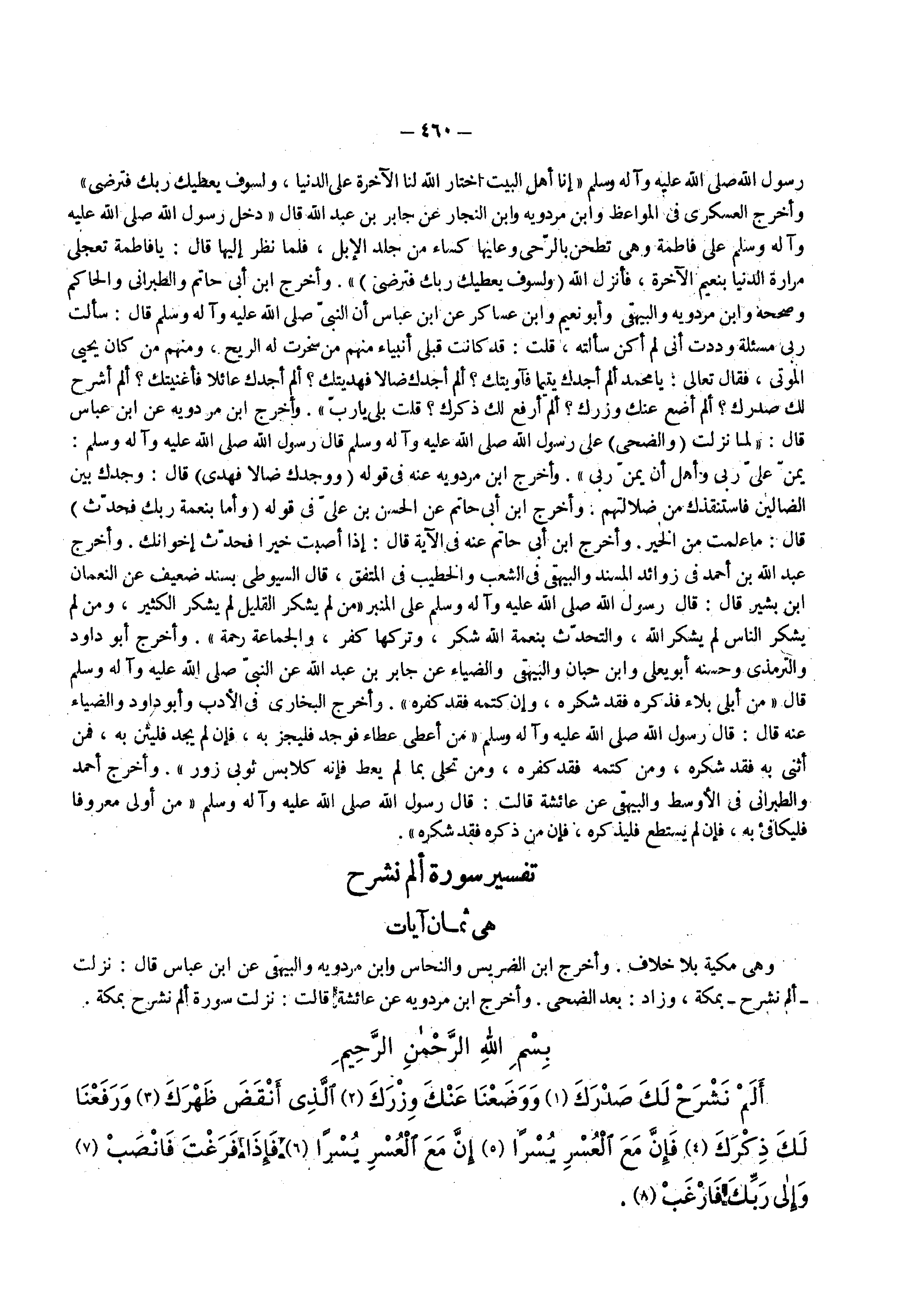 وهي مكية بلا خلاف وأخرج ابن الضريس والنحاس وابن مردويه والبيهقي عن ابن عباس قال نزلت ألم نشرح بمكة وزاد بعد الضحى وأخرج ابن مردويه عن عائشة قالت نزلت سورة ألم نشرح بمكة بسم الله الرحمن الرحيم