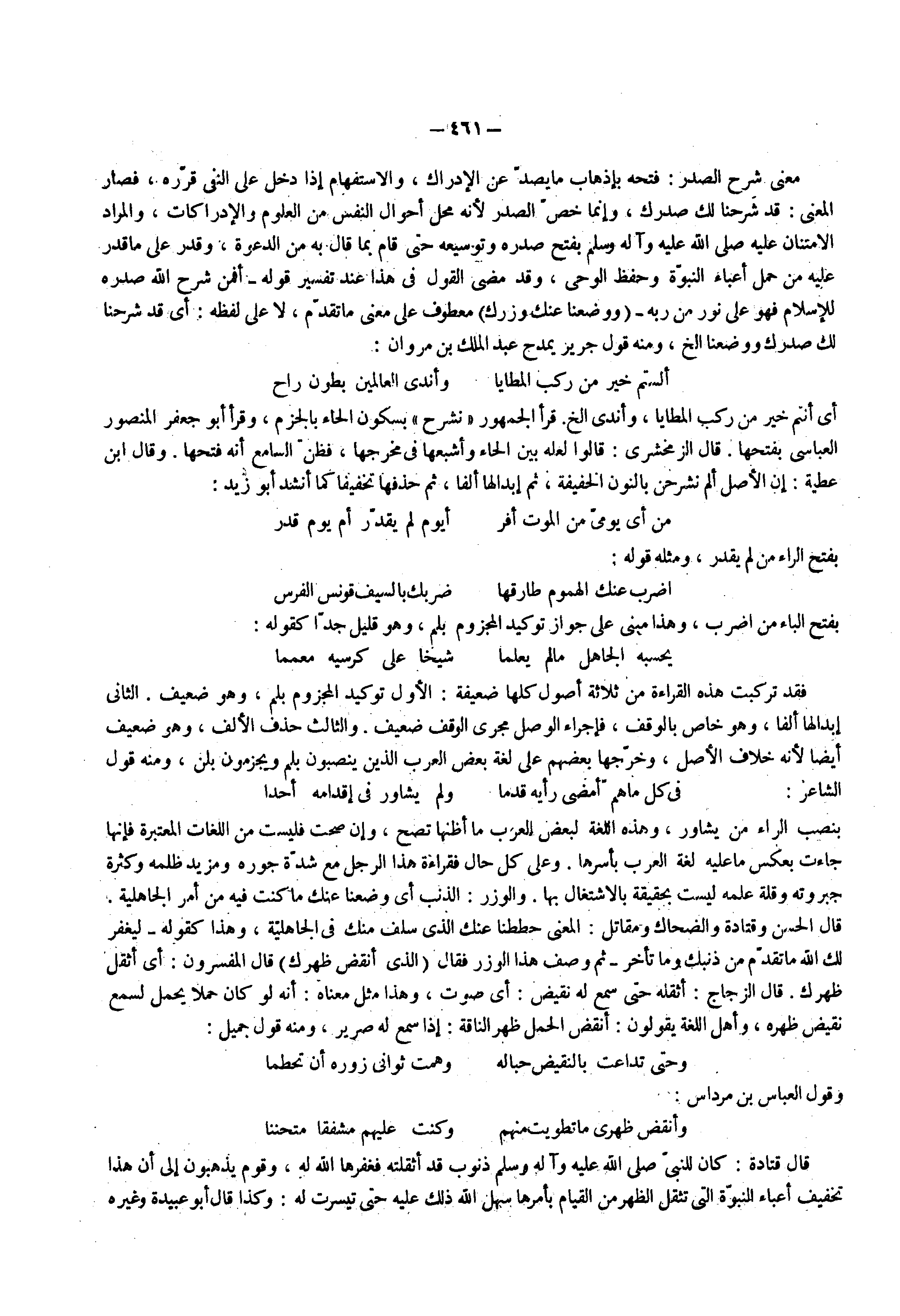 أي أنتم خير من ركب المطايا وأندى الخ قرأ الجمهور نشرح بسكون الحاء بالجزم وقرأ أبو جعفر المنصور العباسي بفتحها قال الزمخشري قالوا لعله بين الحاء وأشبعها في مخرجها فظن السامع أنه فتحها وقال ابن عطية إن الأصل ألم نشرحن بالنون الخفيفة ثم إبدالها ألفا ثم حذفها تخفيفا كما أنشد أبو زيد من أي يومى من الموت أفر