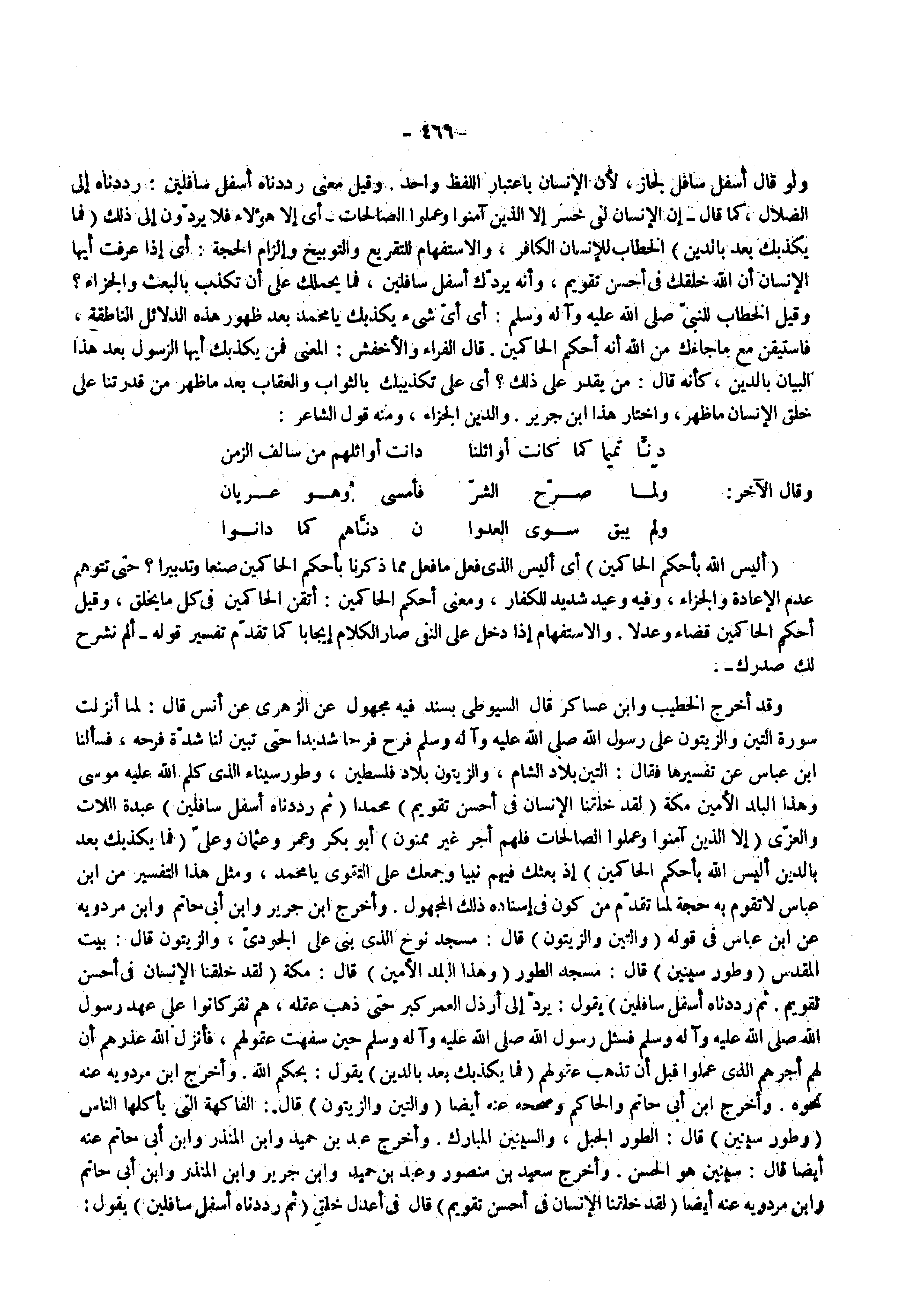 وقد أخرج الخطيب وابن عساكر قال السيوطي بسند فيه مجهول عن الزهري عن أنس قال لما أنزلت سورة التين والزيتون على رسول الله صلى الله عليه واله وسلم فرح فرحا شديدا حتى تبين لنا شدة فرحه فسألنا ابن عباس عن تفسيرها فقال التين بلاد الشام والزيتون بلاد فلسطين وطور سيناء الذي كلم الله عليه موسى وهذا البلد الأمين مكة ) لقد خلقنا الإنسان في أحسن تقويم ( محمدا ) ثم رددناه أسفل سافلين ( عبدة اللات والعزى ) إلا الذين آمنوا وعملوا الصالحات فلهم أجر غير ممنون ( أبو بكر وعمر وعثمان وعلى ) فما يكذبك بعد بالدين أليس الله بأحكم الحاكمين ( إذ بعثك فيهم نبيا وجمعك على التقوى يا محمد ومثل هذا التفسير من ابن عباس لا تقوم به حجة لما تقدم من كون في إسناده ذلك المجهول وأخرج ابن جرير وابن أبي حاتم وابن مردويه عن ابن عباس في قوله ) والتين والزيتون ( قال مسجد نوح الذي بنى على الجودى والزيتون قال بيت المقدس ) وطور سينين ( قال مسجد الطور ) وهذا البلد الأمين ( قال مكة ) لقد خلقنا الإنسان في أحسن تقويم ثم رددناه أسفل سافلين ( يقول يرد إلى أرذل العمر كبر حتى ذهب عقله هم نفر كانوا على عهد رسول الله صلى الله عليه واله وسلم فسئل رسول الله صلى الله عليه واله وسلم حين سفهت عقولهم فأنزل الله عذرهم أن لهم أجرهم الذي عملوا قبل أن تذهب عقولهم ) فما يكذبك بعد بالدين ( يقول بحكم الله وأخرج ابن مردويه عنه نحوه وأخرج ابن أبي حاتم والحاكم وصححه عنه أيضا ) والتين والزيتون ( قال الفاكهة التي يأكلها الناس ) وطور سينين ( قال الطور الجبل والسينين المبارك وأخرج عبد بن حميد وابن المنذر وابن أبي حاتم عنه أيضا قال سينين هو الحسن وأخرج سعيد بن منصور وعبد بن حميد وابن جرير وابن المنذر وابن أبي حاتم وابن مردويه عنه أيضا ) لقد خلقنا الإنسان في أحسن تقويم ( قال في أعدل خلق ) ثم رددناه أسفل سافلين ( يقول