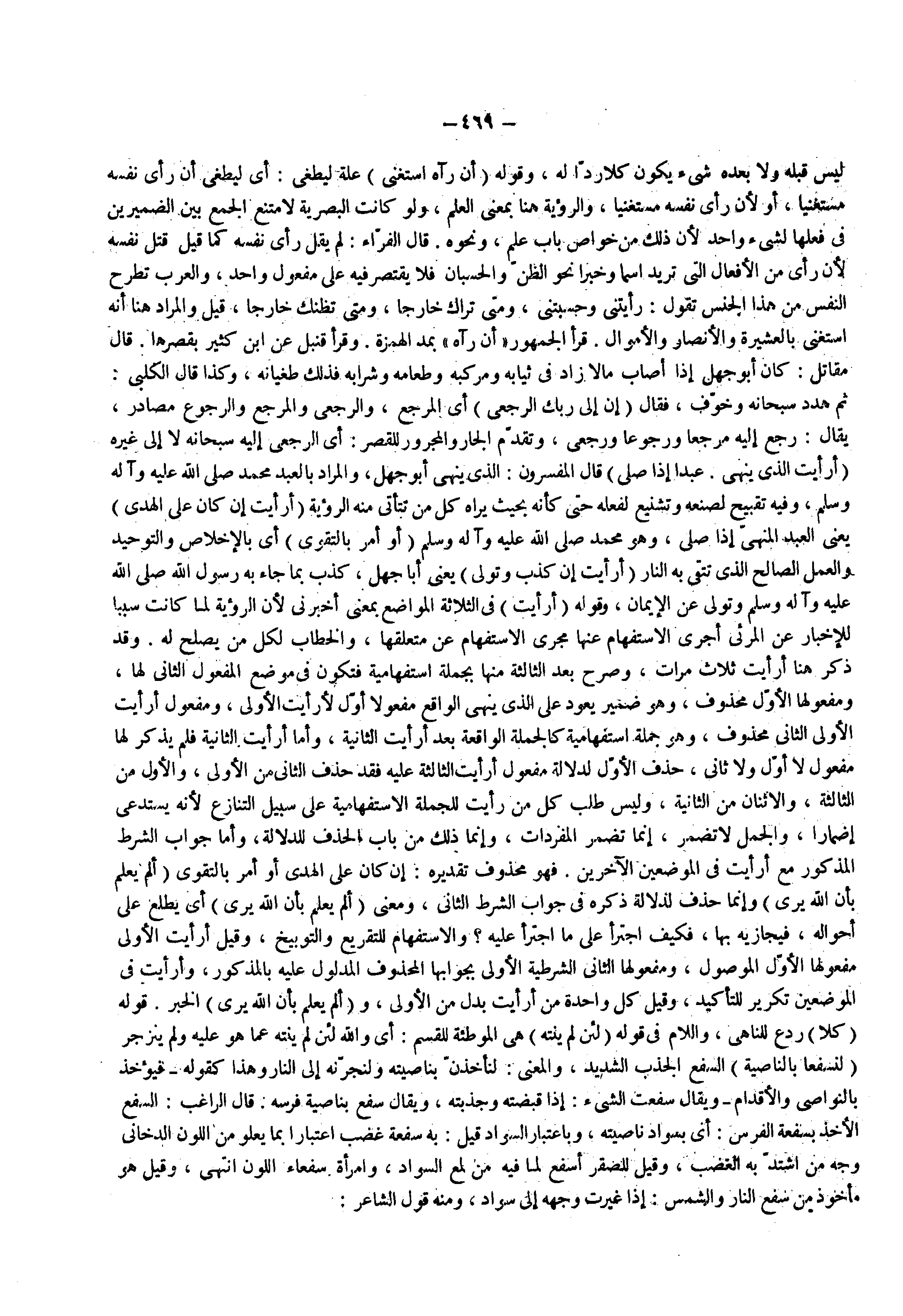 ) أرأيت إن كذب وتولى ( يعني أبا جهل كذب بما جاء به رسول الله صلى الله عليه واله وسلم وتولى عن الإيمان وقوله ) أرأيت ( في الثلاثة المواضع بمعنى أخبرني لأن الرؤية لما كانت سببا للأخبار عن المرئى أجرى الاستفهام عنها مجرى الاستفهام عن متعلقها والخطاب لكل من يصلح له وقد ذكر هنا أرأيت ثلاث مرات وصرح بعد الثالثة منها بجملة استفهامية فتكون في موضع المفعول الثاني لها ومفعولها الأول محذوف وهو ضمير يعود على الذي ينهى الواقع مفعولا أولا لأرأيت الأولى ومفعول أرأيت الأولى الثاني محذوف وهو جملة استفهامية كالجملة الواقعة بعد أرأيت الثانية وأما أرأيت الثانية فلم يذكر لها مفعول لا أول ولا ثاني حذف الأول لدلالة مفعول أرأيت الثالثة عليه فقد حذف الثاني من الأولى والأول من الثالثة والاثنان من الثانية وليس طلب كل من رأيت للجملة الاستفهامية على سبيل التنازع لأنه يستدعي إضمارا والجمل لا تضمير إنما تضمر المفردات وإنما ذلك من باب الحذف للدلالة وأما جواب الشرط المذكور مع أرأيت في الموضعين الاخرين فهو محذوف تقديره إن كان على الهدى أو أمر بالتقوى ) ألم يعلم بأن الله يرى ( وإنما حذف لدلالة ذكره في جواب الشرط الثاني ومعنى