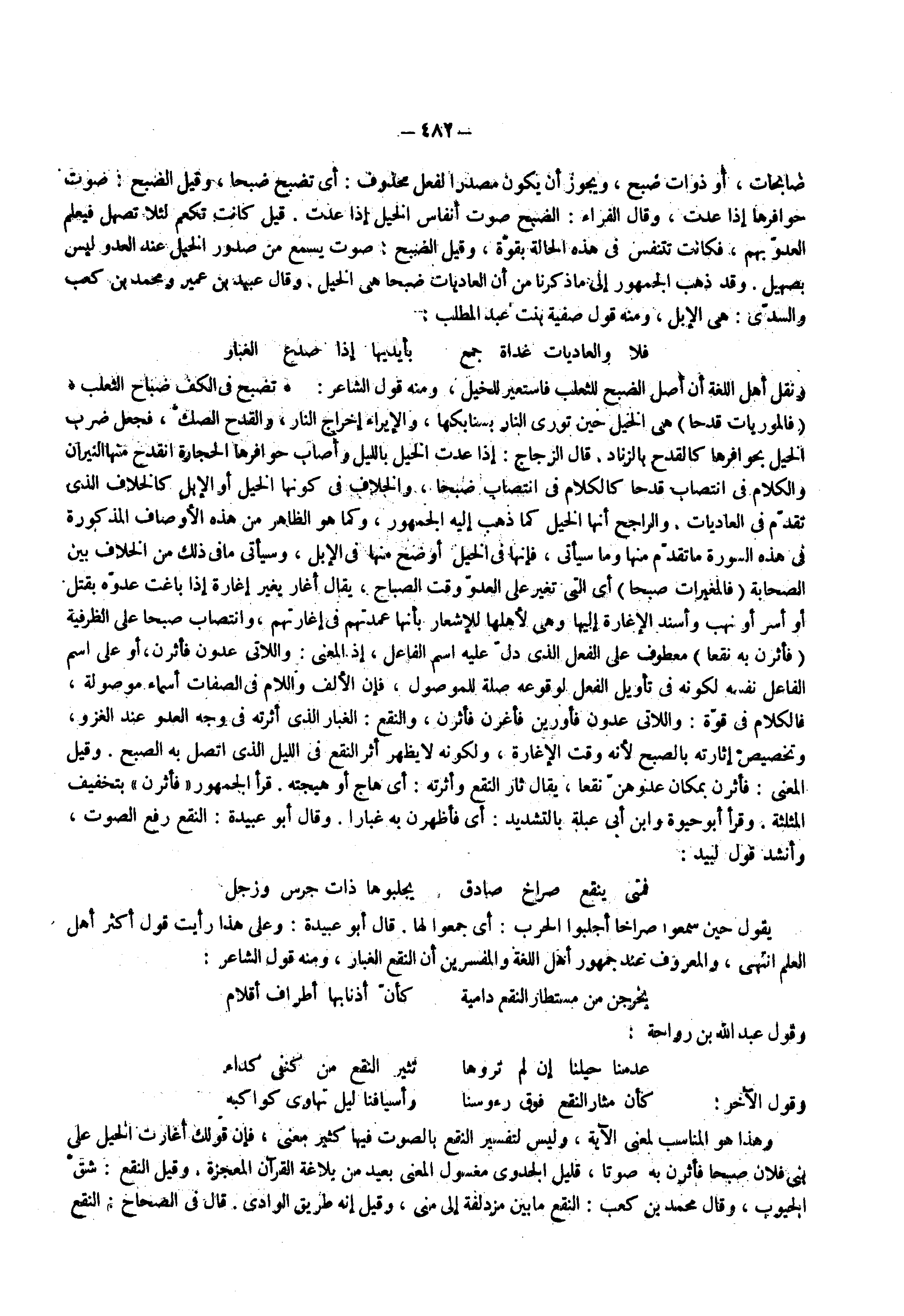 وهذا هو المناسب لمعنى الاية وليس لتفسير النقع بالصوت فيها كثير معنى فإن قولك أغارت الخيل على بني فلان صبحا فأثرن به صوتا قليل الجدوى مغسول المعنى بعيد من بلاغة القران المعجزة وقيل النقع شق الجيوب وقال محمد بن كعب النقع ما بين مزدلفة إلى منى وقيل إنه طريق الوادي قال في الصحاح النقع