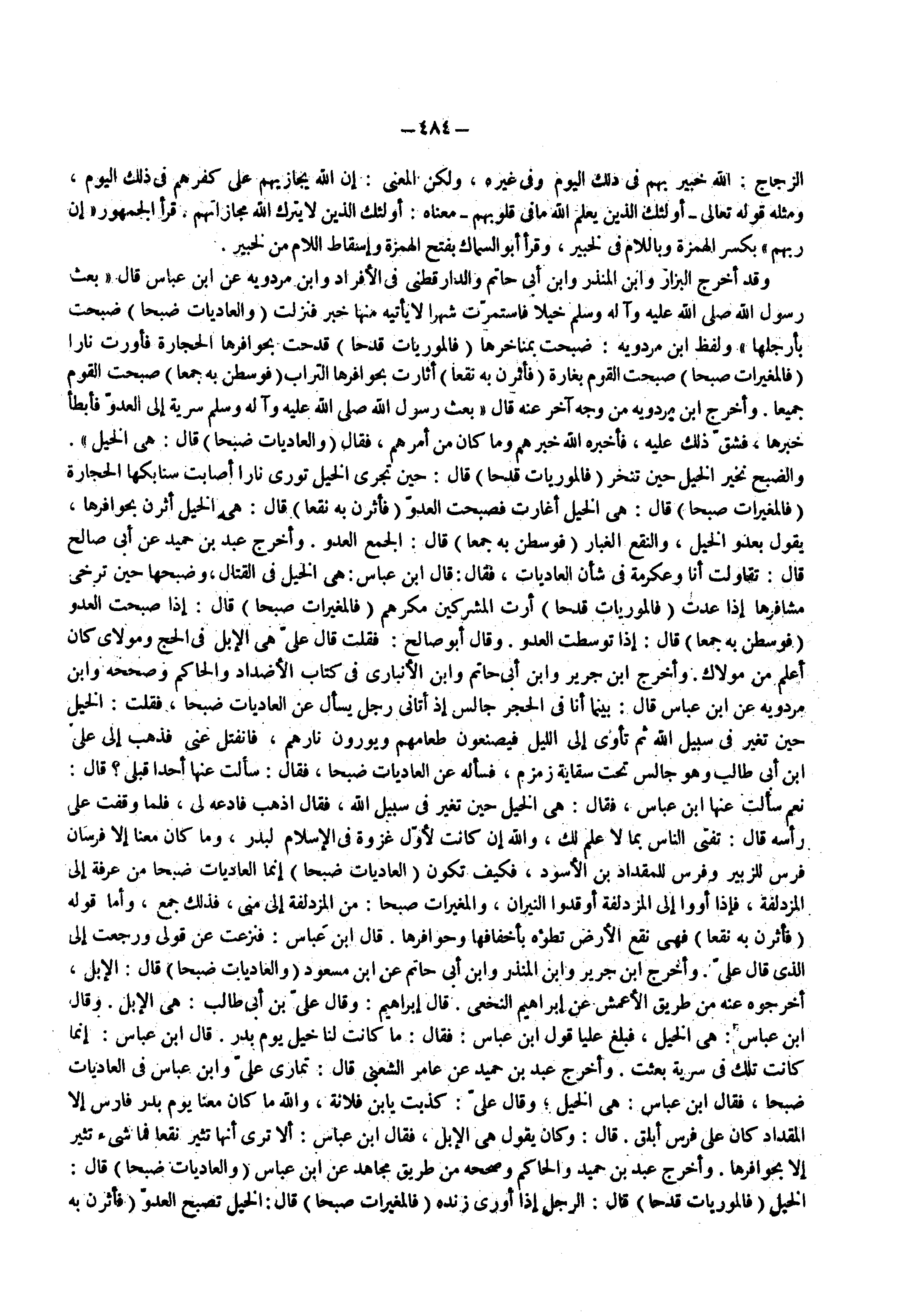وقد أخرج البزار وابن المنذر وابن أبي حاتم والدارقطني في الأفراد وابن مردويه عن ابن عباس قال بعث رسول الله صلى الله عليه واله وسلم خيلا فاستمرت شهرا لأيأتيه منها خبر فنزلت ) والعاديات ضبحا ( ضبحت بأرجلها ولفظ ابن مردويه ضبحت بمناخرها ) فالموريات قدحا ( قدحت بحوافرها الحجارة فأورت نارا ) فالمغيرات صبحا ( صبحت القوم بغارة ) فأثرن به نقعا ( أثارت بحوافرها التراب ) فوسطن به جمعا ( صبحت القوم جميعا وأخرج ابن مردويه من وجه اخر عنه قال بعث رسول الله صلى الله عليه واله وسلم سرية إلى العدو فأبطأ حبرها فشق ذلك عليه فأخبره الله خبرهم وما كان من أمرهم فقال ) والعاديات ضبحا ( قال هي الخيل والضبح نخير الخيل حين تنخر ) فالموريات قدحا ( قال حين تجرى الخيل تورى نارا أصابت سنابكها الحجارة ) فالمغيرات صبحا ( قال هي الخيل أغارت فصبحت العدو ) فأثرن به نقعا ( قال هي الخيل أثرن بحوافرها يقول بعدو الخيل والنقع الغبار ) فوسطن به جمعا ( قال الجمع العدو وأخرج عبد بن حميد عن أبي صالح قال تقاولت أنا وعكرمة في شأت العاديات فقال قال ابن عباس هي الخيل في القتال وضبحها حين ترخى مشافرها إذا عدت ) فالموريات قدحا ( أرت المشركين مكرهم ) فالمغيرات صبحا ( قال إذا صبحت العدو ) فوسطن به جمعا ( قال إذا توسطت العدو وقال أبو صالح فقلت قال علي هي الإبل في الحج ومولاي كان أعلم من مولاك وأخرج ابن جرير وابن أبي حاتم وابن الأنباري في كتاب الأضداد والحاكم وصححه وابن مردويه عن ابن عباس قال بينما أنا في الحجر جالس إذ أتاني رجل يسأل عن العاديات ضبحا فقلت الخيل حين تغير في سبيل الله ثم تأوى إلى الليل فيصنعون طعامهم ويورون نارهم فانفتل عني فذهب إلى علي ابن أبي طالب وهو جالس تحت سقاية زمزم فسأله عن العاديات ضبحا فقال سألت عنها أحدا قبلي قال نعم سألت عنها ابن عباس فقال هي الخيل حين تغير في سبيل الله فقال اذهب فادعه لي فلما وقفت على رأسه قال تفتى الناس بما لا علم لك والله إن كانت لأول غزوة في الإسلام لبدر وما كان معنا إلا فرسان فرس للزبير وفرس للمقداد بن الأسود فكيف تكون ) والعاديات ضبحا ( إنما العاديات ضبحا من عرفة إلى المزدلفة فإذا أووا إلى المزدلفة أوقدوا النيران والمغيرات صبحا من المزدلفة إلى منى فذلك جمع وأما قوله ) فأثرن به نقعا ( فهي نقع الأرض تطؤه بأخفافها وحوافرها قال ابن عباس فنزعت عن قولي ورجعت إلى الذي قال علي وأخرج ابن جرير وابن المنذر وابن أبي حاتم عن ابن مسعود ) والعاديات ضبحا ( قال الإبل أخرجوه عنه من طريق الأعمش عن إبراهيم النخعي قال إبراهيم وقال علي بن أبي طالب هي الإبل وقال ابن عباس هي الخيل فبلغ عليا قول ابن عباس فقال ما كانت لنا خيل يوم بدر قال ابن عباس إنما كانت تلك في سرية بعثت وأخرج عبد بن حميد عن عامر الشعبي قال تمارى علي وابن عباس في العاديات ضبحا فقال ابن عباس هي الخيل وقال علي كذبت يابن فلانة والله ما كان معنا يوم بدر فارس إلا المقداد كان على فرس أبلق قال وكان يقول هي الإبل فقال ابن عباس ألا ترى أنها تثير نقعا فما شيء تثير إلا بحوافرها وأخرج عبد بن حميد والحاكم وصححه من طريق مجاهد عن ابن عباس ) والعاديات ضبحا ( قال الخيل ) فالموريات قدحا ( قال الرجل إذا أورى زنده ) فالمغيرات صبحا ( قال الخيل تصبح العدو ) فأثرن به نقعا (