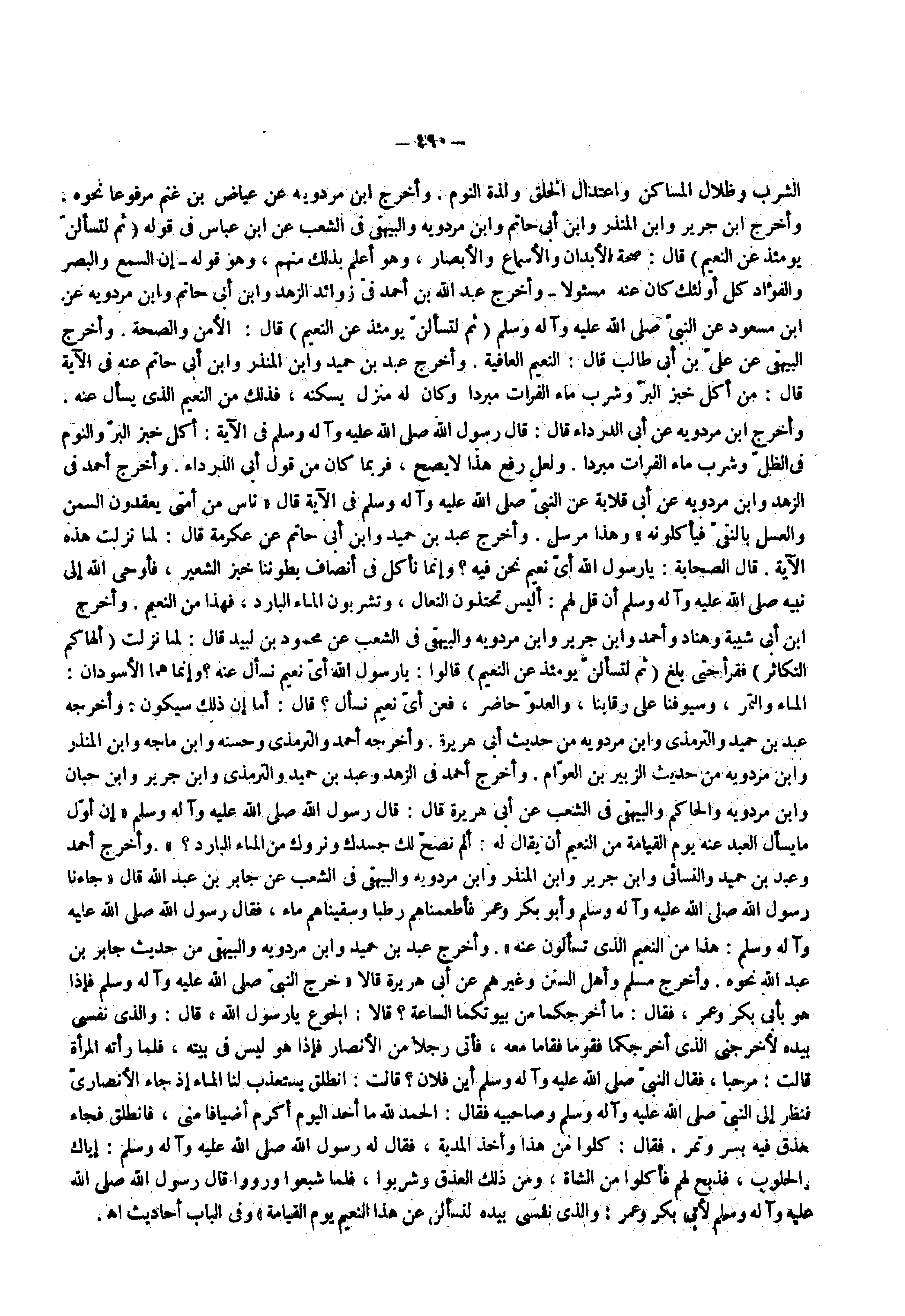 الشرب وظلال المساكن واعتدال الخلق ولذة النوم وأخرج ابن مردويه عن عياض بن غنم مرفوعا نحوه أخرج ابن جرير وابن المنذر وابن أبي حاتم وابن مردويه والبيهقي في الشعب عن ابن عباس في قوله ) ثم لتسألن يومئذ عن النعيم ( قال صحة الأبدان والأسماع والأبصار وهو اعلم بذلك منهم وهو قوله إن السمع والبصر والفؤاد كل أولئك كان عنه مسئولا وأخرج عبد الله بن أحمد في زوائد الزهد وابن أبي حاتم وابن مردويه عن ابن مسعود عن النبي صلى الله عليه واله وسلم ) ثم لتسألن يومئذ عن النعيم ( قال الأمن والصحة وأخرج البيهقي عن علي بن أبي طالب قال النعيم العافية وأخرج عبد بن حميد وابن المنذر وابن أبي حاتم عنه في الاية قال من أكل خبز البر وشرب ماء الفرات مبردا وكان له منزل يسكنه فذلك من النعيم الذي يسأل عنه وأخرج ابن مردويه عن أبي الدرداء قال قال رسول الله صلى الله عليه واله وسلم في الاية أكل خبز البر والنوم في الظل وشرب ماء الفرات مبردا ولعل رفع هذا لا يصح فربما كان من قول أبي الدرداء وأخرج أحمد في الزهد وابن مردويه عن أبي قلابة عن النبي ( صلى الله عليه وسلم ) في الآية قال ناس من أمتى يعقدون السمن والعسل بالنفي فيأكلونه وهذا مرسل وأخرج عبد بن حميد وابن أبي حاتم عن عكرمة قال لما نزلت هذه الاية قال الصحابة يا رسول الله أي نعيم نحن فيه وإنما نأكل في أنصاف بطوننا خبز الشعير فأوحى الله إلى نبيه صلى الله عليه واله وسلم أن قل لهم أليس تحتذون النعال وتشربون الماء البارد فهذا من النعيم وأخرج ابن أبي شيبة وهناد وأحمد وابن جرير وابن مردويه والبيهقي في الشعب عن محمود بن لبيد قال لما نزلت ) ألهاكم التكاثر ( فقرأ حتى بلغ ) ثم لتسألن يومئذ عن النعيم ( قالوا يا رسول الله أي نعيم نسأل عنه وإنما هما الأسودان الماء والتمر وسيوفنا على رقابنا والعدو حاضر فعن أي نعيم نسأل قال أما إن ذلك سيكون وأخرجه عبد بن حميد والترمذي وابن مردويه من حديث أبي هريرة وأخرجه أحمد والترمذي وحسنه وابن ماجه وابن المنذر وابن مردويه من حديث الزبير بن العوام وأخرج أحمد في الزهد وعبد بن حميد والترمذي وابن جرير وابن حبان وابن مردويه والحاكم والبيهقي في الشعب عن أبي هريرة قال قال رسول الله صلى الله عليه واله وسلم إن أول ما يسأل العبد عنه يوم القيامة من النعيم أن يقال له ألم نصح لك جسدك ونروك من الماء البارد وأخرج أحمد وعبد بن حميد والنسائي وابن جرير وابن المنذر وابن مردويه والبيهقي في الشعب عن جابر بن عبد الله قال جاءنا رسول الله صلى الله عليه واله وسلم وأبو بكر وعمر فأطعمناهم رطبا وسقيناهم ماء فقال رسول الله صلى الله عليه واله وسلم هذا من النعيم الذي تسألون عنه وأخرج عبد بن حميد وابن مردويه والبيهقي من حديث جابر بن عبد الله نحوه وأخرج مسلم وأهل السنن وغيرهم عن أبي هريرة قالا خرج النبي صلى الله عليه واله وسلم فإذا هو بأبي بكر وعمر فقال ما أخرجكما من بيوتكما الساعة قالا الجوع يا رسول الله قال والذي نفسي بيده لأخرجني الذي أخرجكما فقوما فقاما معه فأتى رجلا من الأنصار فإذا هو ليس في بيته فلما رأته المرأة قالت مرحبا فقال النبي صلى الله عليه واله وسلم أين فلان قالت انطلق يستعذب لنا الماء إذ جاء الأنصاري فنظر إلى النبي صلى الله عليه واله وسلم وصاحبيه فقال الحمد لله ما أحد اليوم أكرم أضيافا مني فانطلق فجاء بعذق فيه بسر وتمر فقال كلوا من هذا وأخذ المديه فقال له رسول الله صلى الله عليه واله وسلم إياك والحلوب فذبح لهم فأكلوا من الشاة ومن ذلك العذق وشربوا فلما شبعوا ورووا قال رسول الله صلى الله عليه واله وسلم لأبي بكر وعمر والذي نفسي بيده لنسألن عن هذا النعيم يوم القيامة وفي الباب أحاديث ا ه