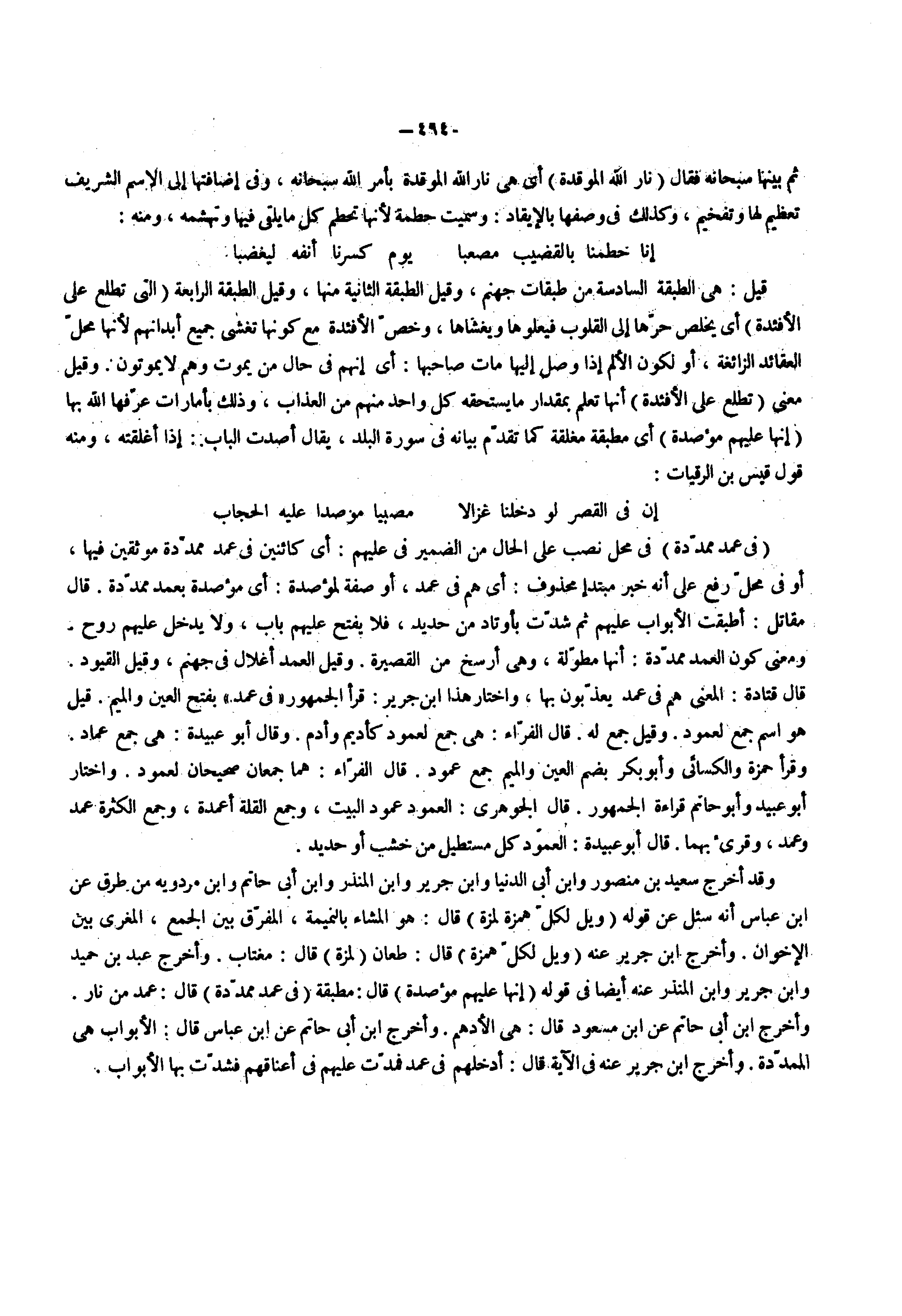 وقد أخرج سعيد بن منصور وابن أبي الدنيا وابن جرير وابن المنذر وابن أبي حاتم وابن مردويه من طرق عن ابن عباس أنه سئل عن قوله ) ويل لكل همزة لمزة ( قال هو المشاء بالنميمة المفرق بين الجمع المغرى بين الإخوان وأخرج ابن جرير عنه ) ويل لكل همزة ( قال طعان ) لمزة ( قال مغتاب وأخرج عبد بن حميد وابن جرير وابن المنذر عنه أيضا في قوله ) إنها عليهم مؤصدة ( قال مطبقة ) في عمد ممددة ( قال عمد من نار وأخرج ابن أبي حاتم عن ابن مسعود قال هي الأدهم وأخرج ابن أبي حاتم عن ابن عباس قال الأبواب هي الممدة وأخرج ابن جرير عنه في الاية قال أدخلهم في عمد فمدت عليهم في أعناقهم فشدت بها الأبواب