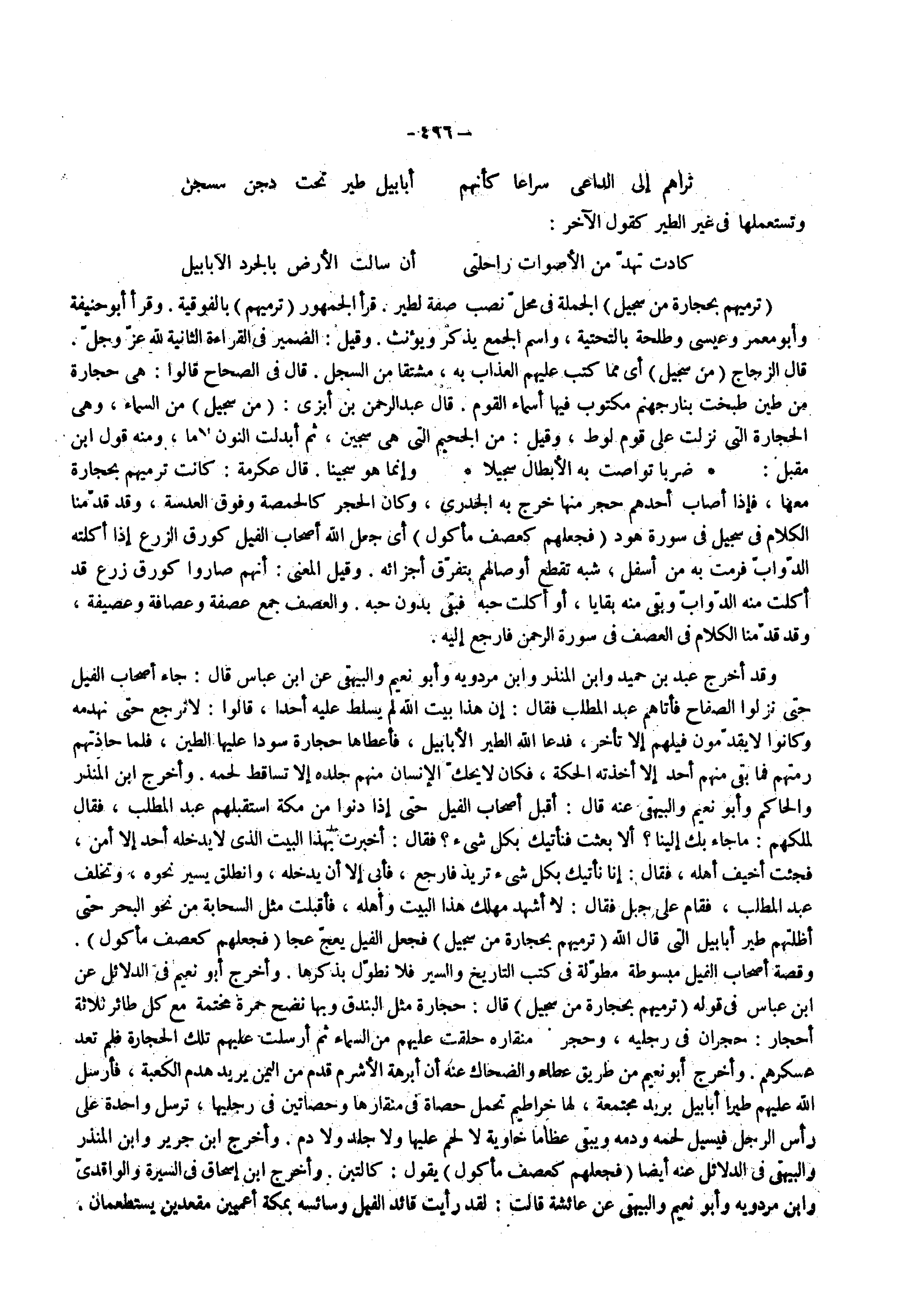 وقد أخرج عبد بن حميد وابن المنذر وابن مردويه وأبو نعيم والبيهقي عن ابن عباس قال جاء إصحاب الفيل حتى نزلوا الصفاح فأتاهم عبد المطلب فقال إن هذا بيت الله لم يسلط عليه أحدا قالوا لا نرجع حتى نهدمه وكانوا لا يقدمون فيلهم إلا تأخر فدعا الله الطير الأبابيل فأعطاها حجارة سودا عليها الطين فلما حاذتهم رمتهم فما بقى منهم أحد ألاخذته الحكة فكان لا يحك الإنسان منهم جلده إلا تساقط لحمه وأخرج ابن المنذر والحاكم وأبو نعيم والبيهقي عنه قال أقبل أصحاب الفيل حتى إذا دنوا من مكة استقبلهم عبد المطلب فقال لملكهم ما جاء بك إلينا إلا بعثت فنأتيك بكل شيء فقال أخبرت بهذا البيت الذي لا يدخله أحد إلا أمن فجئت أخيف أهله فقال إنا نأتيك بكل شيء تريد فارجع فأبى إلا أن يدخله وانطلق يسير نحوه وتخلف عبد المطلب فقام على جبل فقال لا أشهد مهلك هذا البيت وأهله فأقبلت مثل السحابة من نحو البحر حتى أظلتهم طير أبابيل قال الله ) ترميهم بحجارة من سجيل ( فجعل الفيل يعج عجا ) فجعلهم كعصف مأكول ( وقصة أصحاب الفيل مبسوطة مطولة في كتب التاريخ والسير فلا نطول بذكرها وأخرج أبو نعيم في الدلائل عن ابن عباس في قوله ) ترميهم بحجارة من سجيل ( قال حجارة مثل البندق وبها نضح حمرة مختمة مع كل طائر ثلاثة أحجار حجران في رجليه وحجر في منقاره حلقت عليهم من السماء ثم أرسلت عليهم تلك الحجارة فلم تعد عسكرهم وأخرج أبو نعيم من طريق عطاء والضحاك عنه أن أبرهة الأشرم قدم من اليمن يريد هدم الكعبة فأرسل الله عليهم طيرا أبابيل بريد مجتمعه لها خراطيم تحمل حصاة في منقارها وحصاتين في رجليها ترسل واحدة على رأس الرجل فيسيل لحمه ودمه ويبقى عظاما خاوية لا لحم عليها ولا جلد ولا دم وأخرج ابن جرير وابن المنذر والبيهقي في الدلائل عنه أيضا ) فجعلهم كعصف مأكول ( يقول كالتبن وأخرج ابن إسحاق في السيرة والواقدي وابن مردويه وأبو نعيم والبيهقي عن عائشة قالت لقد رأيت قائد الفيل وسائسه بمكة أعميين مقعدين يستطعمان